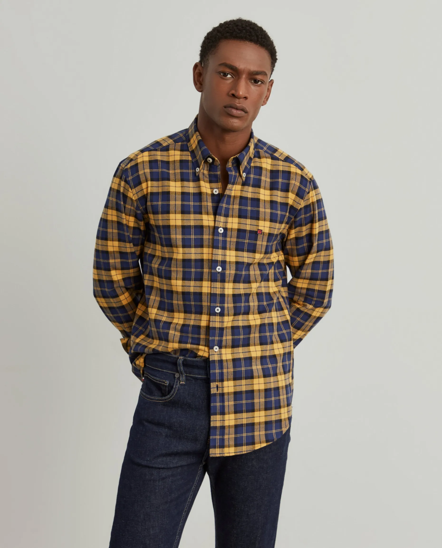 Camisa Slim Fit. Colarinho com dois botões. Bordado personalizado no peito. Botões personalizados. Fita decorativa no decote costas