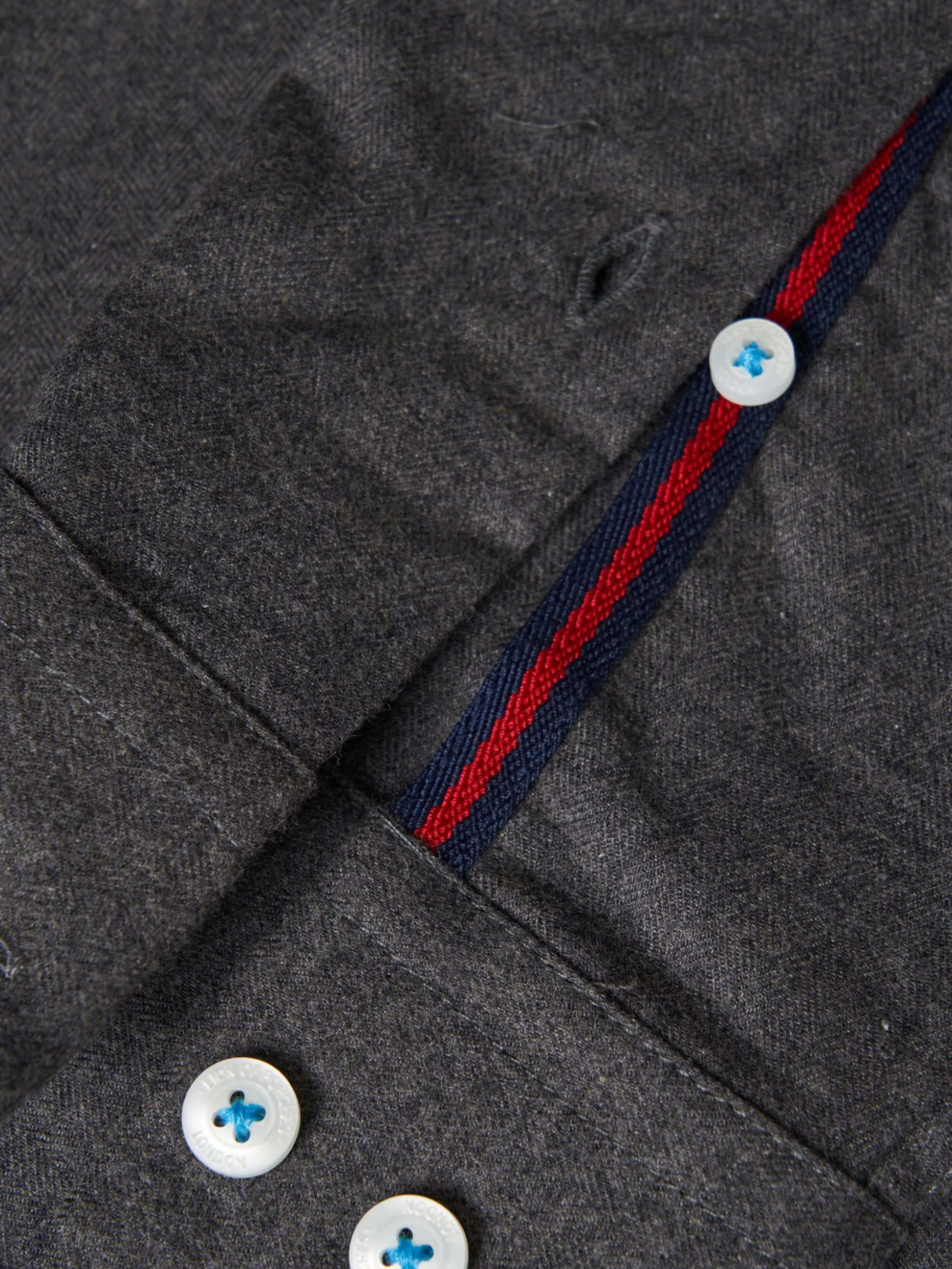 Camisa Slim Fit com carcela de polo. Colarinho com dois botões. Bordado personalizado no peito. Presilhas ajustáveis nas mangas. Fita decorativa nas carcelas dos punhos. Botões personalizados. Fita decorativa no decote costas.