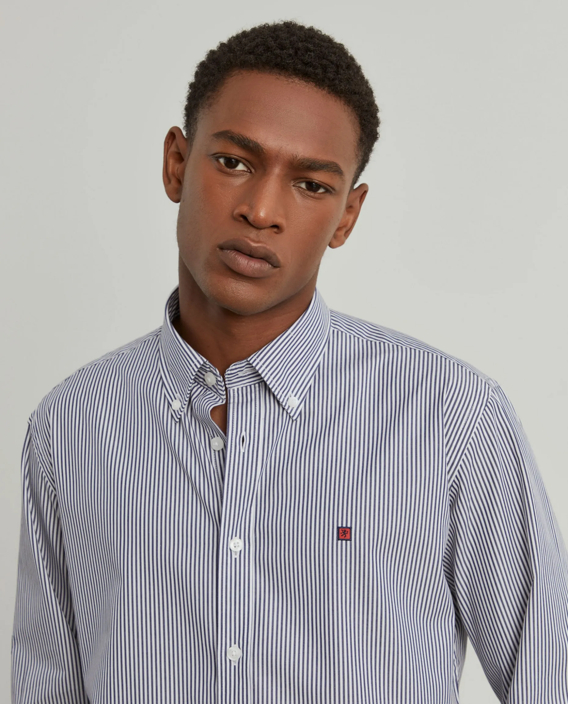 Camisa Slim Fit em tecido com padrão de riscas. Colarinho com dois botões. Bordado personalizado no peito. Botões personalizados.