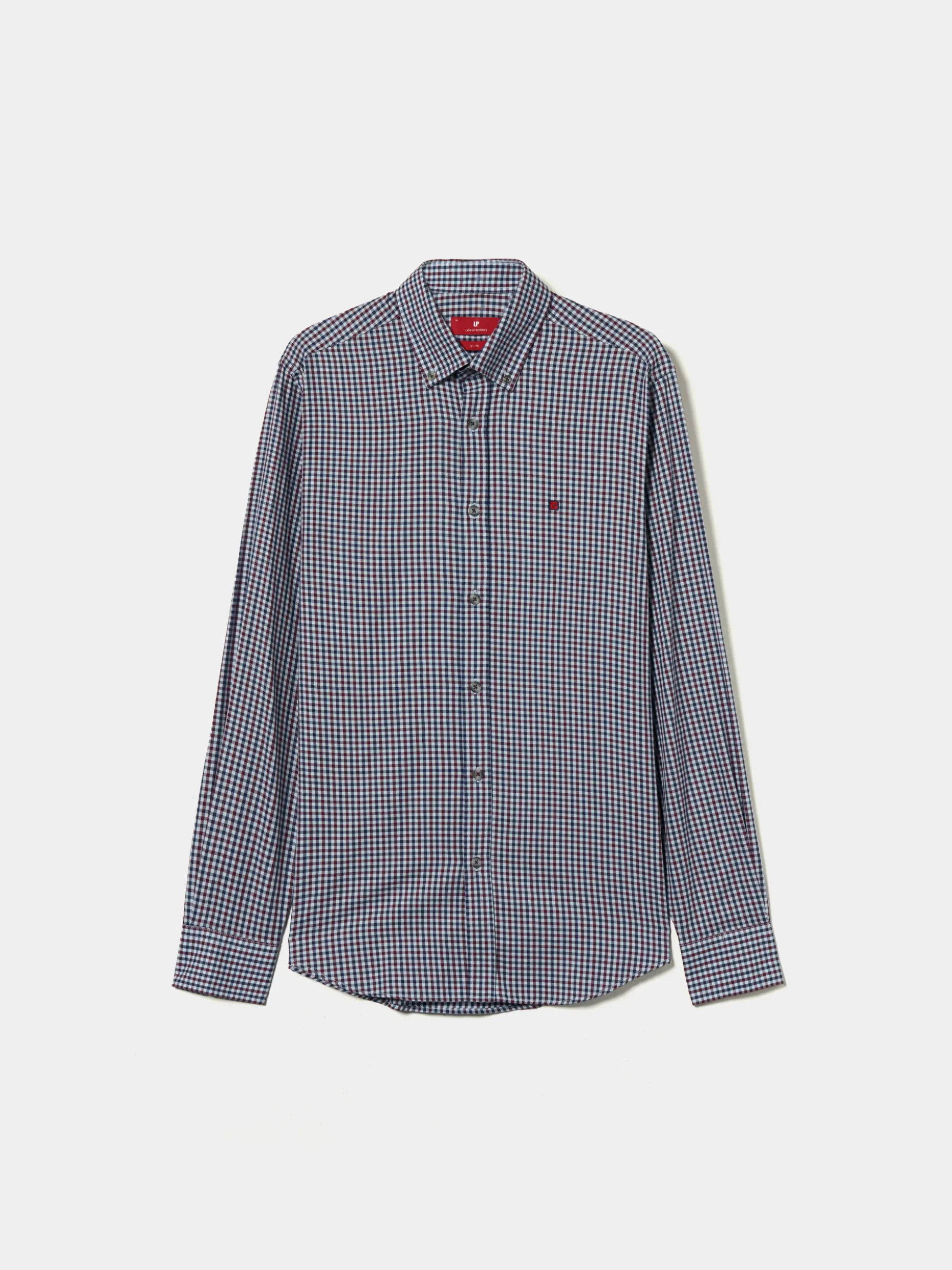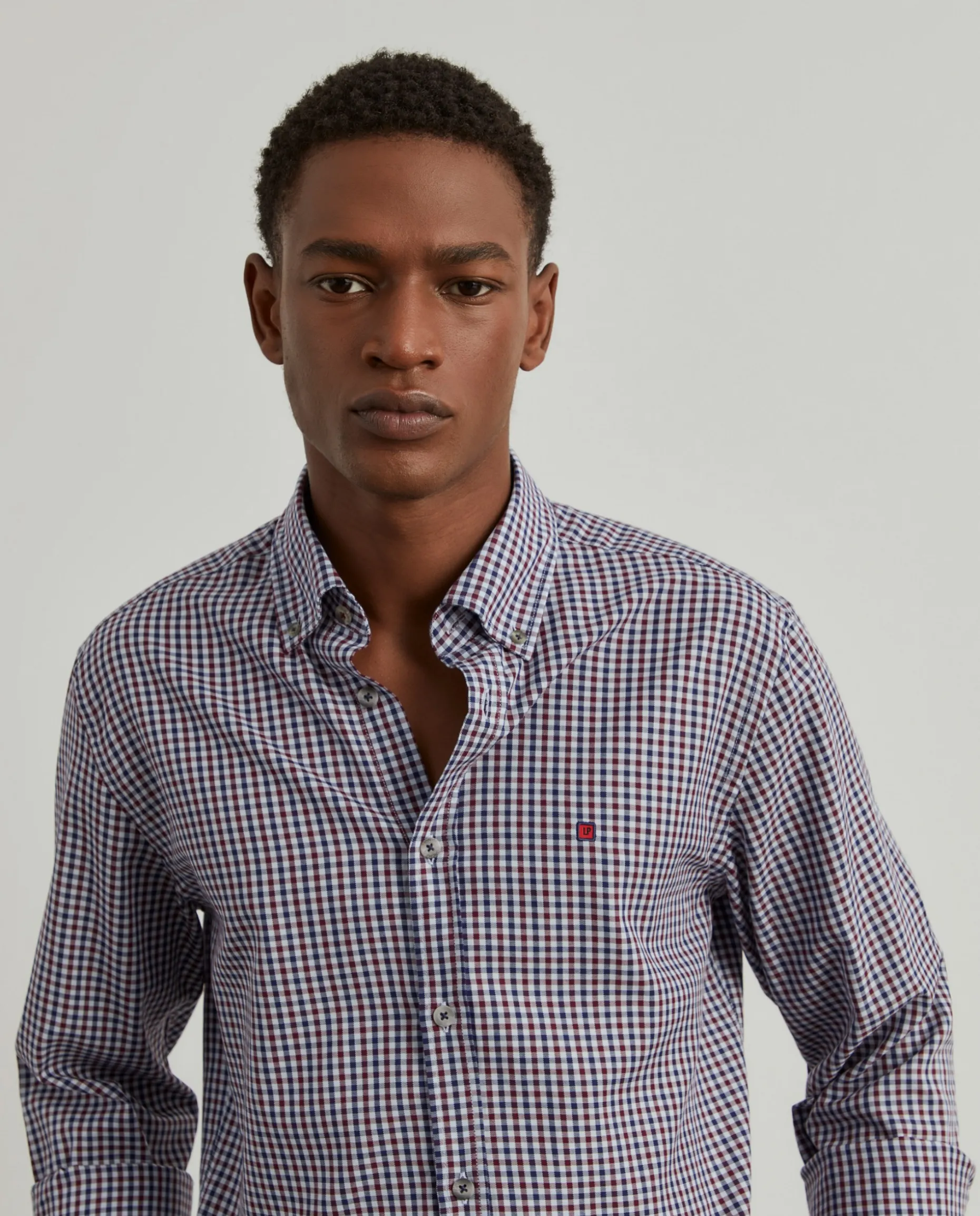 Um clássico, esta camisa slim fit de padrão axadrezada é confecionada em 100% de algodão. Tem um colarinho com dois botões e um bordado personalizado no peito.