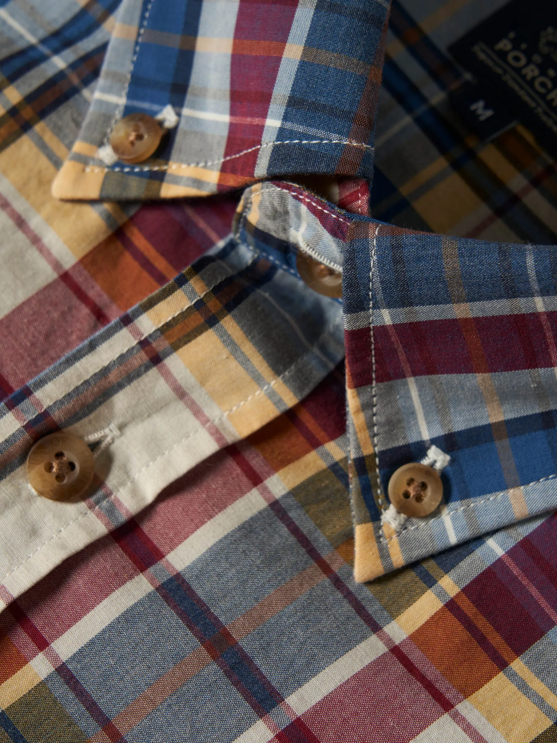 Camisa Slim Fit. Colarinho com dois botões. Tecido com padrão de xadrez. Bordado personalizado no peito. Botões personalizados.