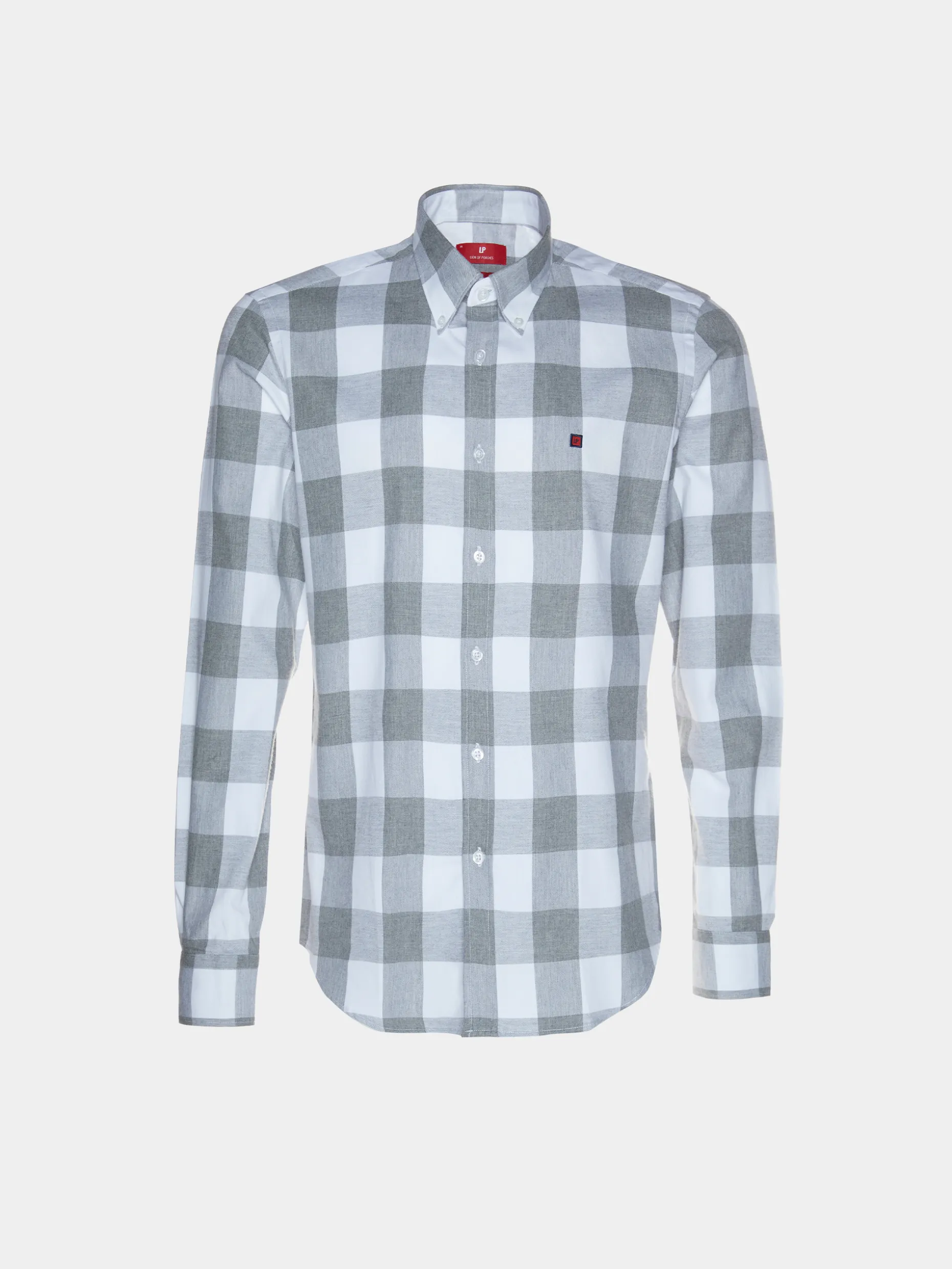 Camisa Slim Fit. Colarinho com dois botões. Bordado personalizado no peito. Botões personalizados. Fita decorativa no decote costas.