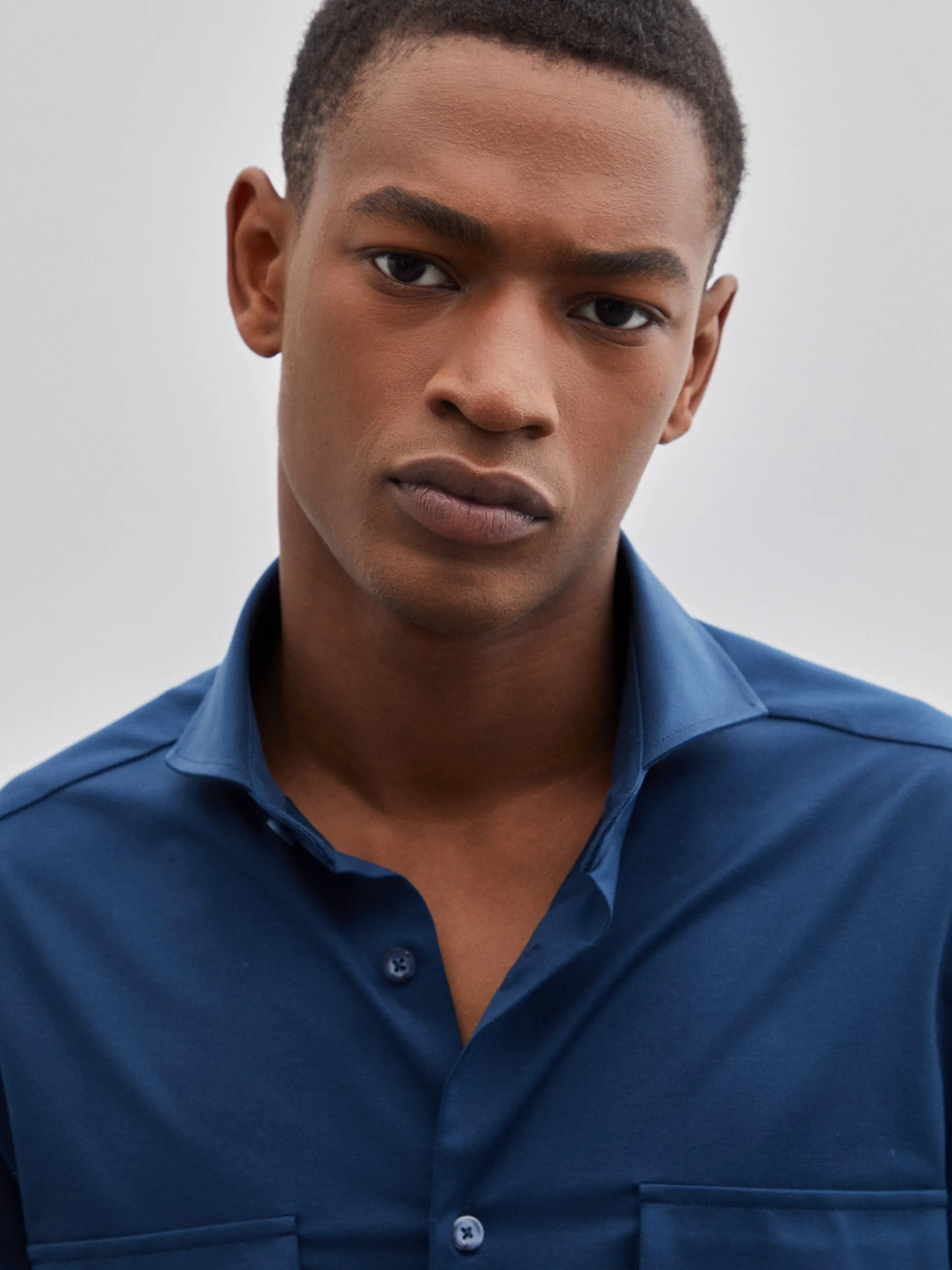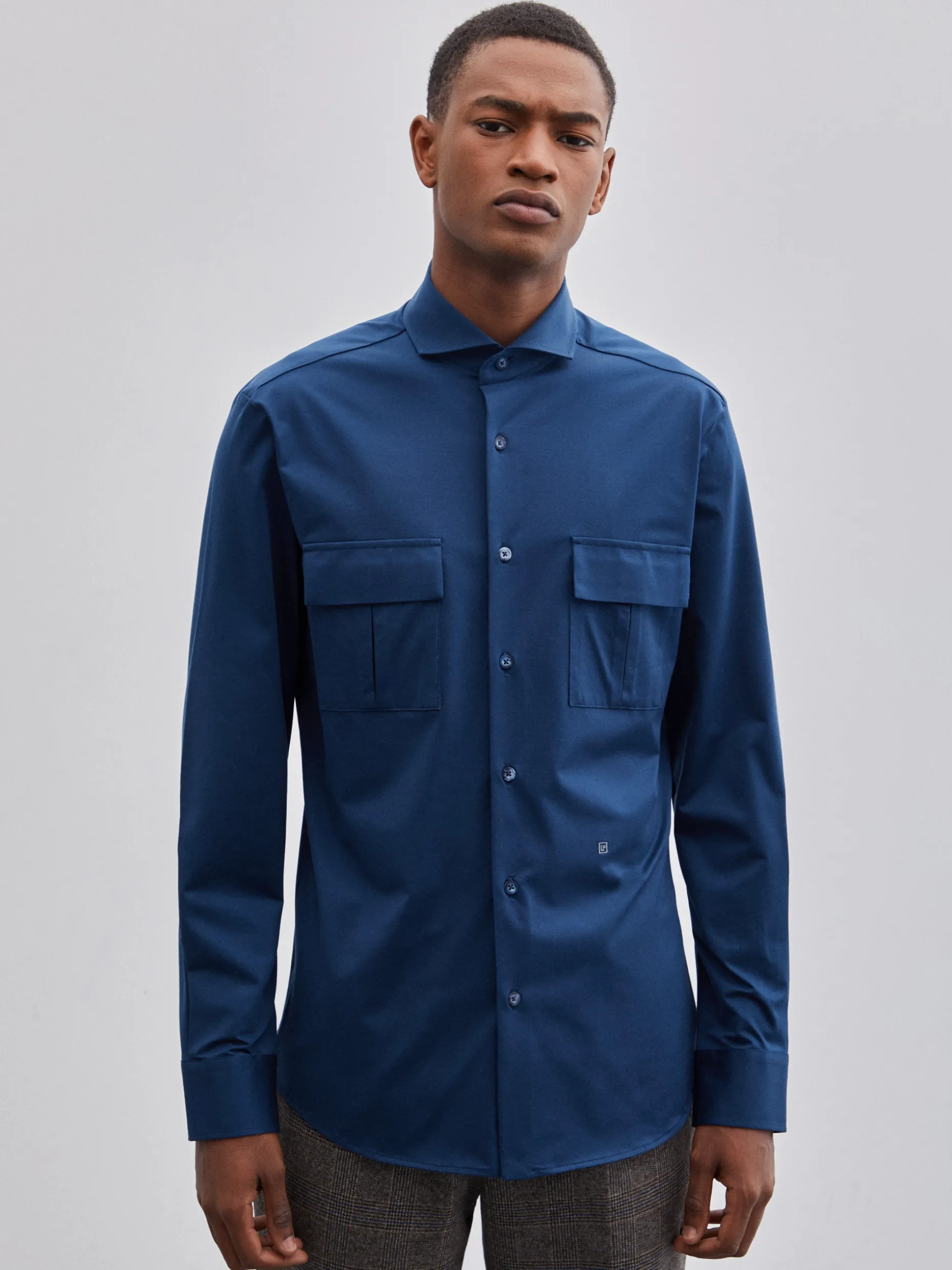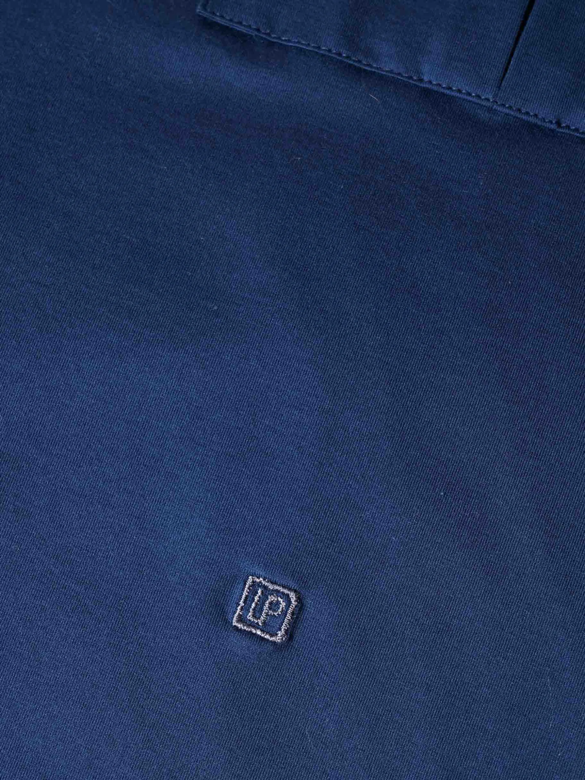 Camisa Slim Fit. Dois bolsos de chapa com prega e pala no peito. Bordado personalizado na frente. Botões personalizados.