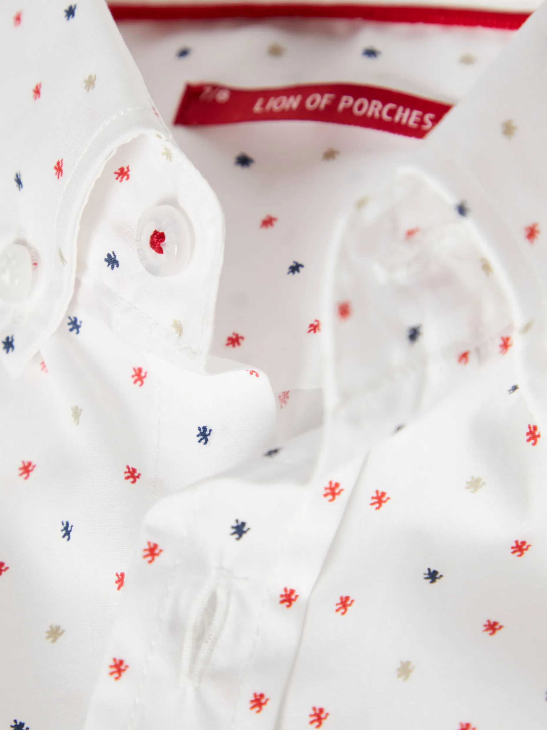Para um look leve e divertido, vista os miúdos com esta camisa de manga comprida, slim fit, com micro padrão de leões colorido. Aperta com botões, não só na frente, mas também no colarinho e botões. É confecionada, na totalidade, em algodão para maior conforto e suavidade.