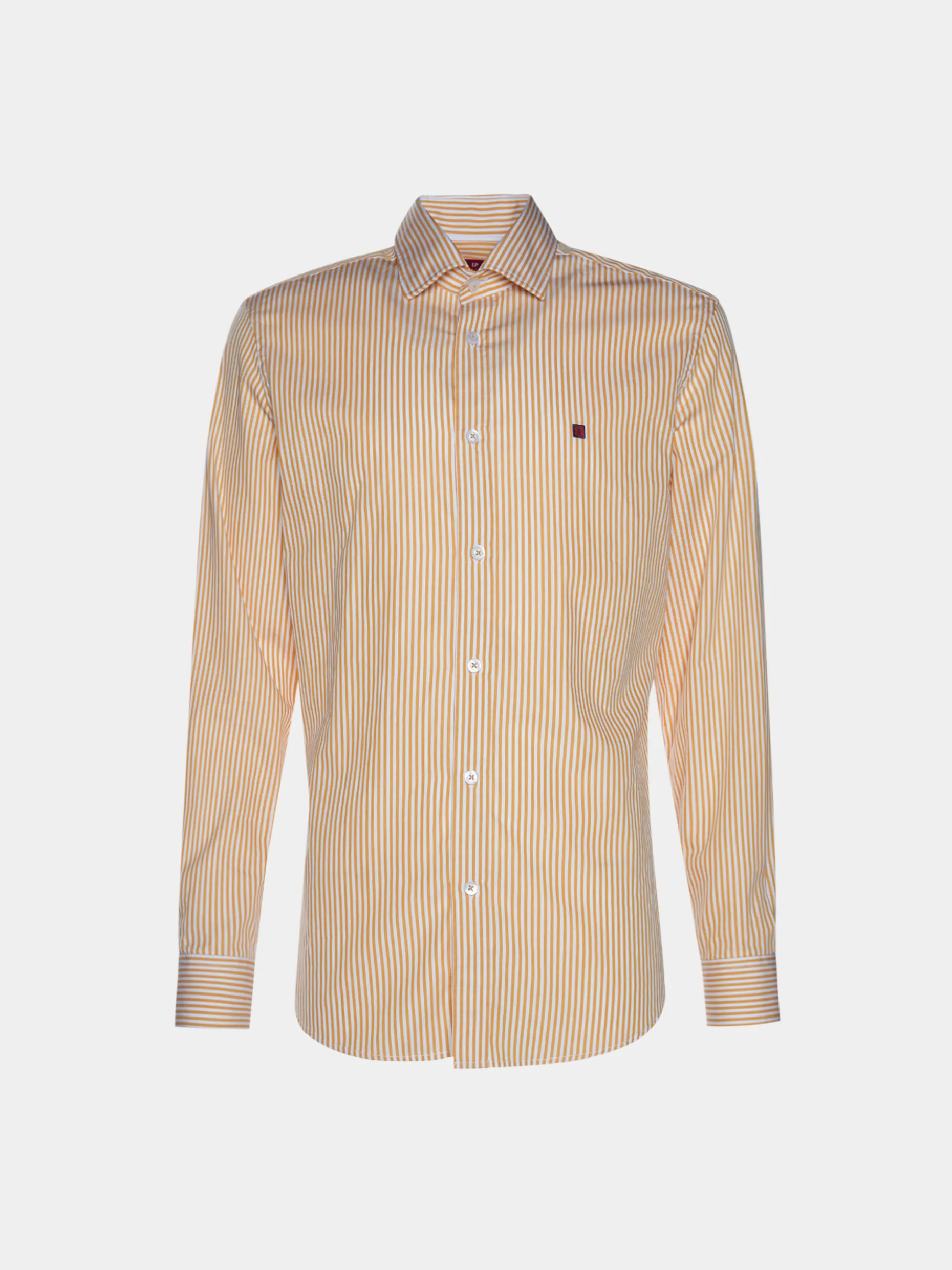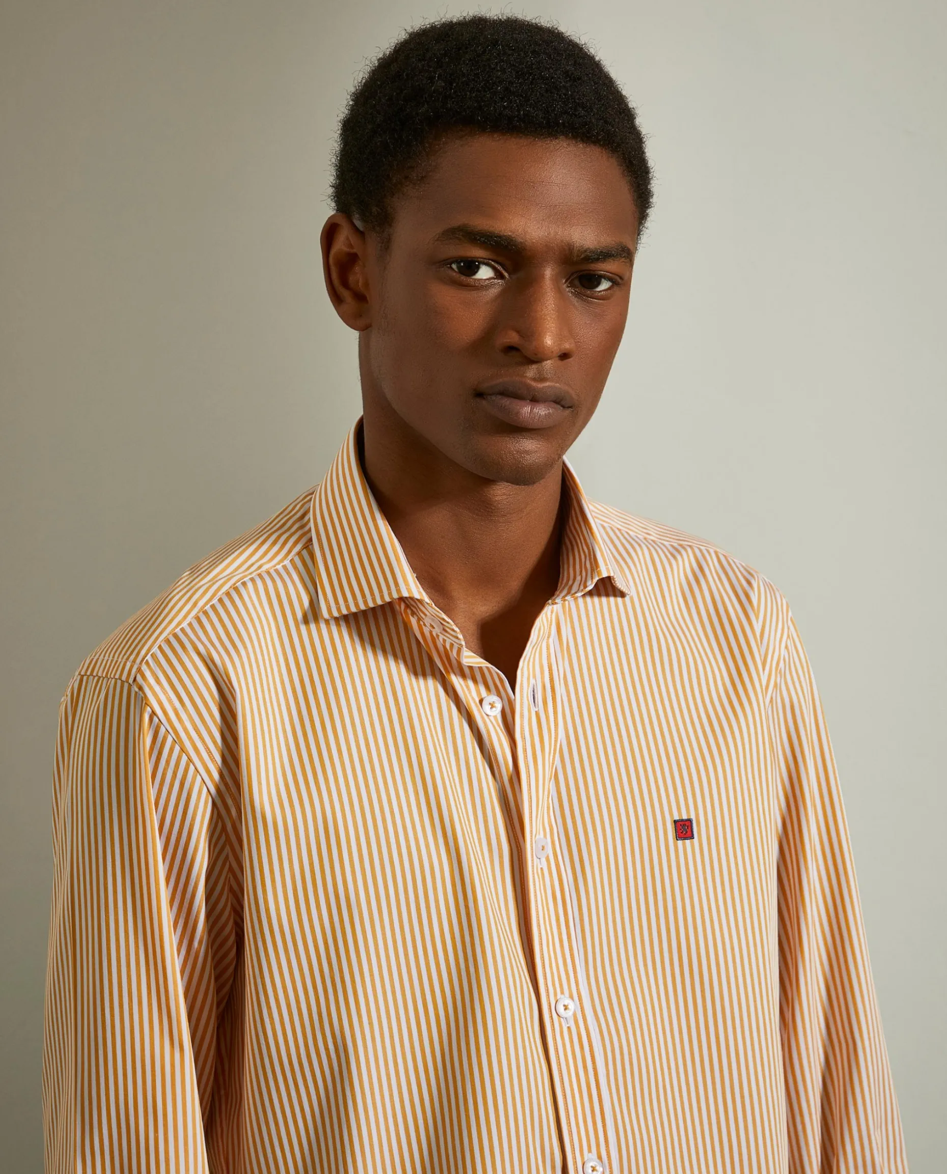 Camisa slim fit. Tecido com padrão de riscas. Colarinho “cutaway”. Branding Lion of Porches bordado no peito. Botões personalizados.