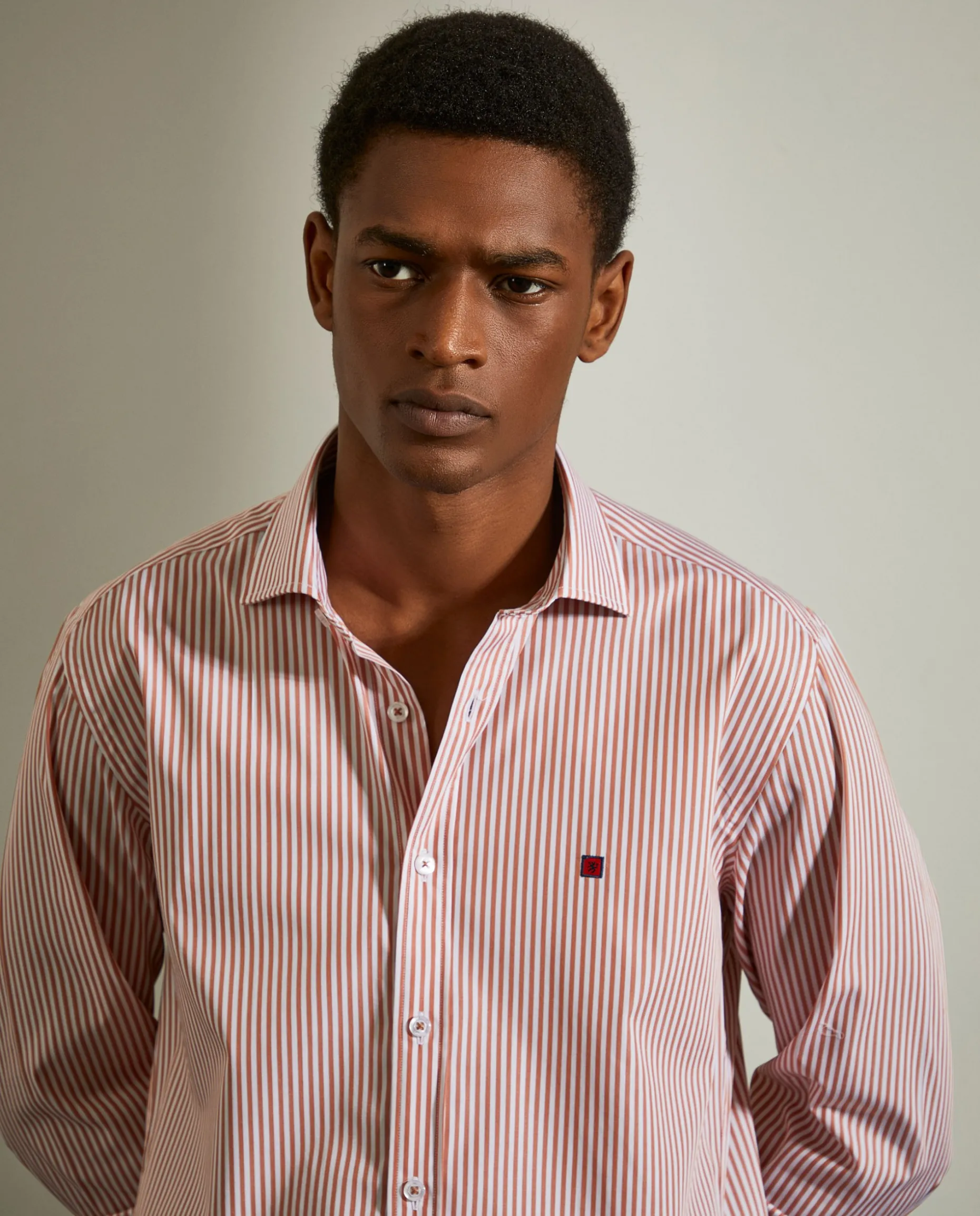 Camisa slim fit. Tecido com padrão de riscas. Colarinho “cutaway”. Branding Lion of Porches bordado no peito. Botões personalizados.