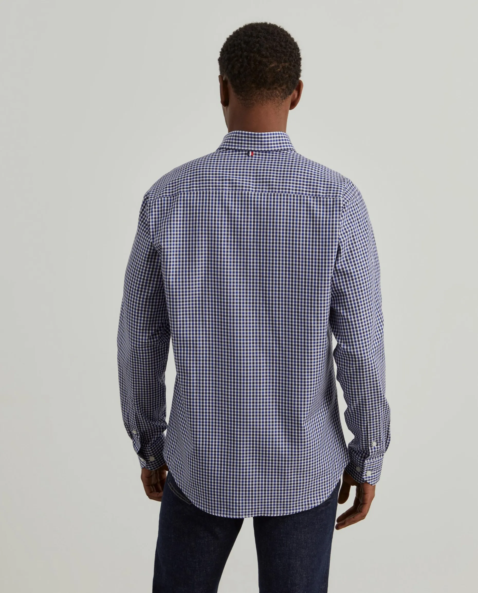Camisa slim fit xadrez confecionado em popeline 100% algodão. Colarinho com dois botões. Bordado personalizado no peito. Botões personalizados.