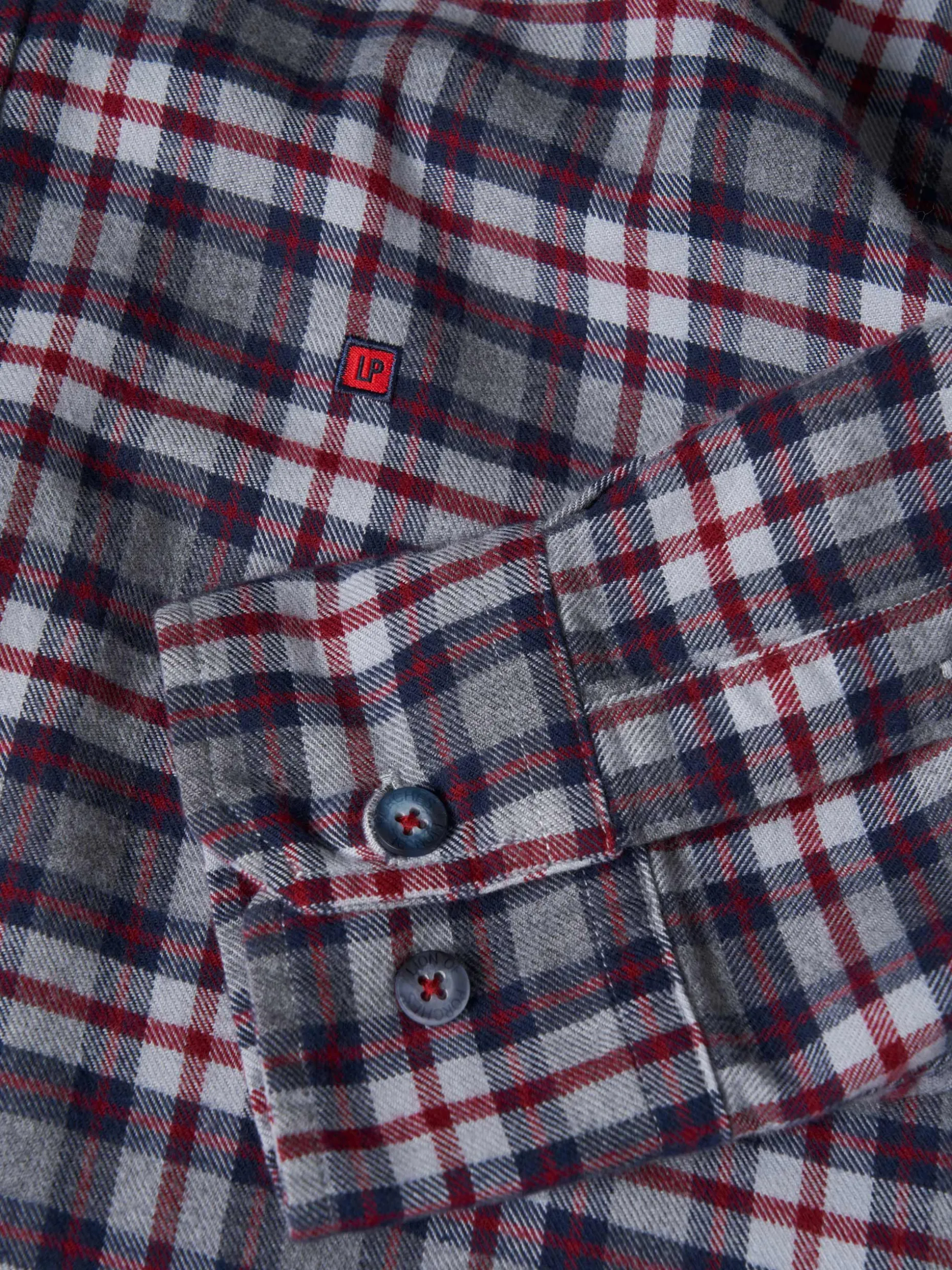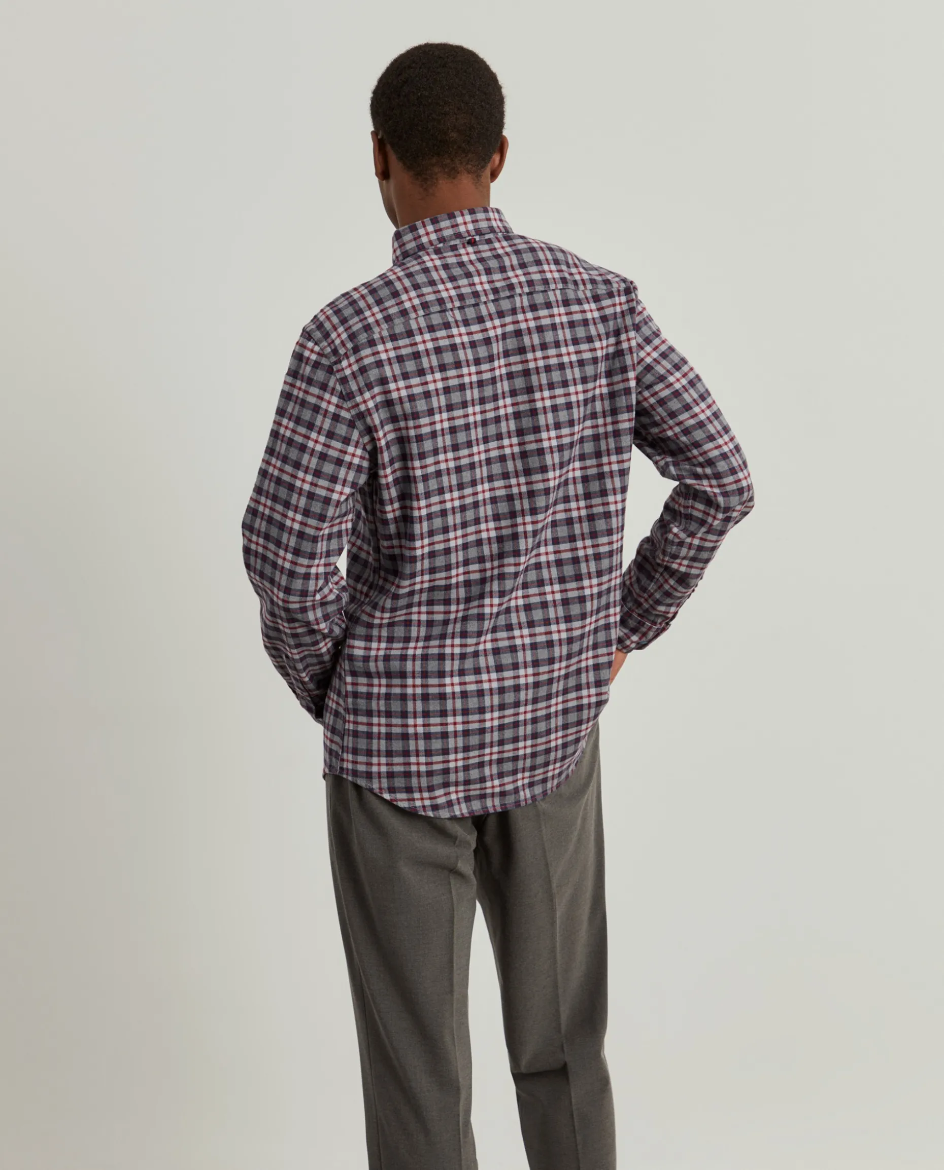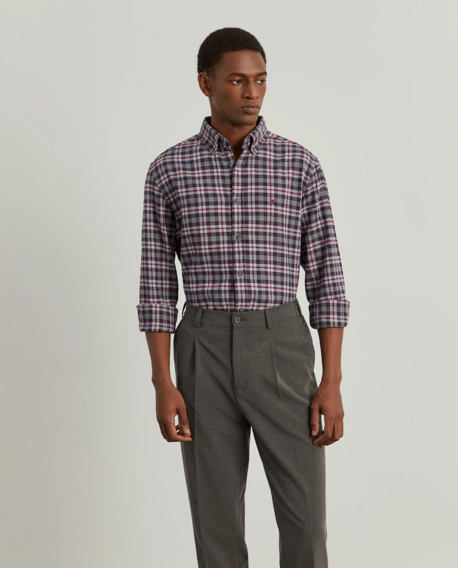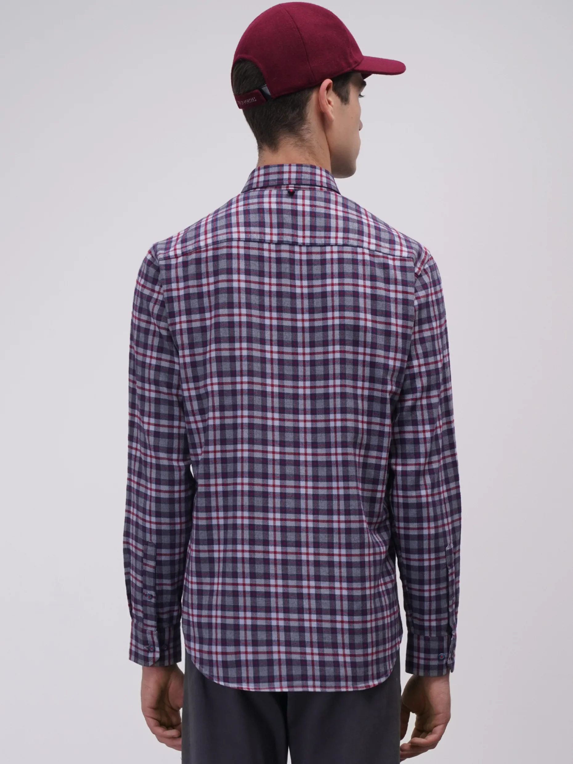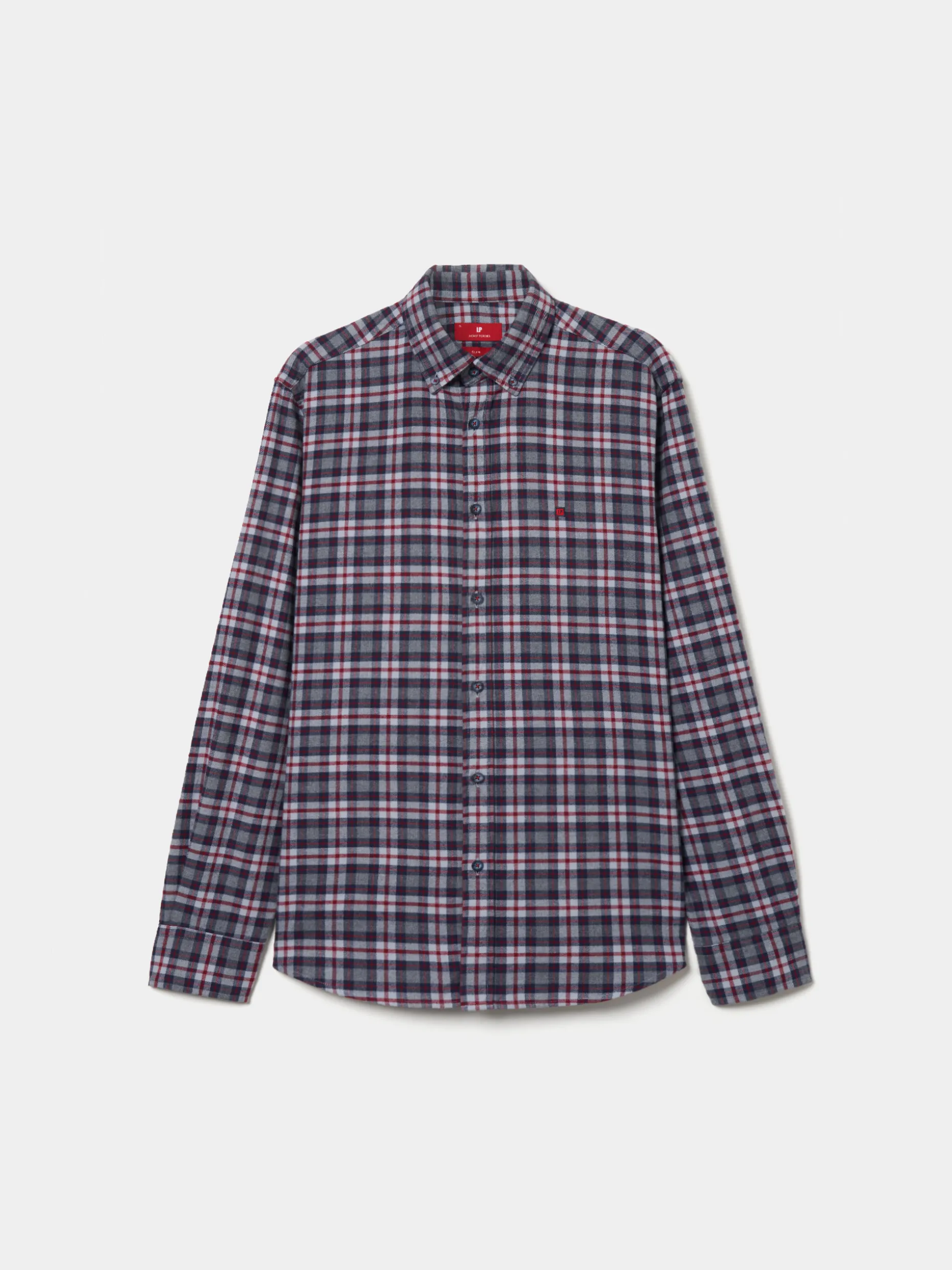 Camisa slim fit. Confecionada em 100% algodão. Com padrão xadrez. Colarinho com dois botões. Bordado no peito. Aperta com botões personalizados.