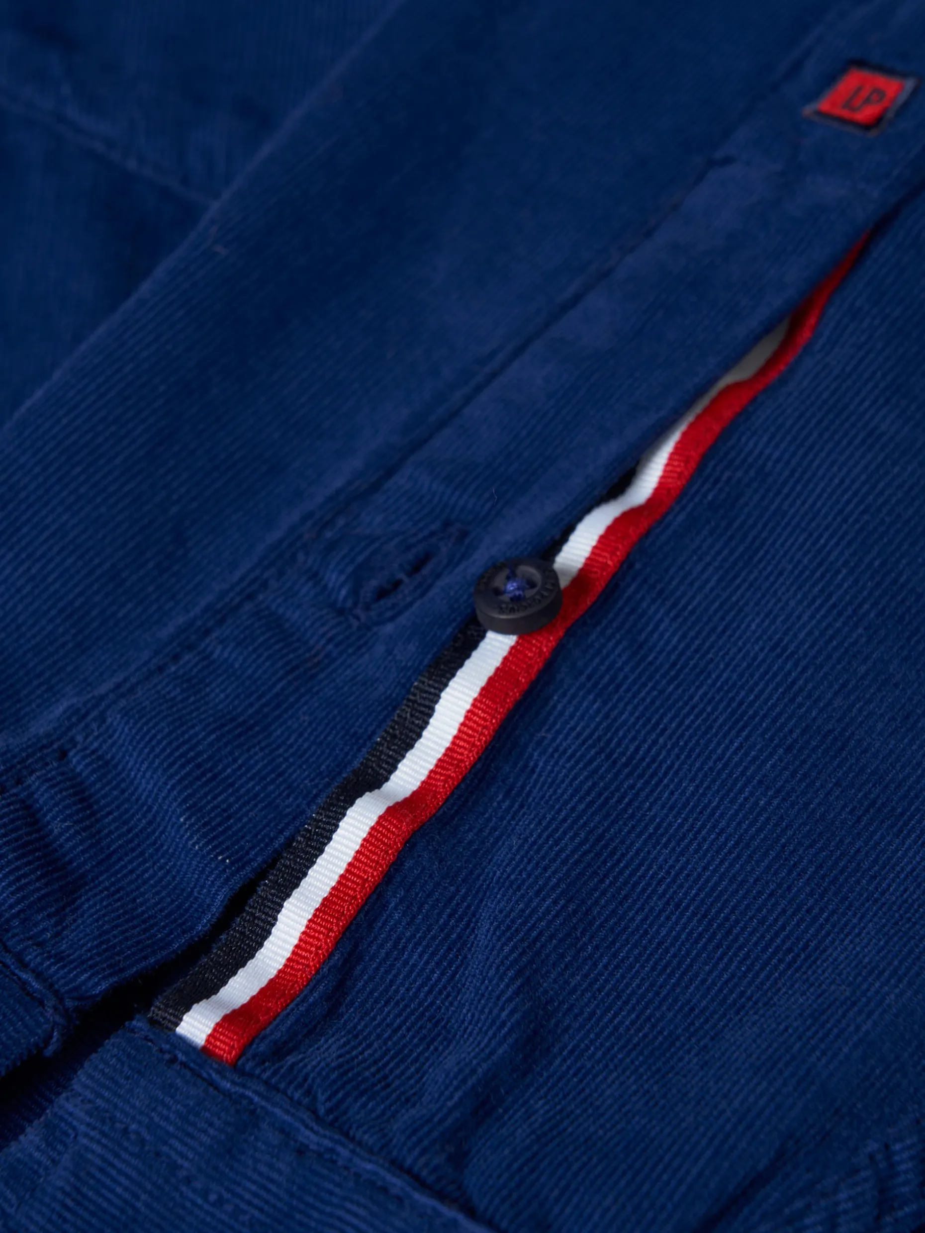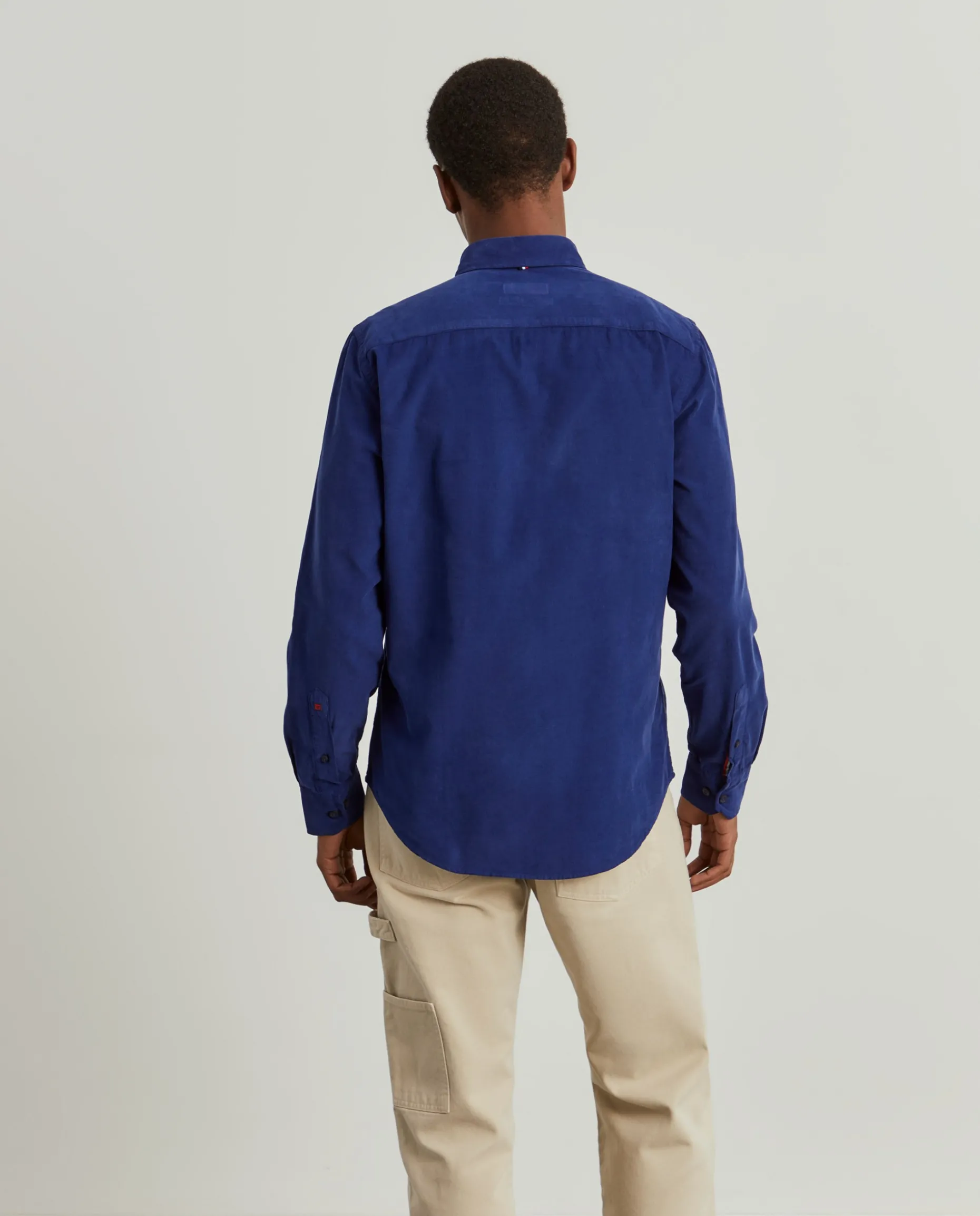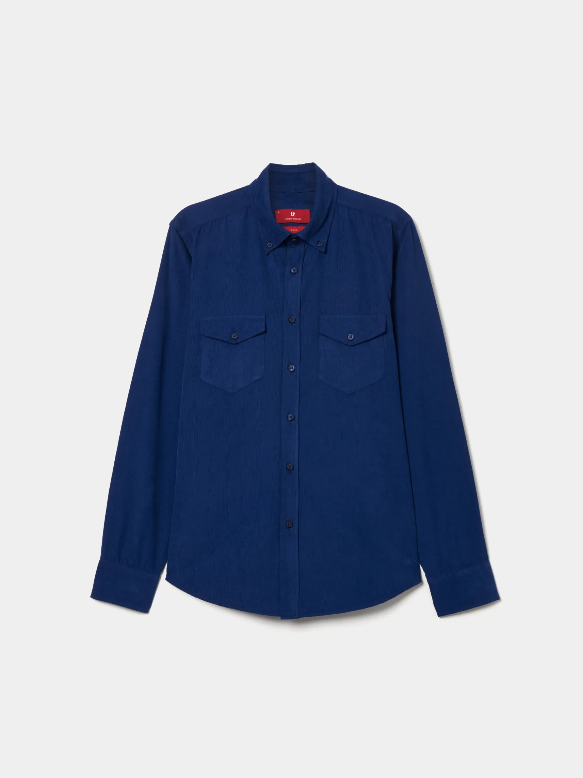 Camisa slim fit confecionada em bombazine. Dois bolsos no peito. Colarinho de dois botões. Bordado na carcela do punho. Aperta botões personalizados.