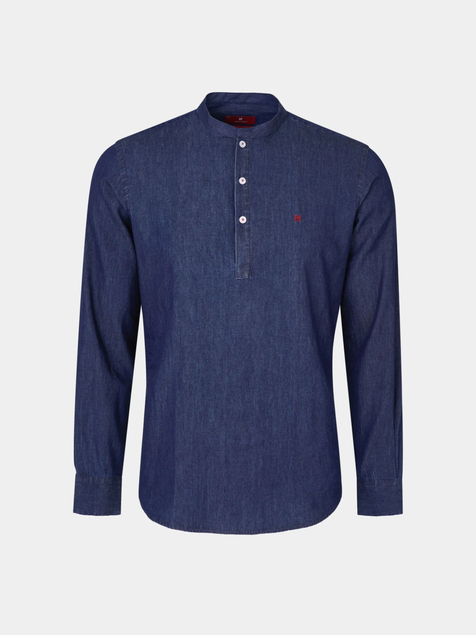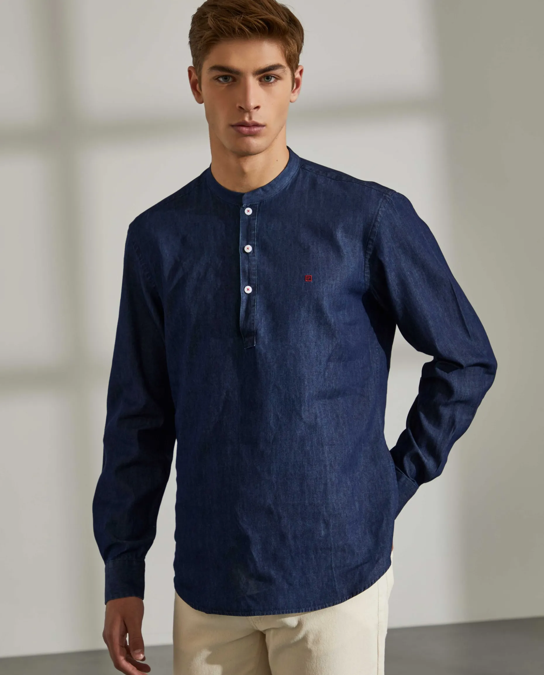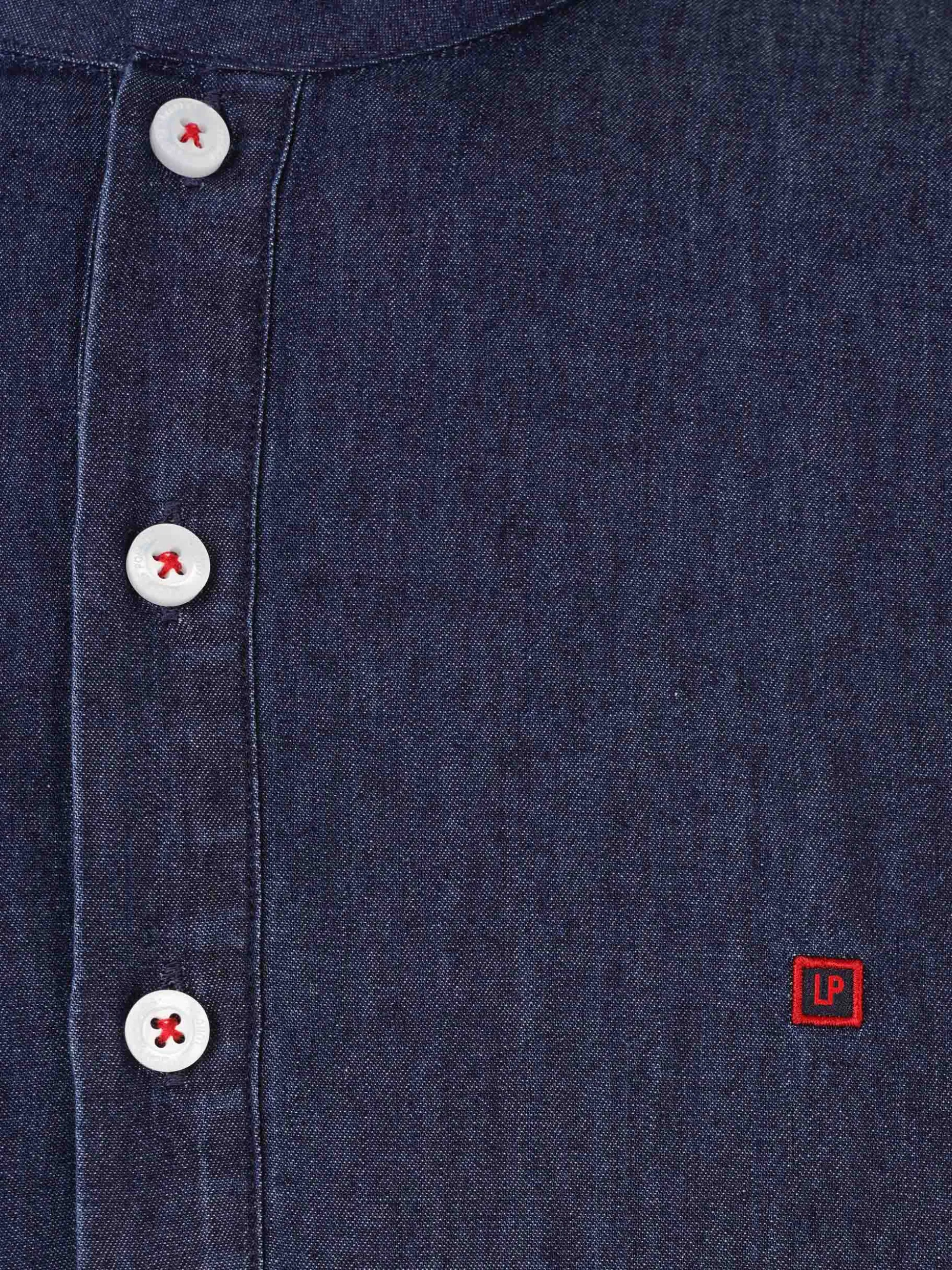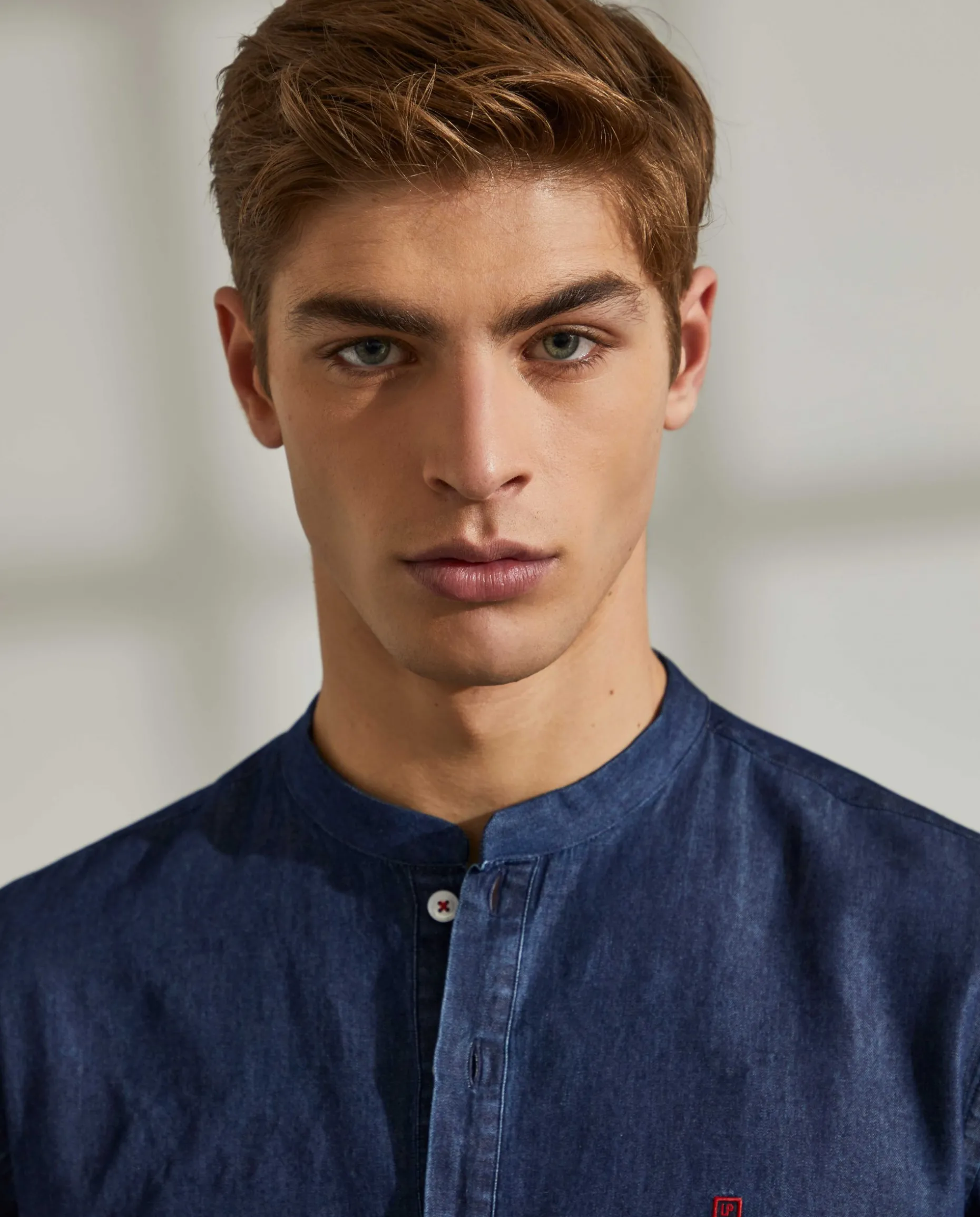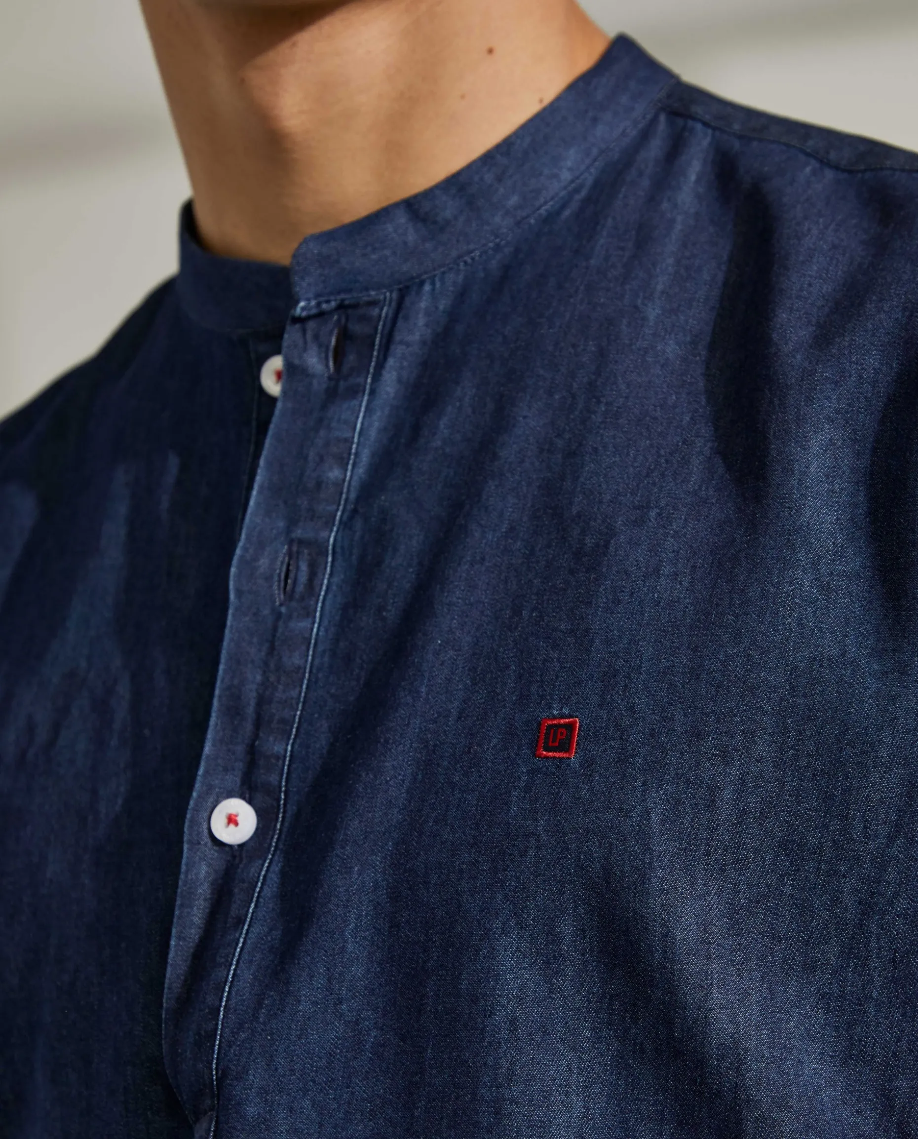 Camisa Slim Fit- Confecionada em denim 100% algodão. Carcela de polo. Bordado personalizado no peito. Aperta com otões personalizados.