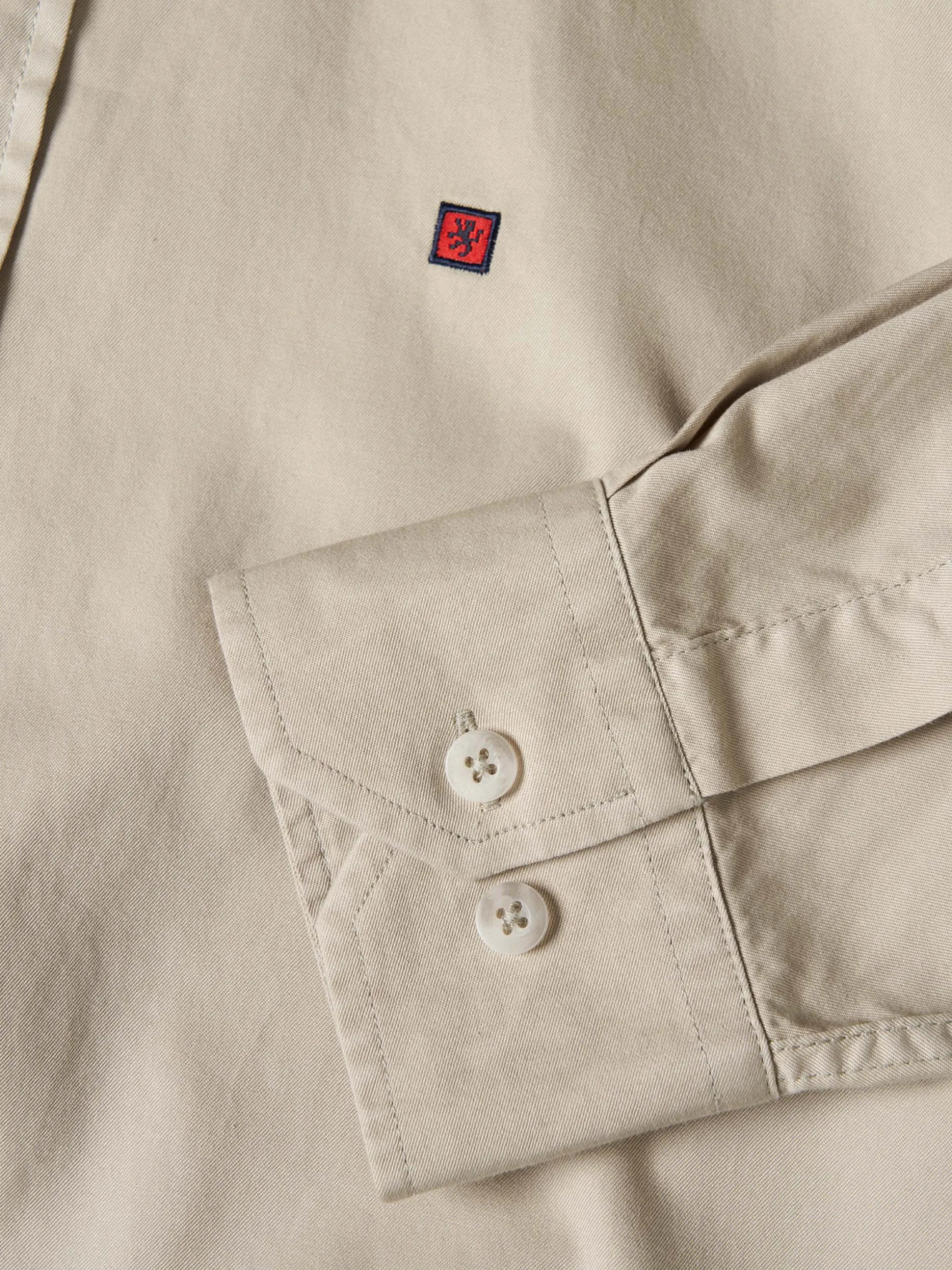 Camisa Slim Fit em sarjinha. Colarinho “cutaway”. Bordado personalizado no peito. Botões personalizados.