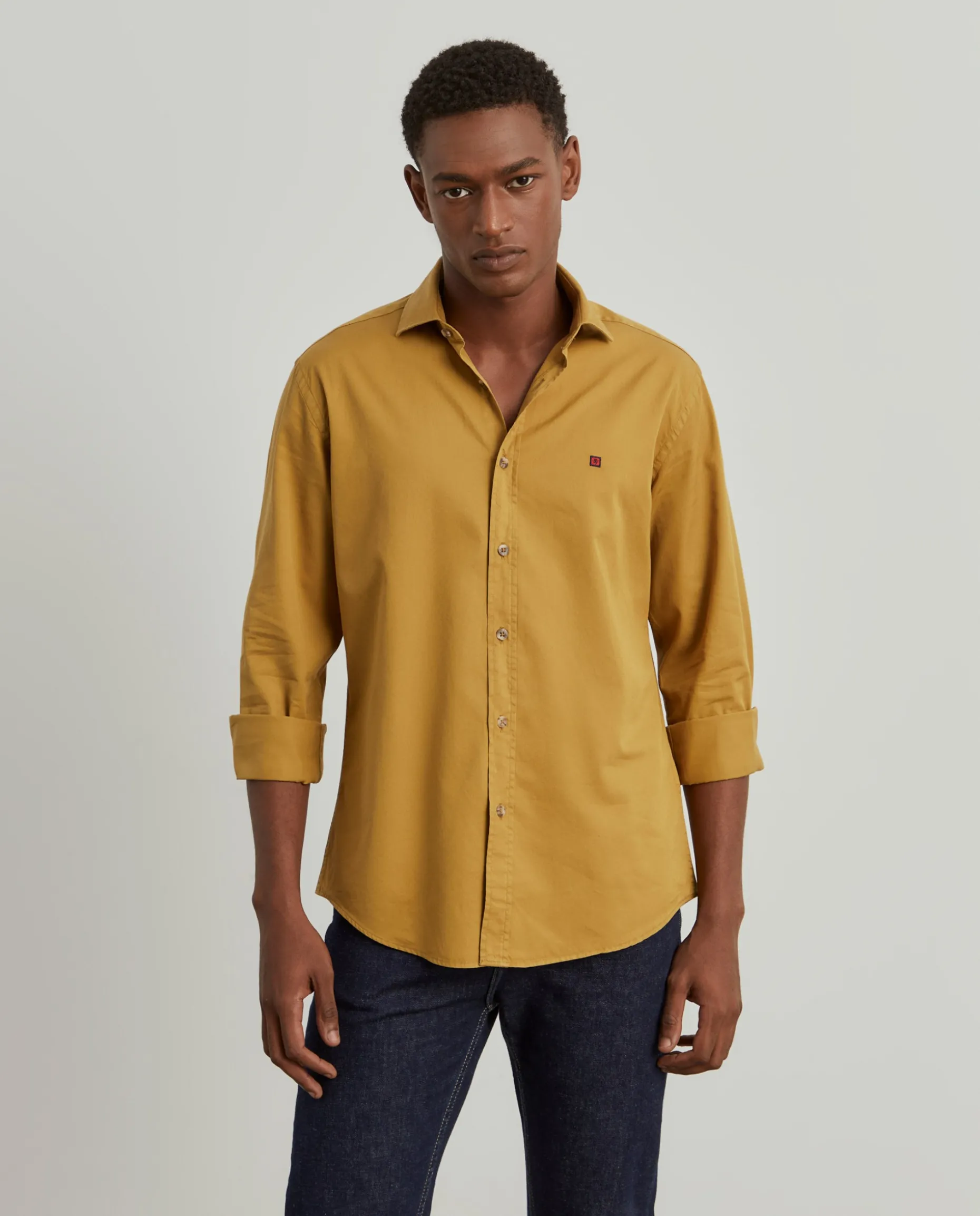 Camisa Slim Fit em sarjinha. Colarinho “cutaway”. Bordado personalizado no peito. Botões personalizados.