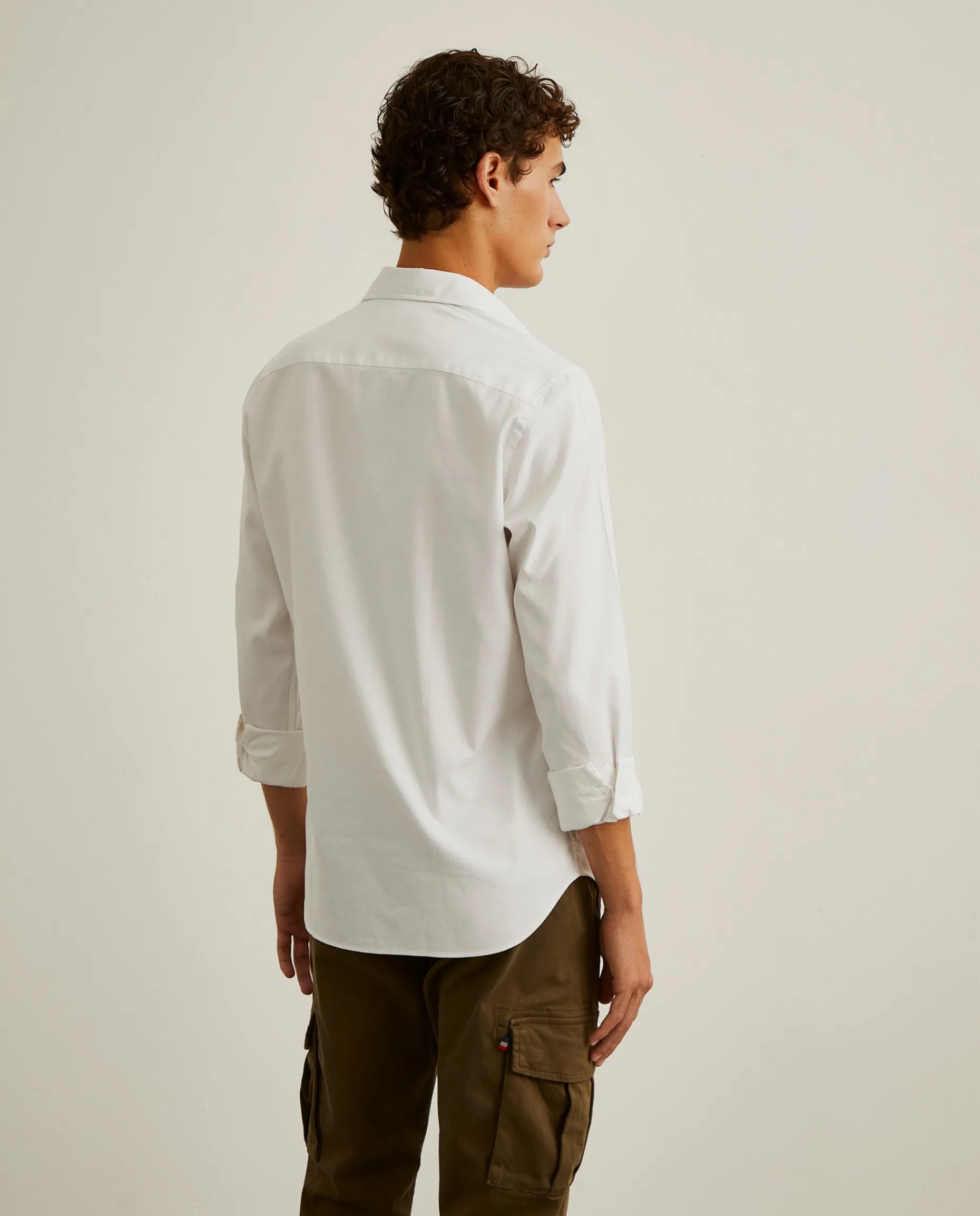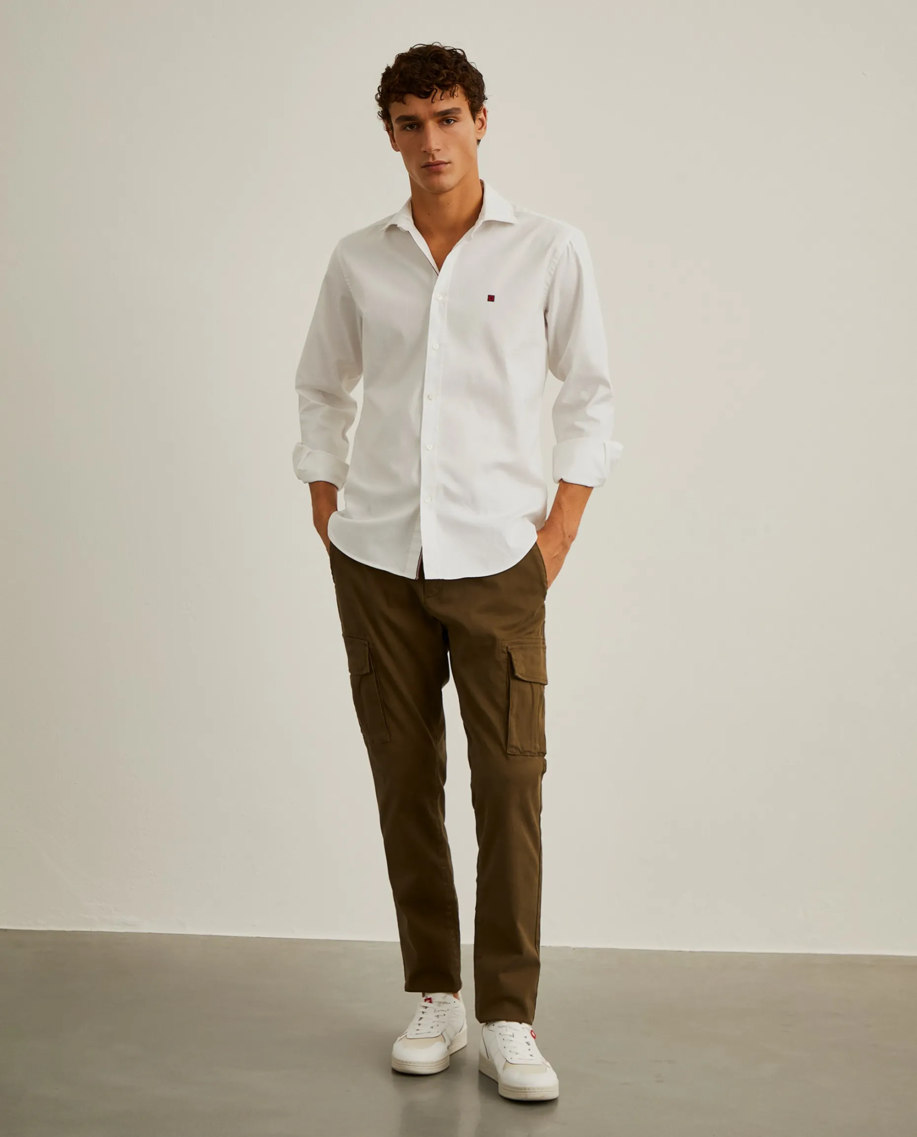 Camisa Slim Fit em tecido oxford. Colarinho “cutaway”. Bordado personalizado no peito. Botões personalizados.