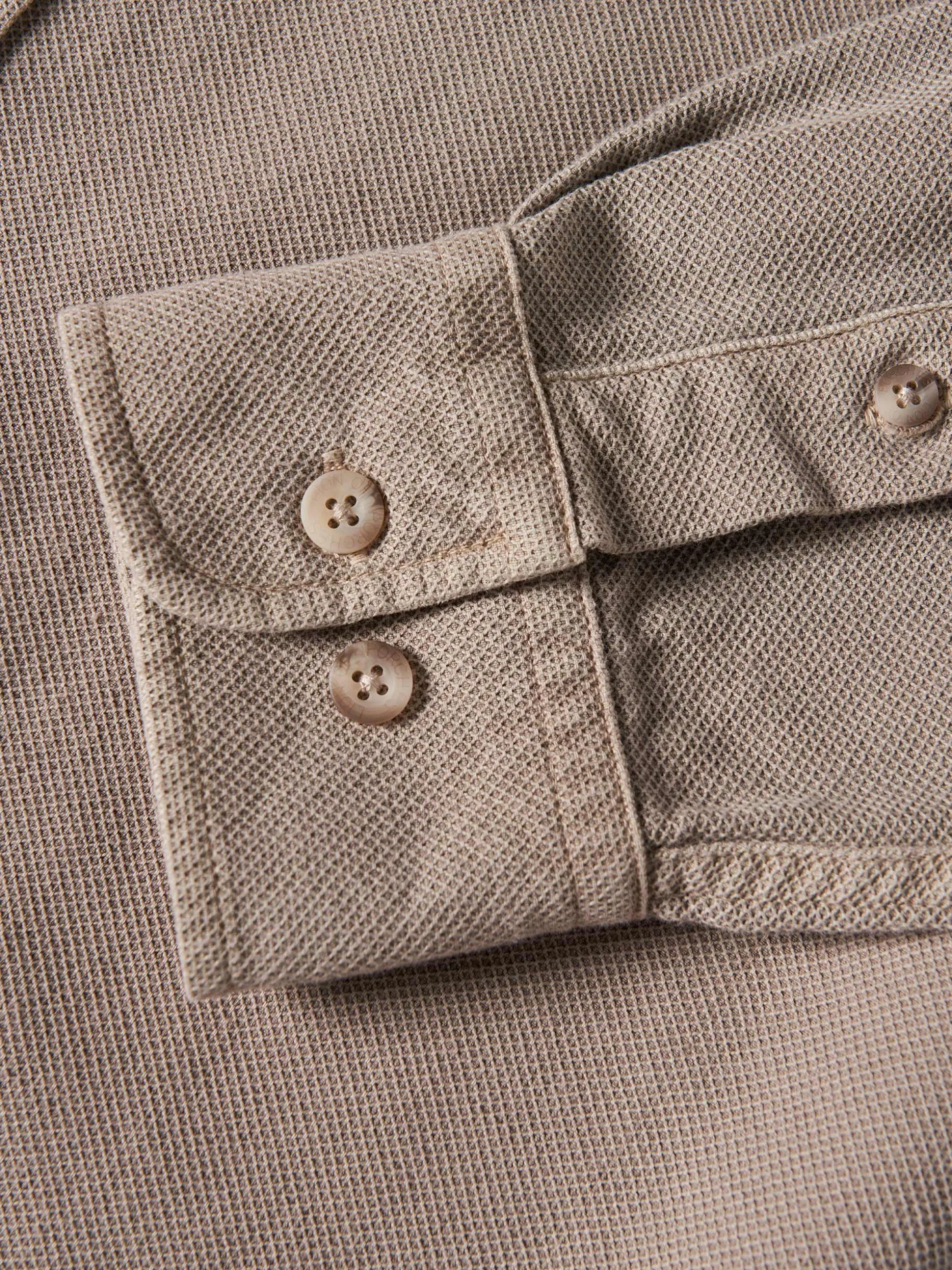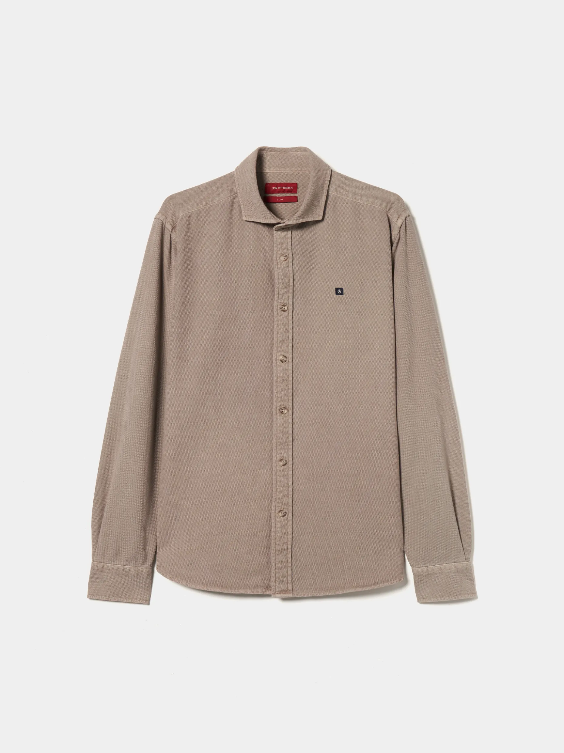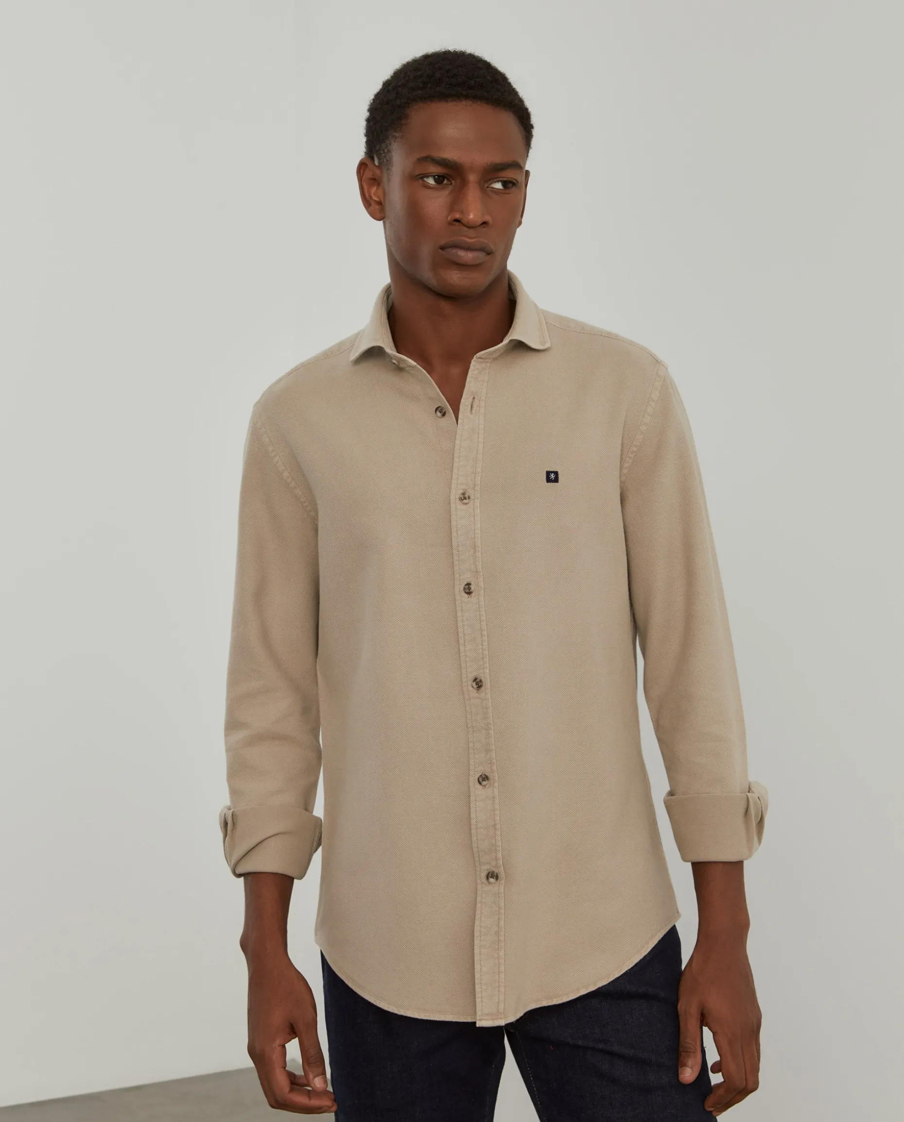 Camisa slim fit, de manga comprida, com colarinho “cutaway”. Tem o pequeno leão da marca bordado no peito e está disponível em várias cores. Confecionada em algodão, com recurso à técnica garment dye, que consiste no tingimento após a confeção, resultando numa cor única, um toque mais suave e um visual casualmente sofisticado.
