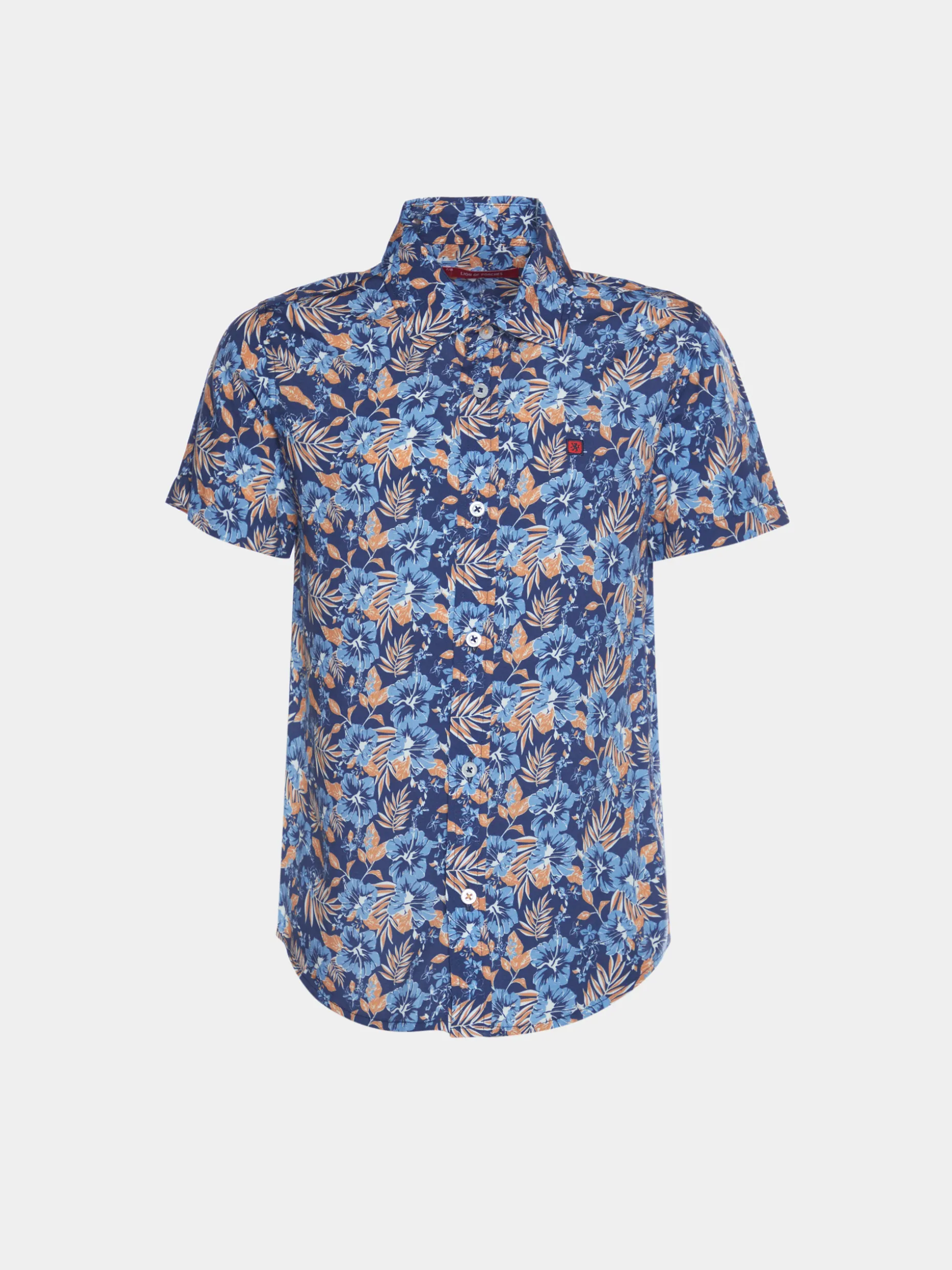 Camisa slim fit manga curta com estampado de flores. Etiqueta Lion of Porches bordada no peito. Botões personalizados cosidos em contraste.