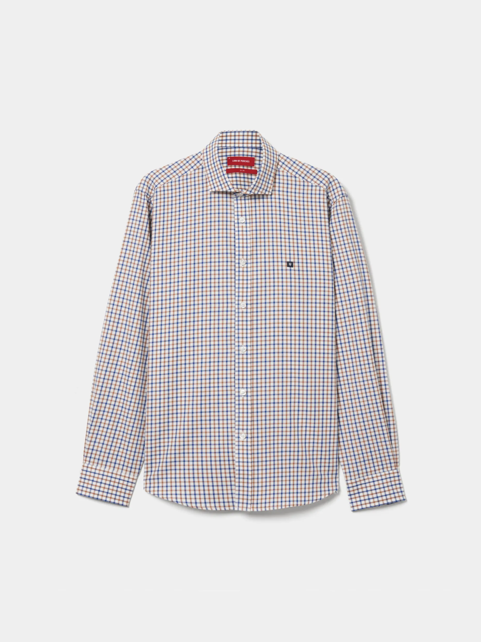 Camisa slim fit, de manga comprida, com padrão de quadrados. Aperta com botões e tem colarinho “cutaway”.