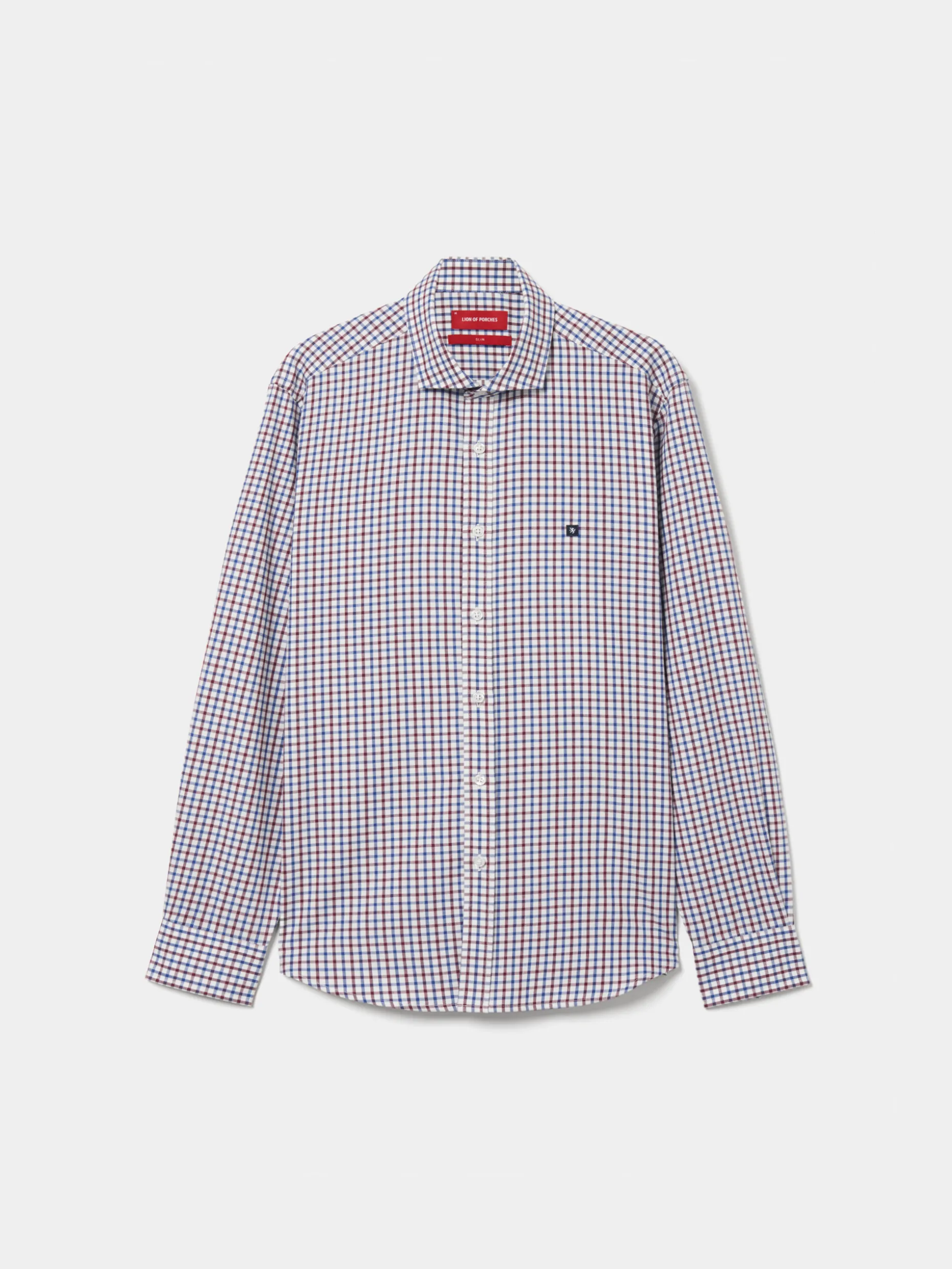 Camisa slim fit, de manga comprida, com padrão de quadrados. Aperta com botões e tem colarinho “cutaway”.