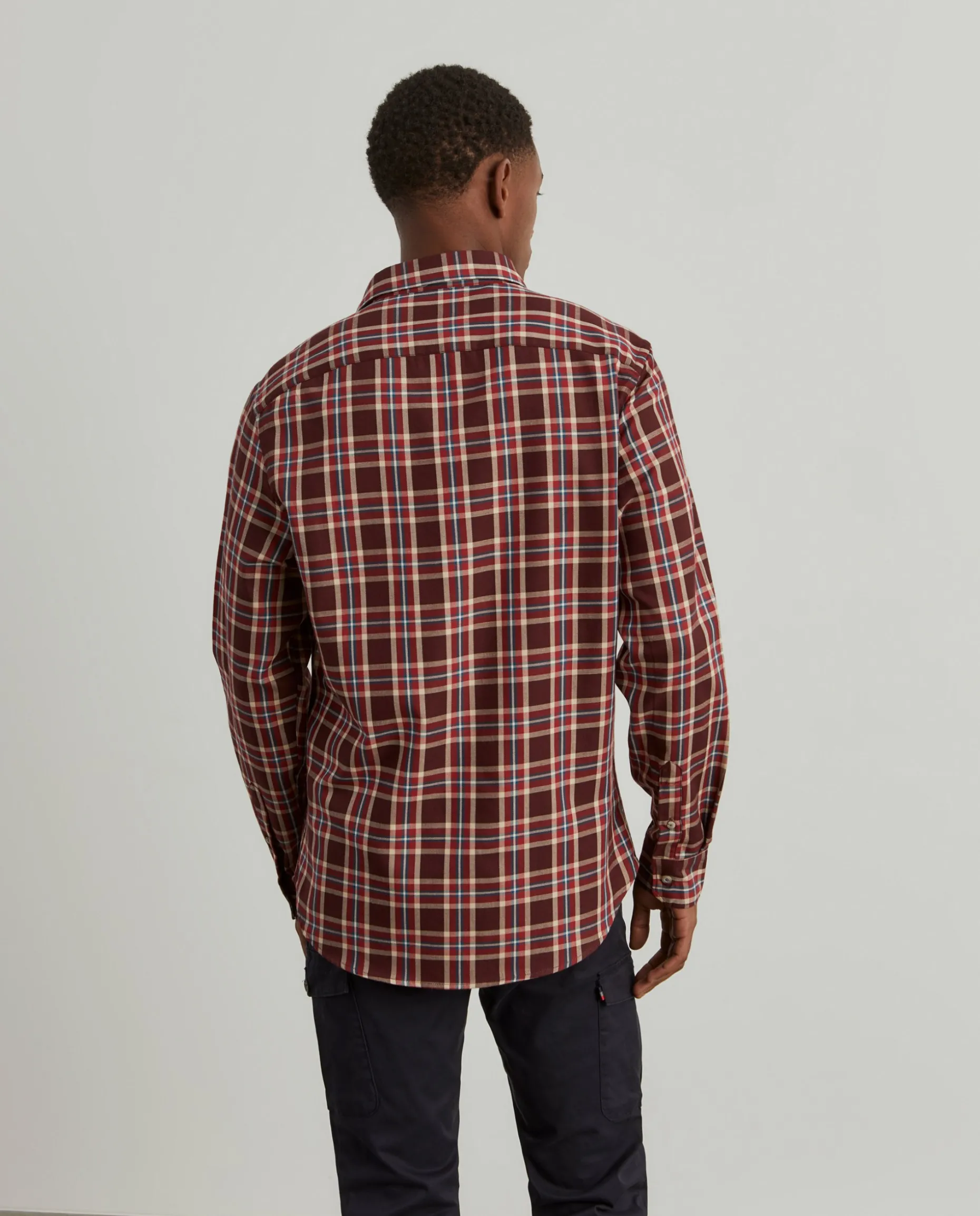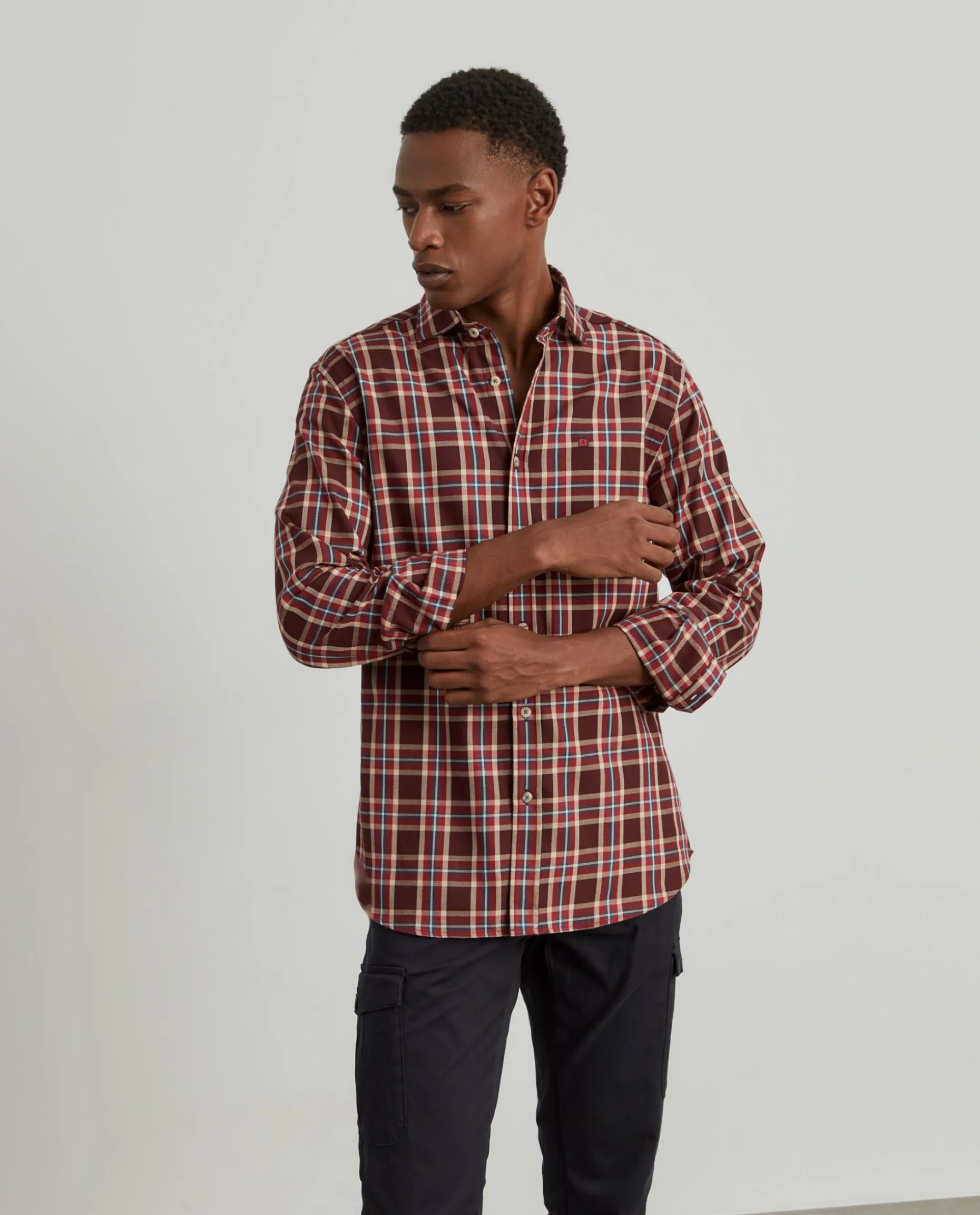 Camisa Slim Fit em tecido com padrão de xadrez. Colarinho “cutaway”. Bordado personalizado no peito. Botões personalizados.