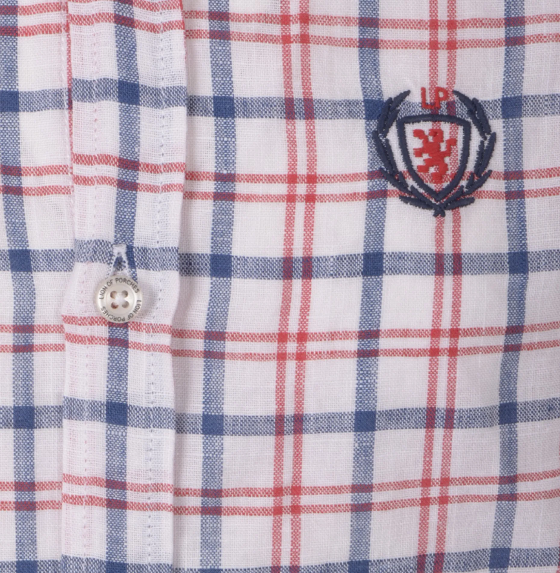 Camisa com padrão axadrezado distinto e desenhado em cores frescas. Logótipo bordado no peito, emblema aplicado na zona inferior da carcela.