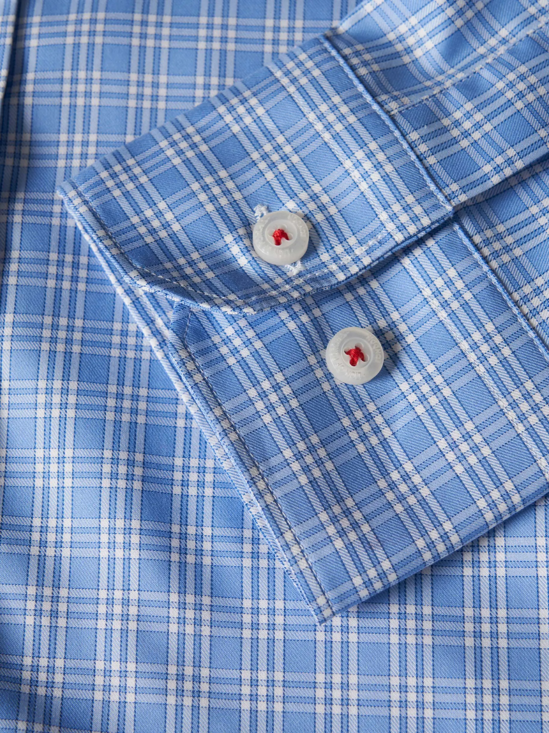 Camisa slim fit em tecido de xadrez. Colarinho com palhetas amovíveis. Personalizada com pequeno bordado quadrado “LP” no peito. Botões personalizados pregados a vermelho.