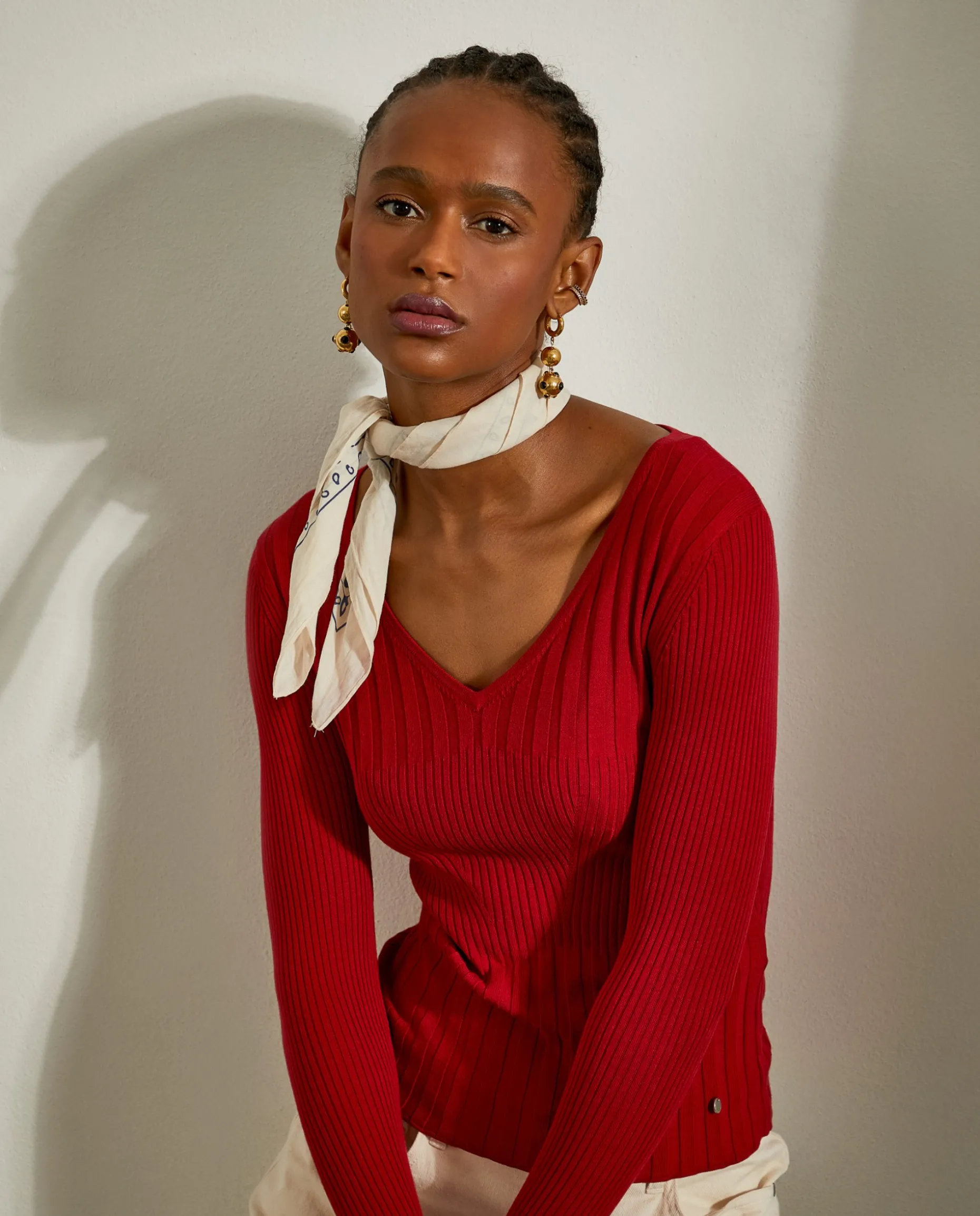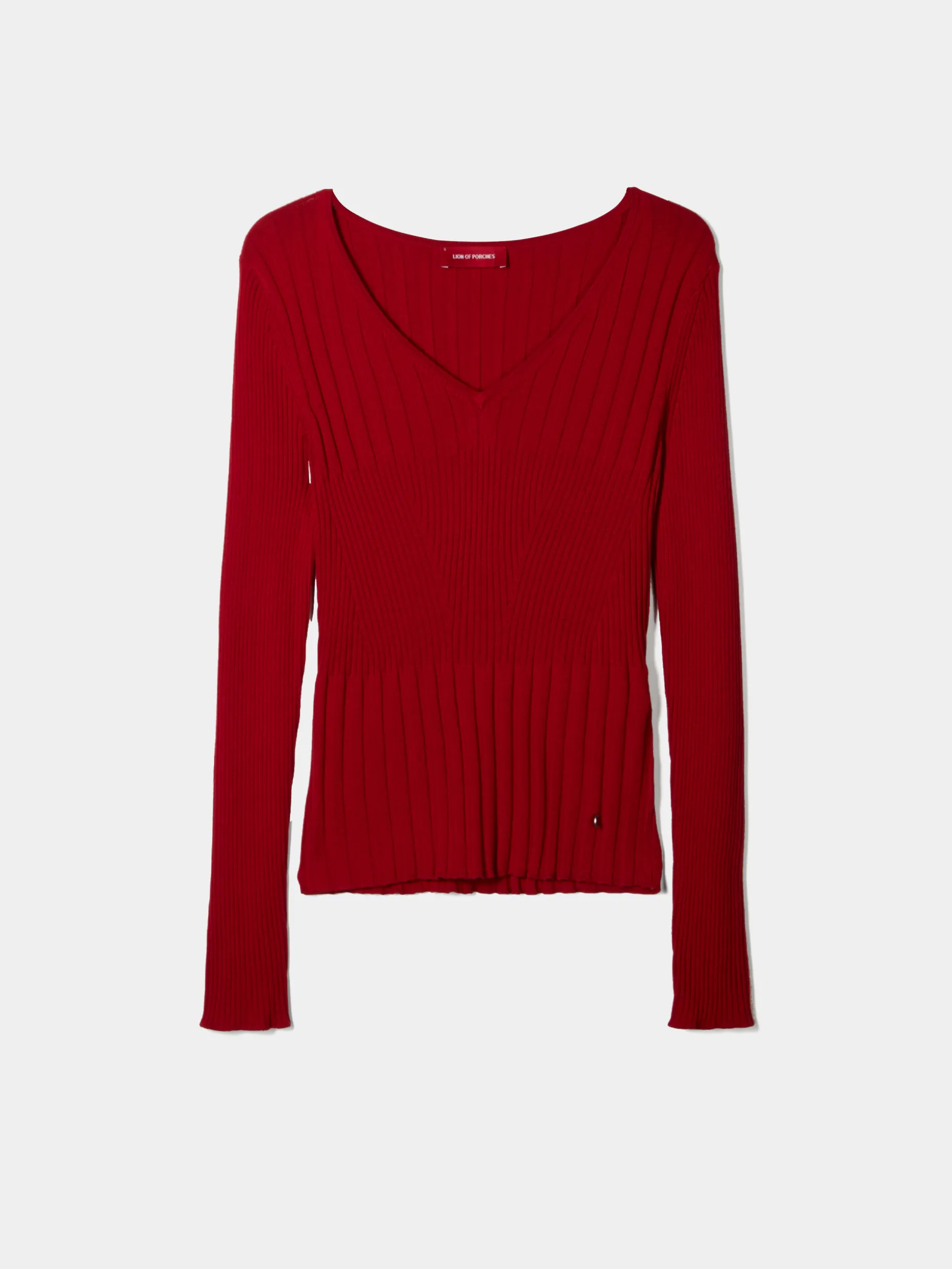 Camisola de malha canelada com decote em V. Manga comprida. Possibilidade de combinar com top e cardigan.