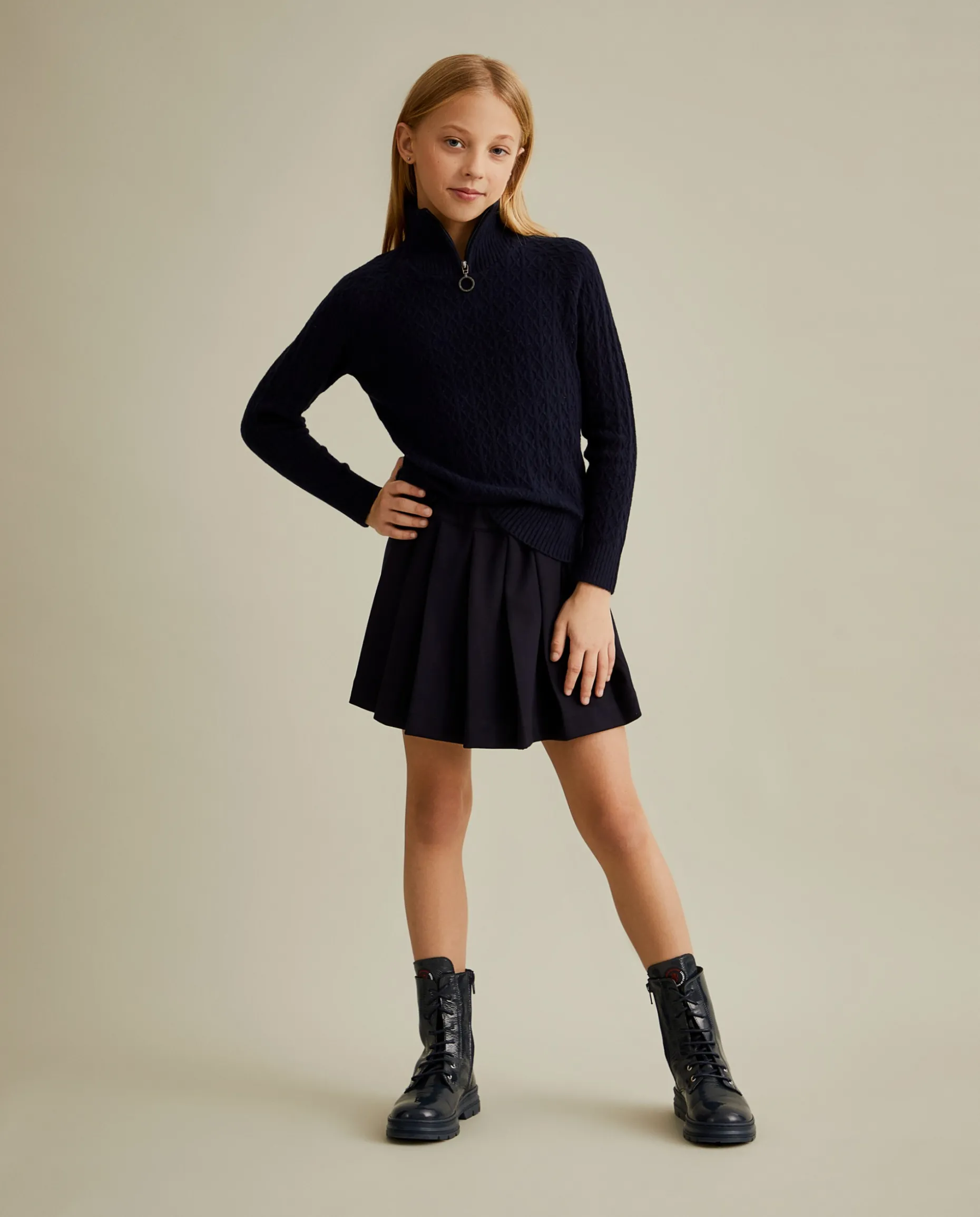Camisola leve e confortável, perfeita para os dias mais frios. A malha tem textura de bolinhas e finaliza com canelado na base, punhos e gola. De manga comprida, tem gola alta com fecho.