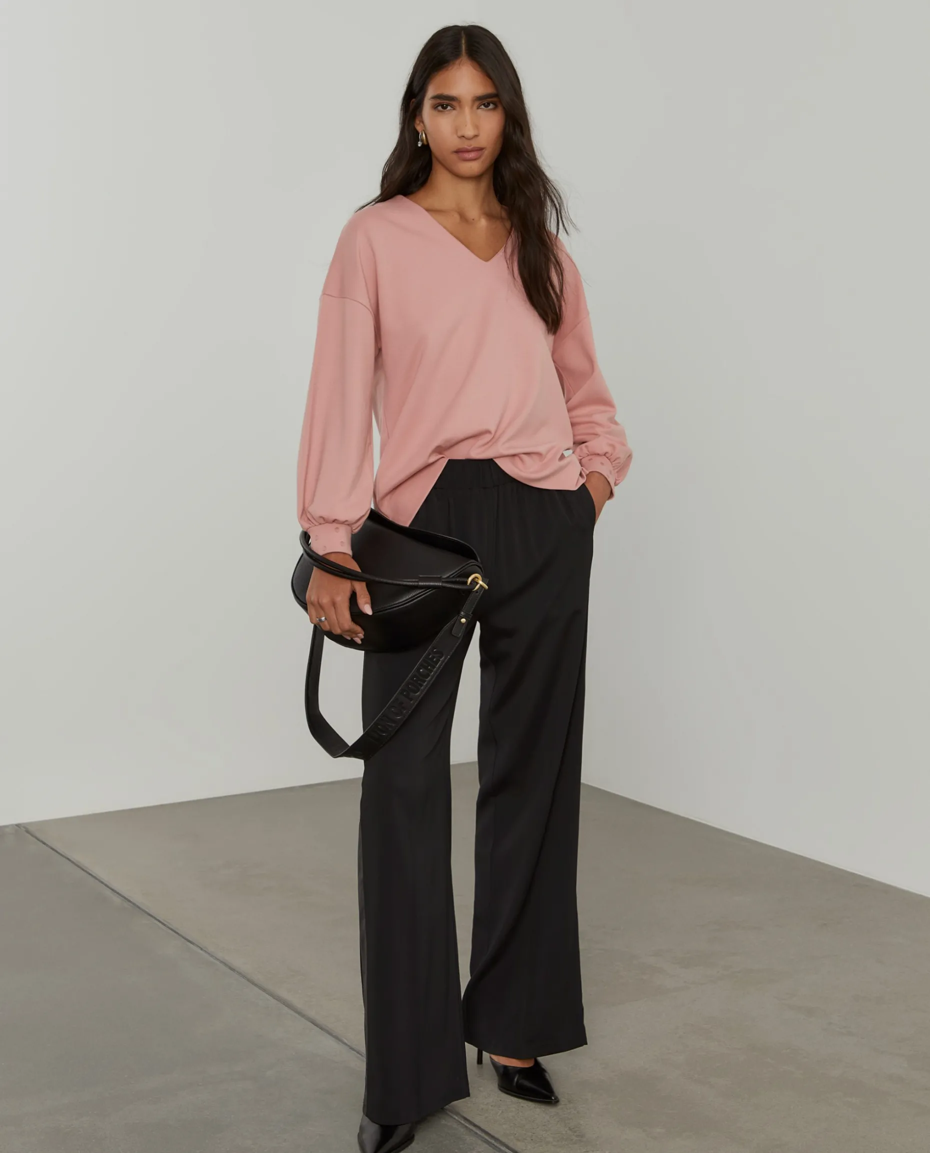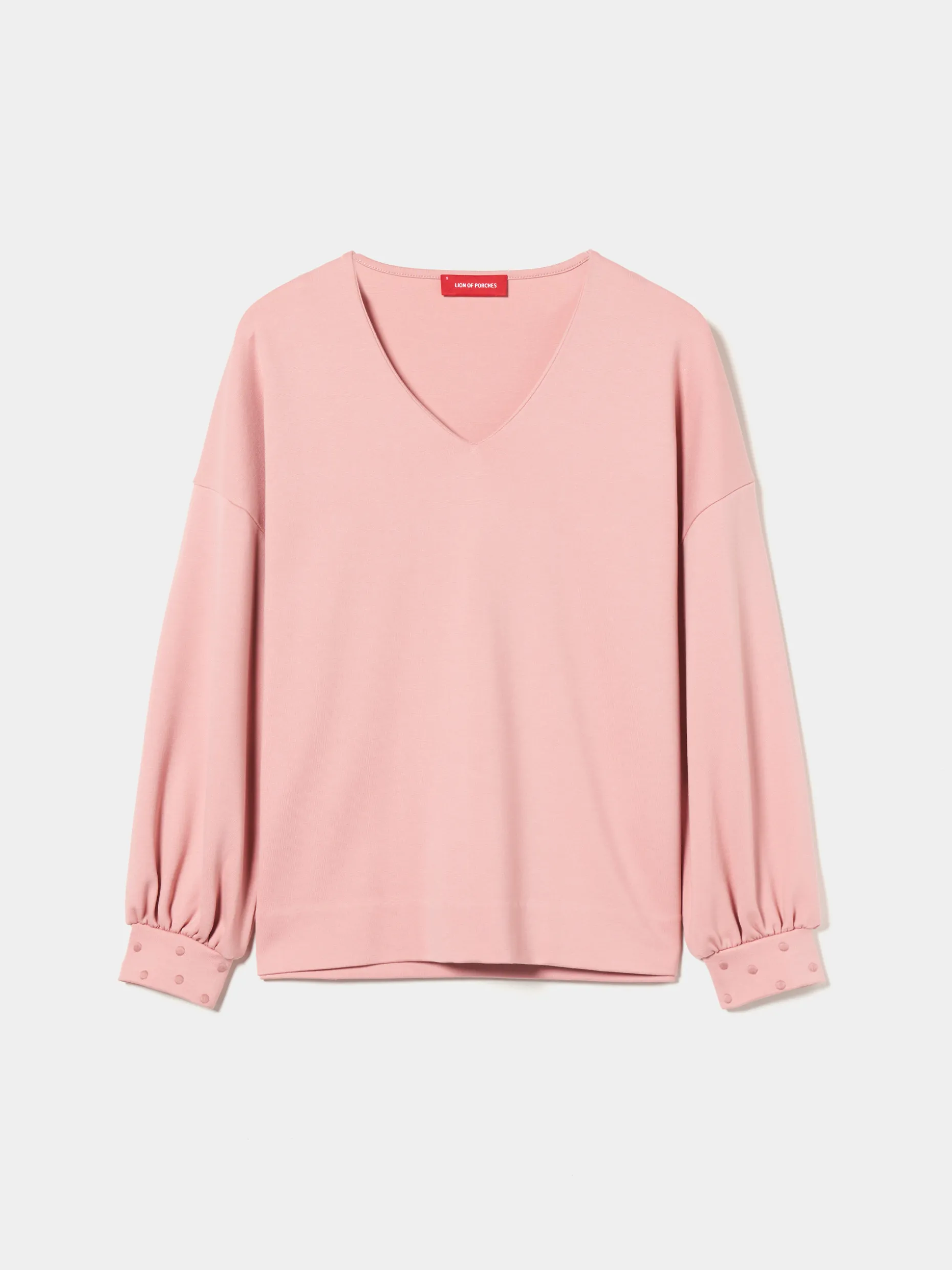 Camisola de malha com decote em V e mangas abalonadas. Pormenor romântico de bolinhas bordadas nos punhos.