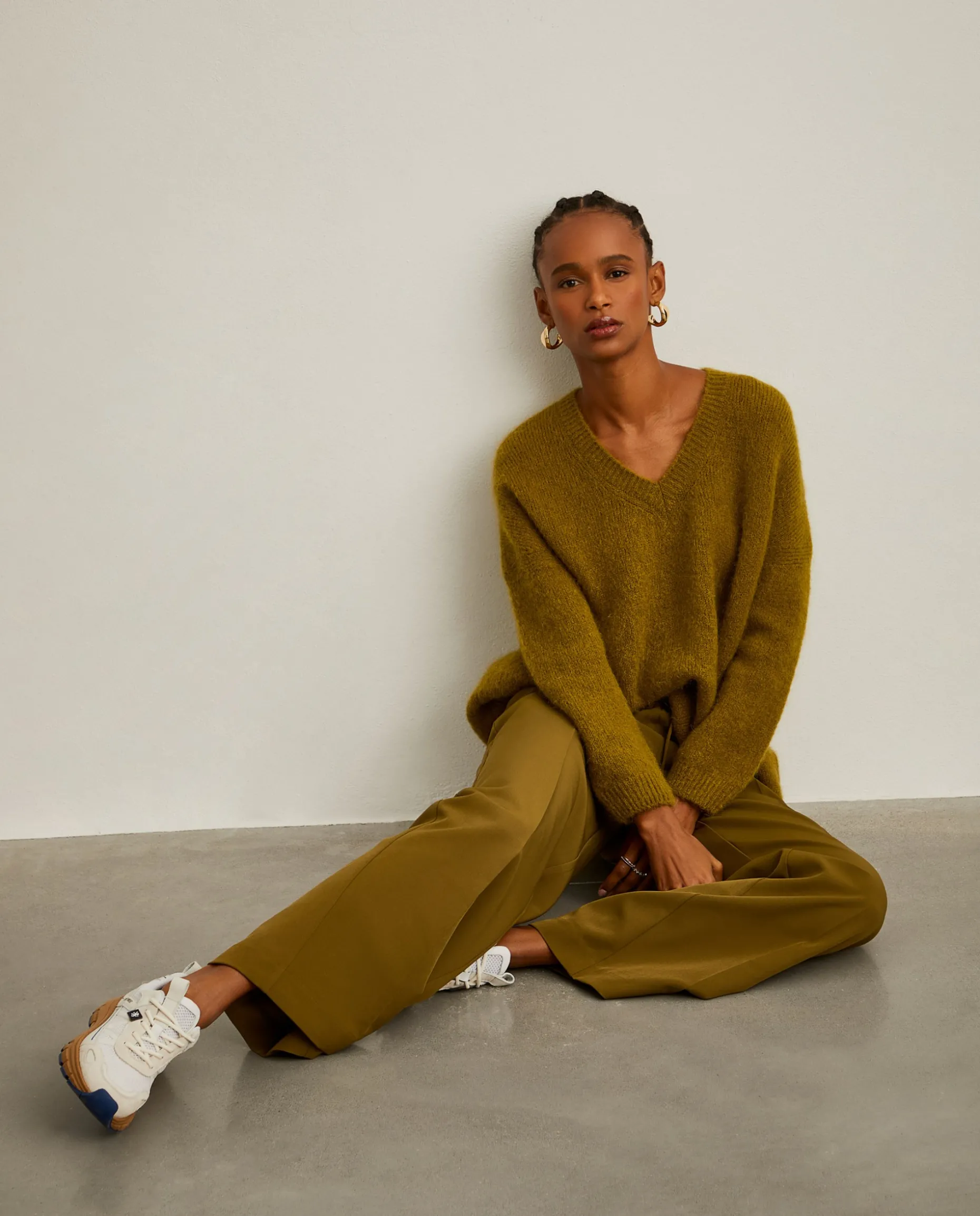 Camisola de lã com decote em V para um look quente e confortável. A lã kid mohair presente na sua confeção, confere à peça maior resistência, durabilidade e uma sensação ao toque única. Pormenor canelado na base, punhos e gola. Espreite também, o chapéu e cachecol a combinar, da mesma coleção.