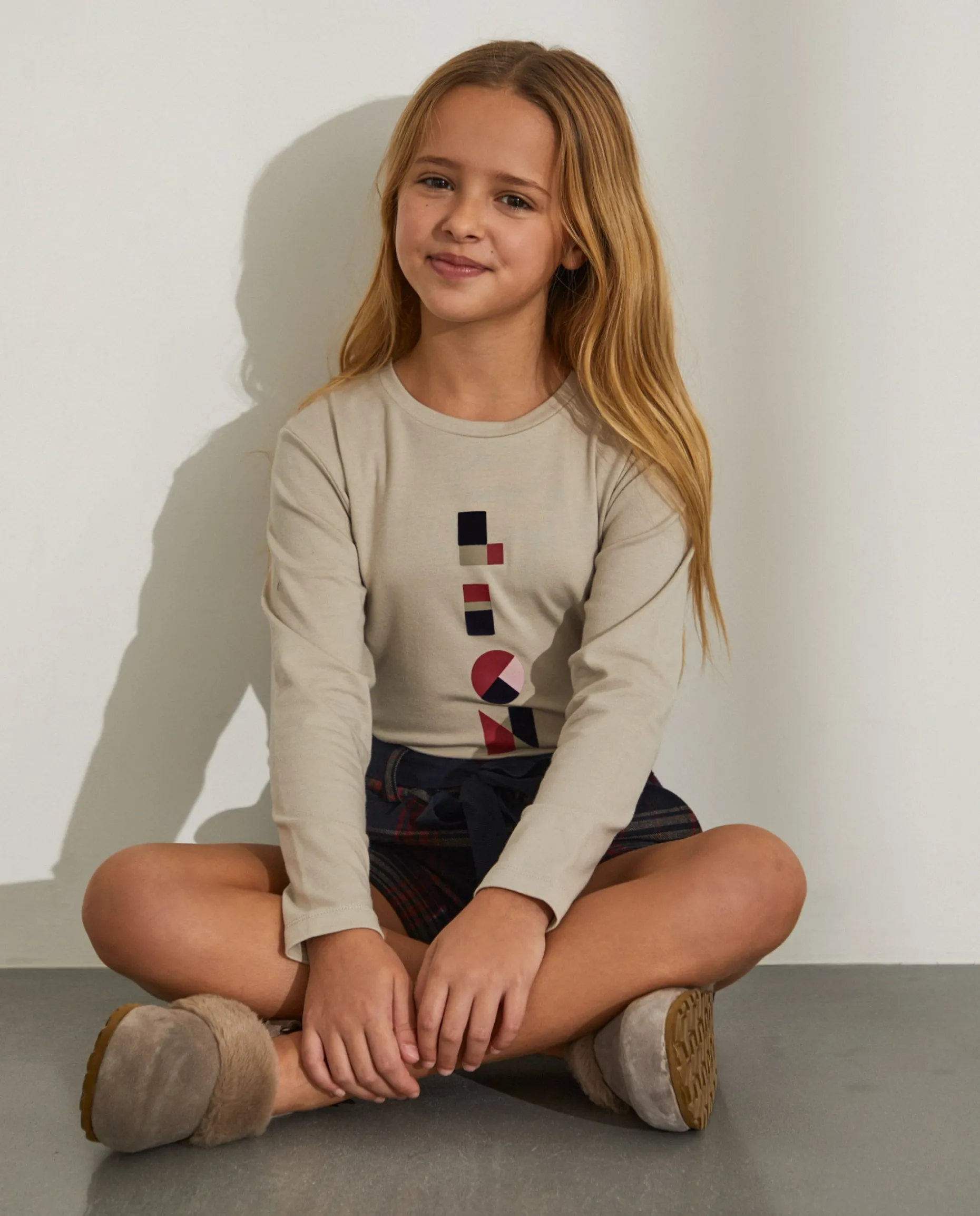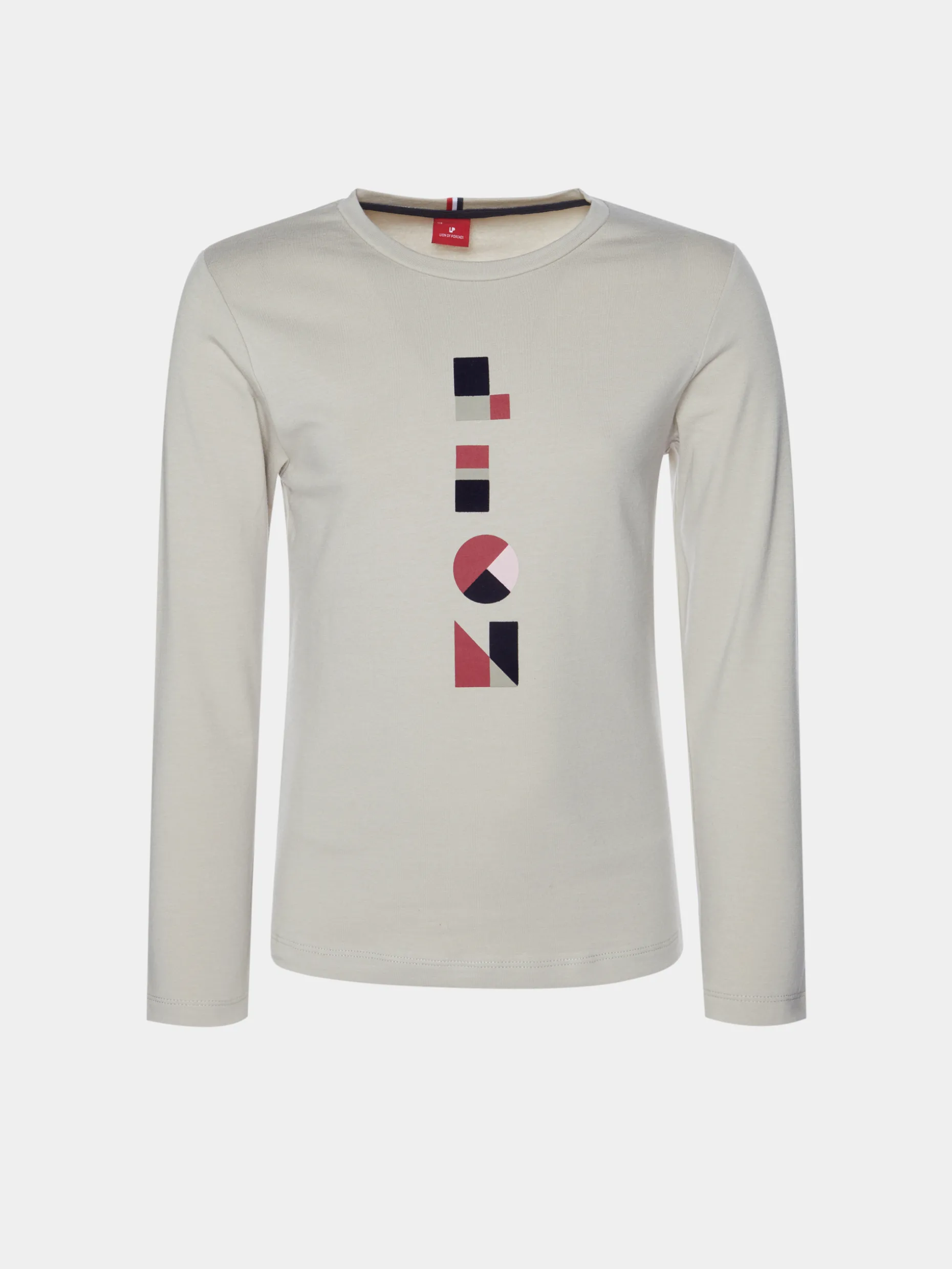 Camisola decote redondo manga comprida com lettering estampado em contraste. Detalhe de fita de riscas atrás na gola.