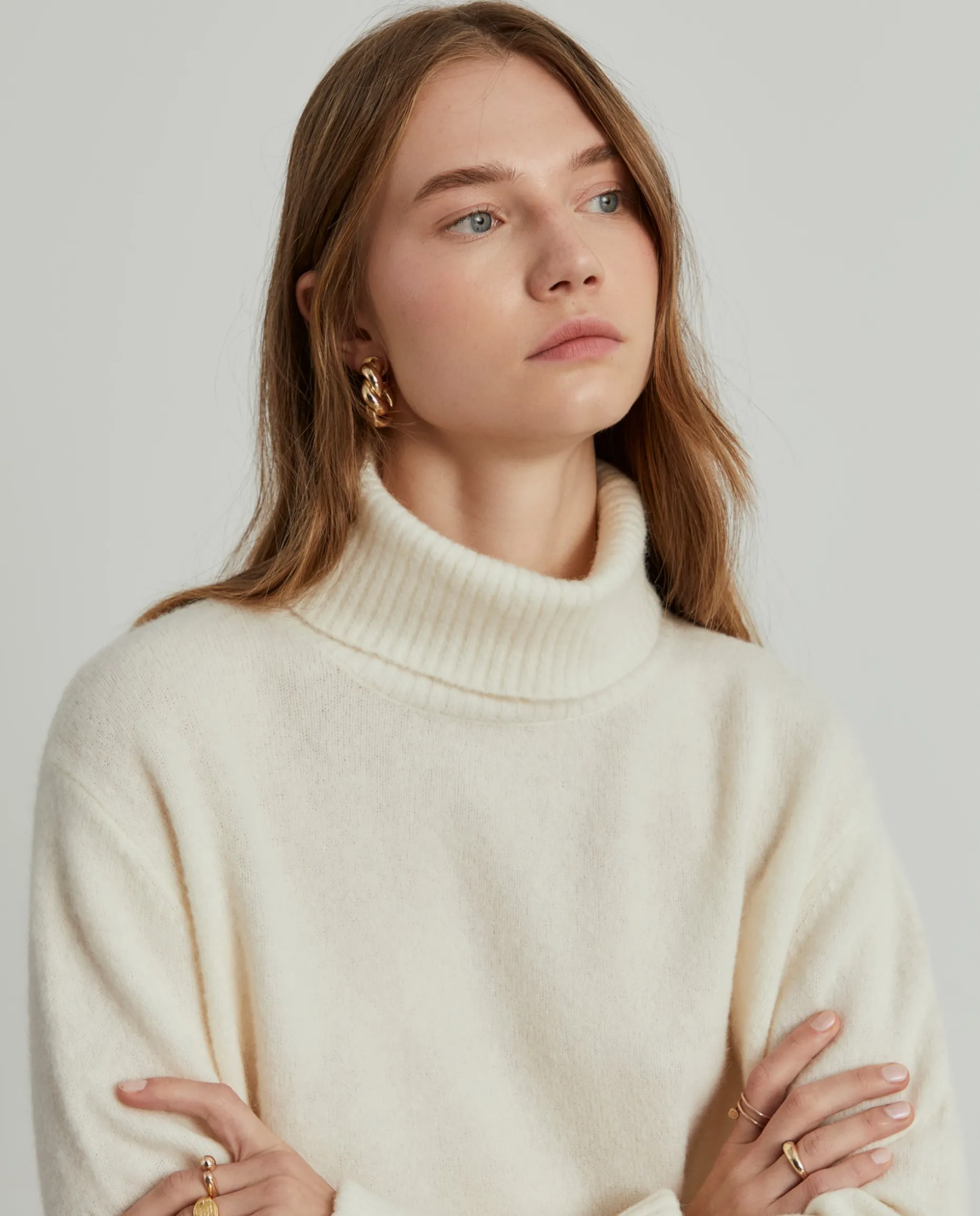 Um essencial de inverno, esta camisola de gola alta é confecionada com uma mistura de lã e alpaca que confere um toque extra de conforto e isolamento térmico. A gola, base e punhos são canelados.