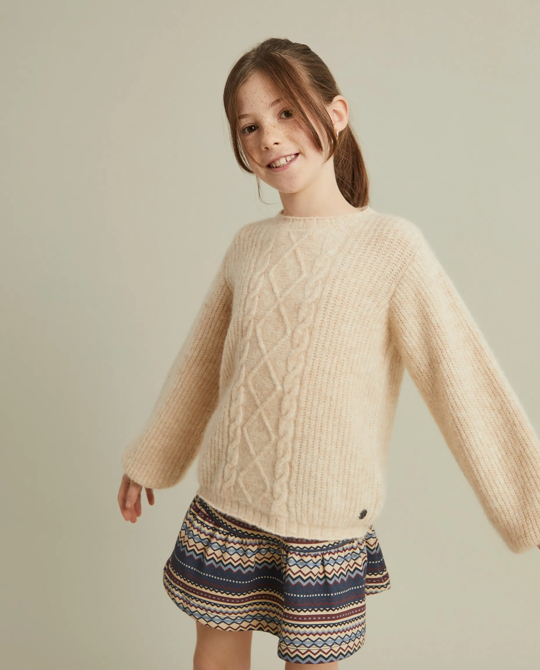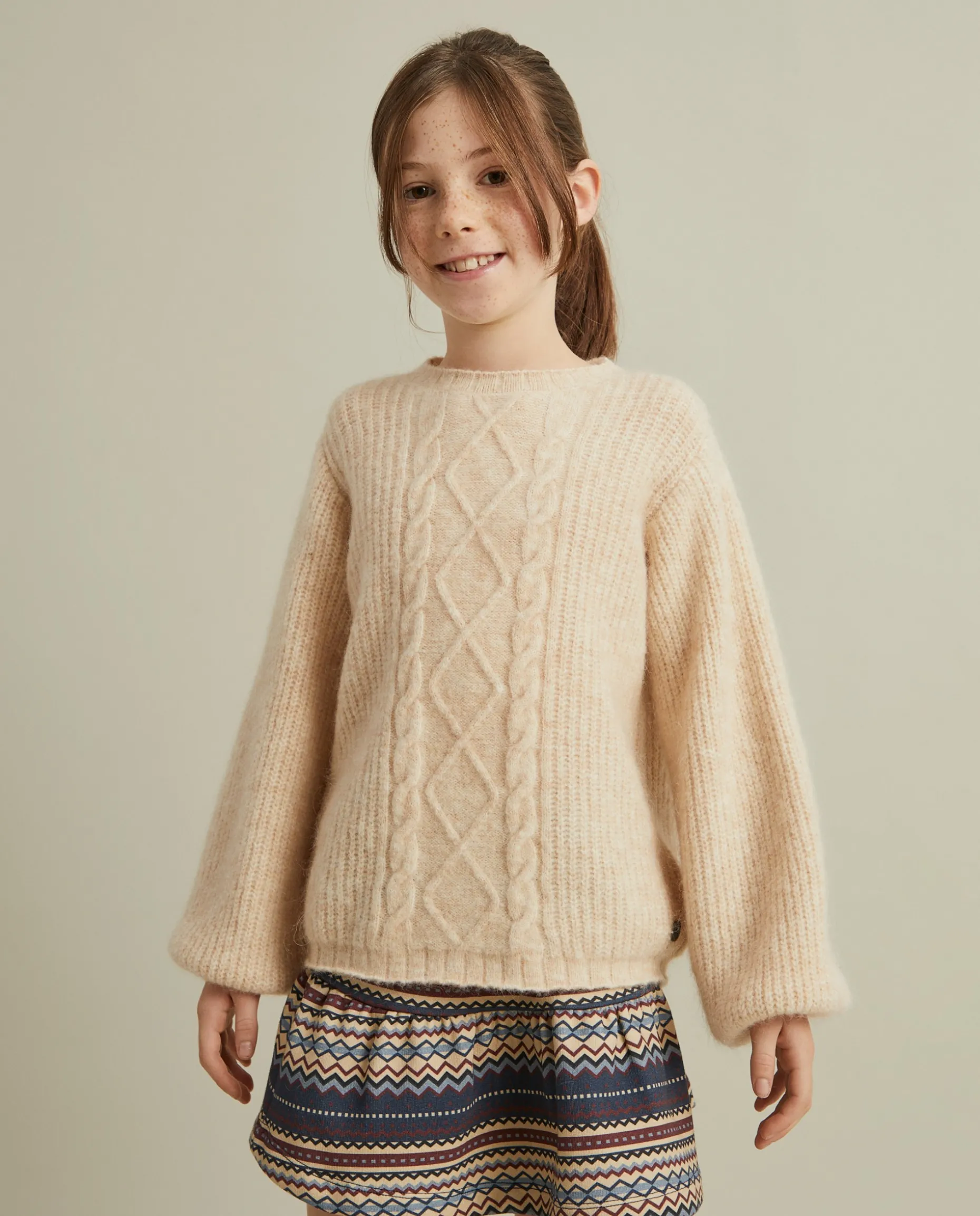 Proteja as miúdas do frio com esta camisola bem quentinha, de malha entrançada, com lã e mohair na sua composição, conferindo à peça maior suavidade e isolamento térmico. De mangas abalonadas e gola redonda.