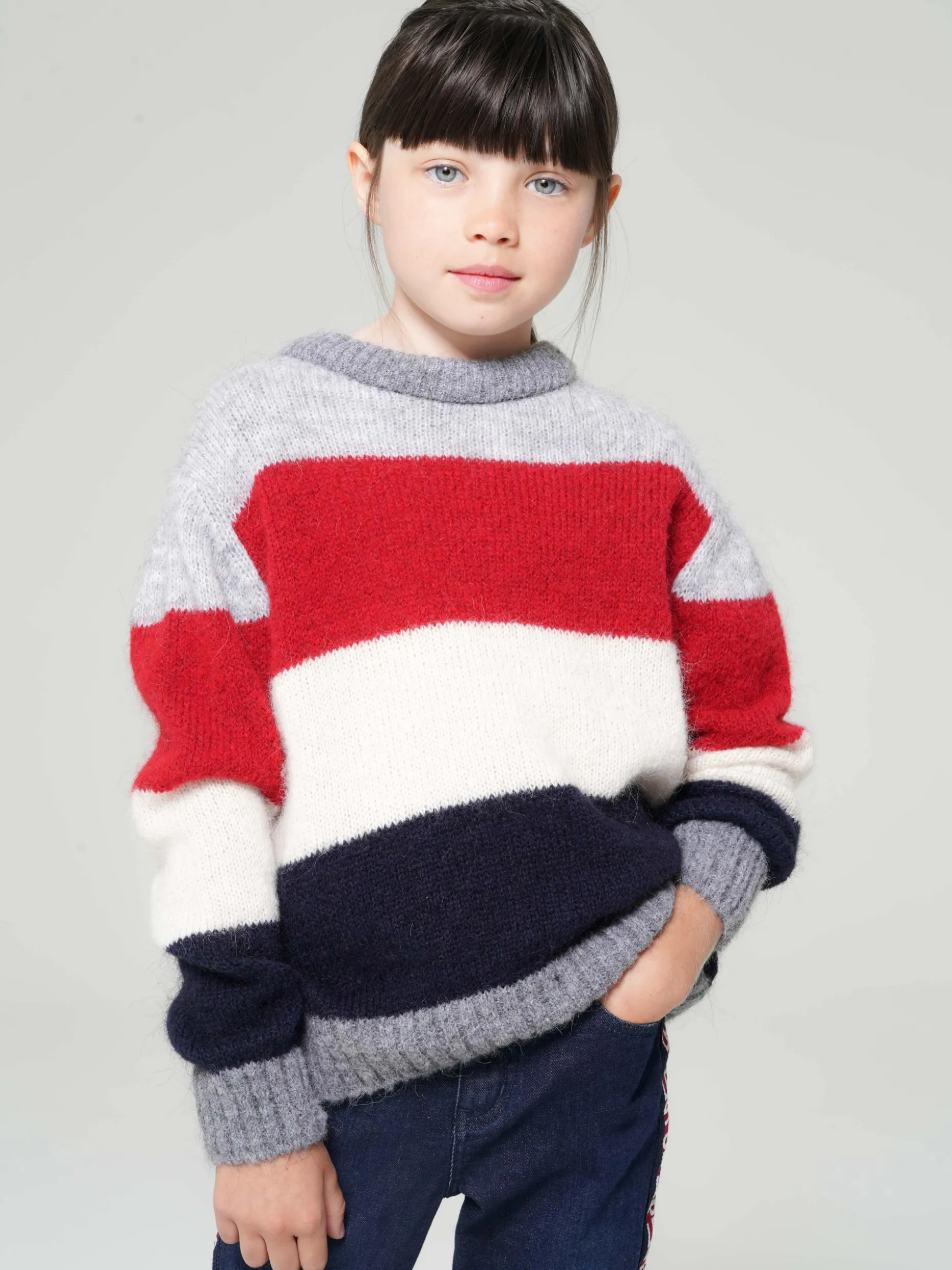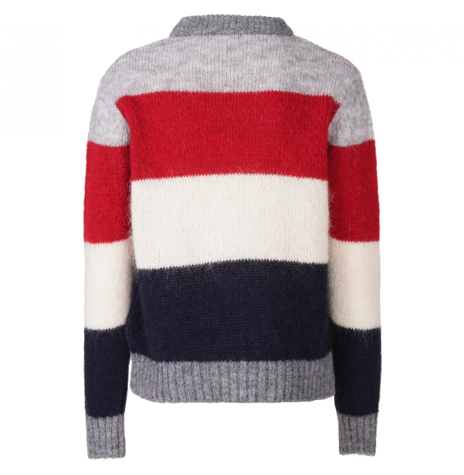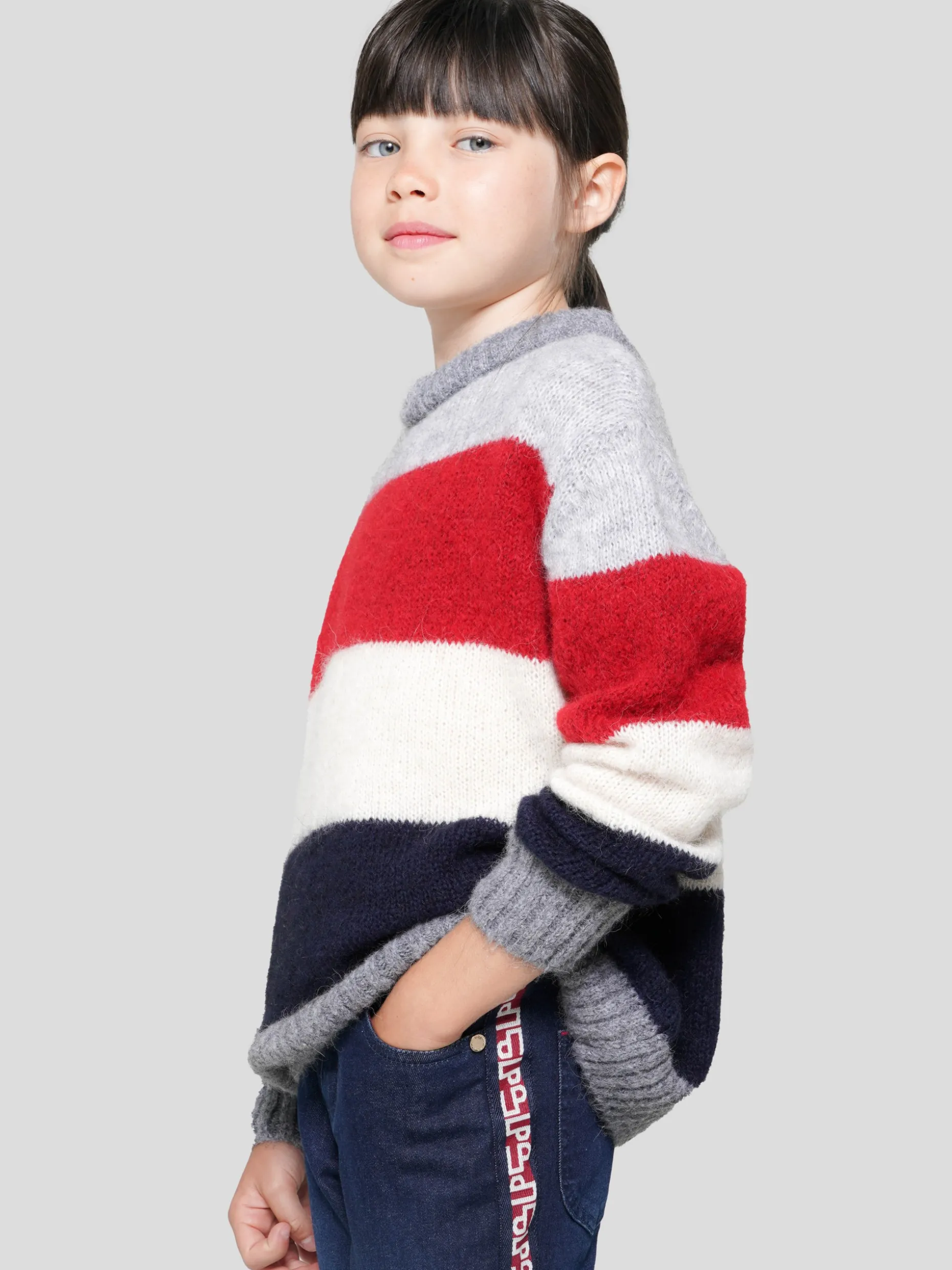 Feita de uma mistura de lã com um toque de alpaca, as riscas largas dão-lhe um ar casual. Personalizada com pequena chapa metálica na frente. Pode completar o look com gola e gorro vermelhos.