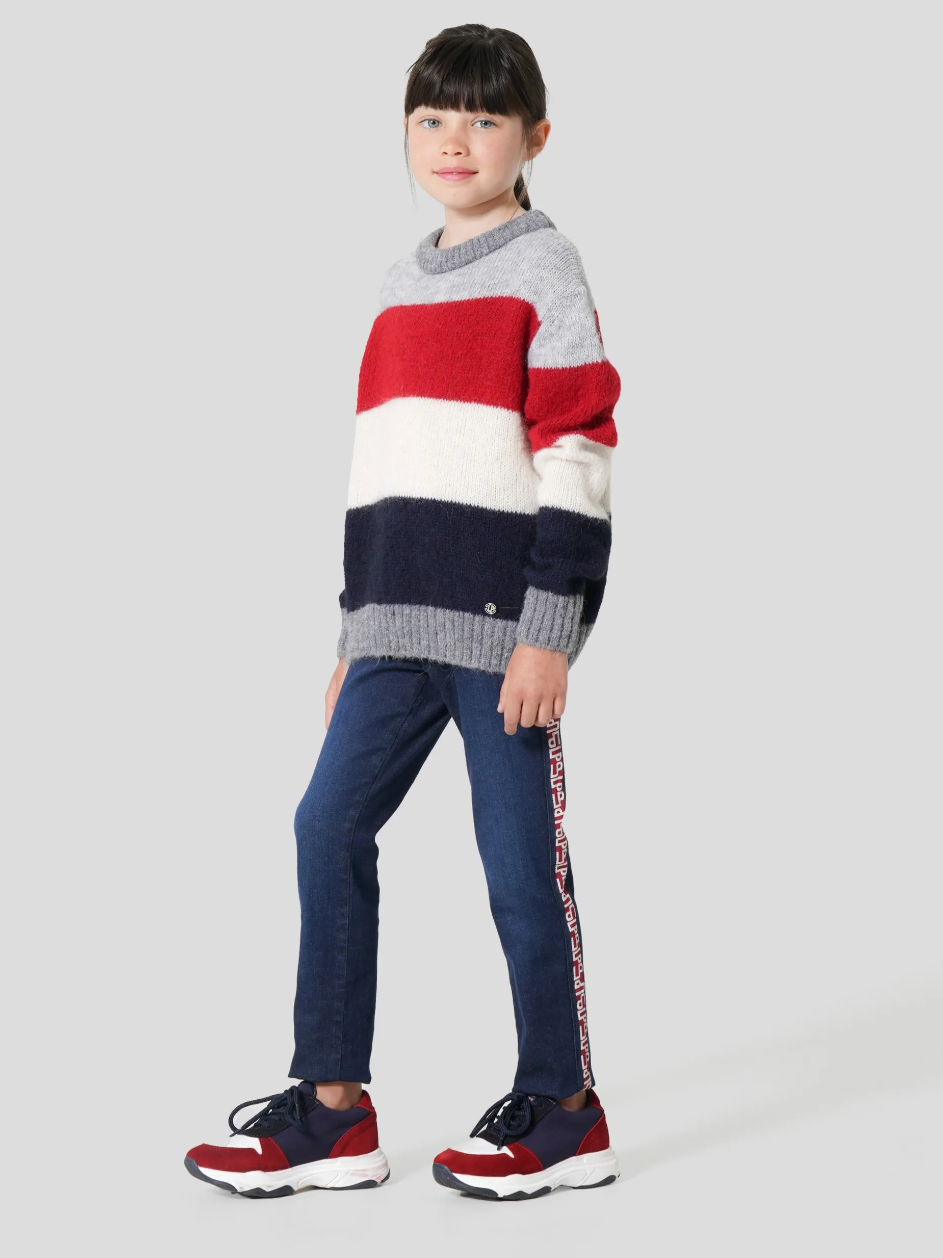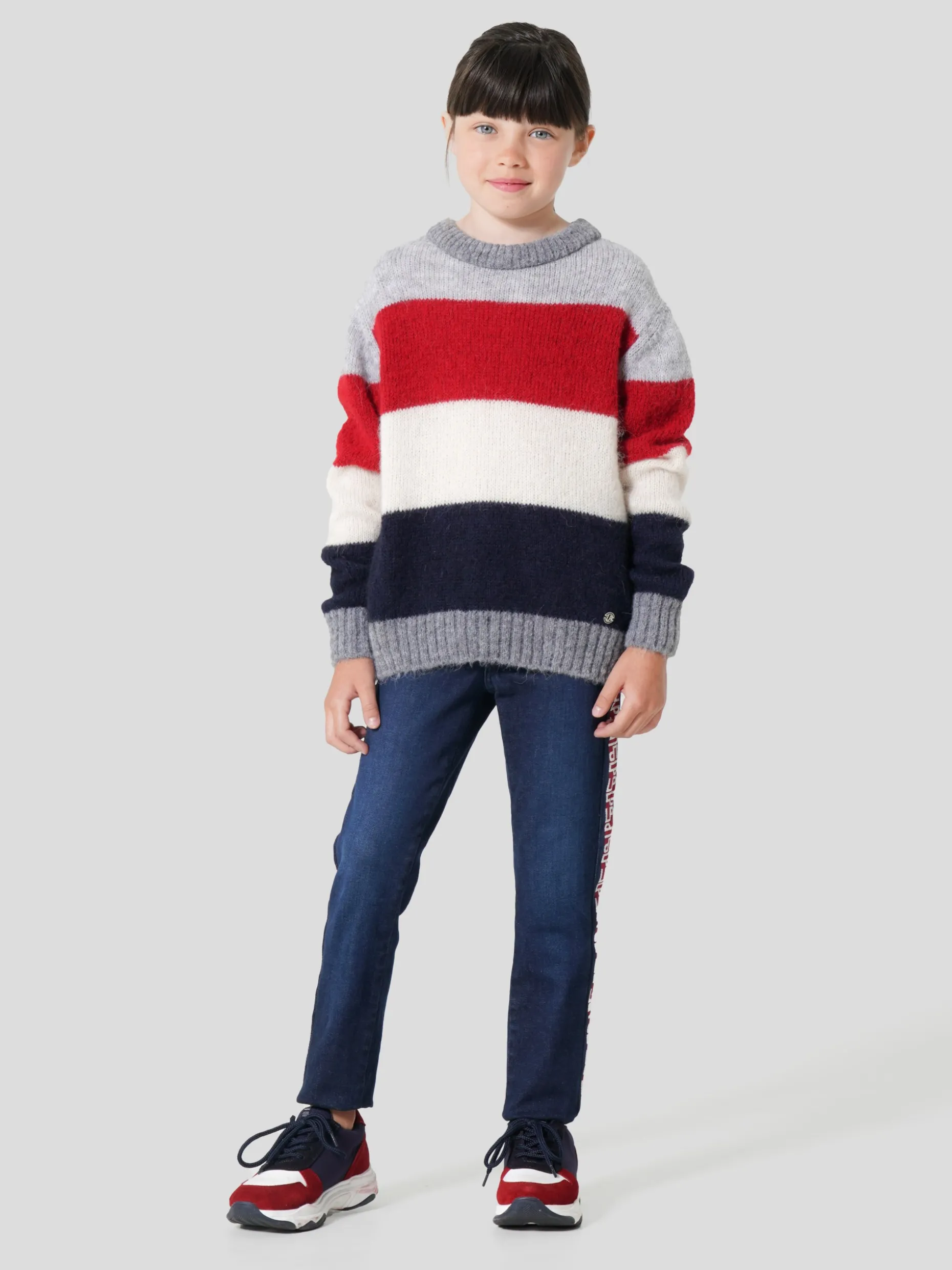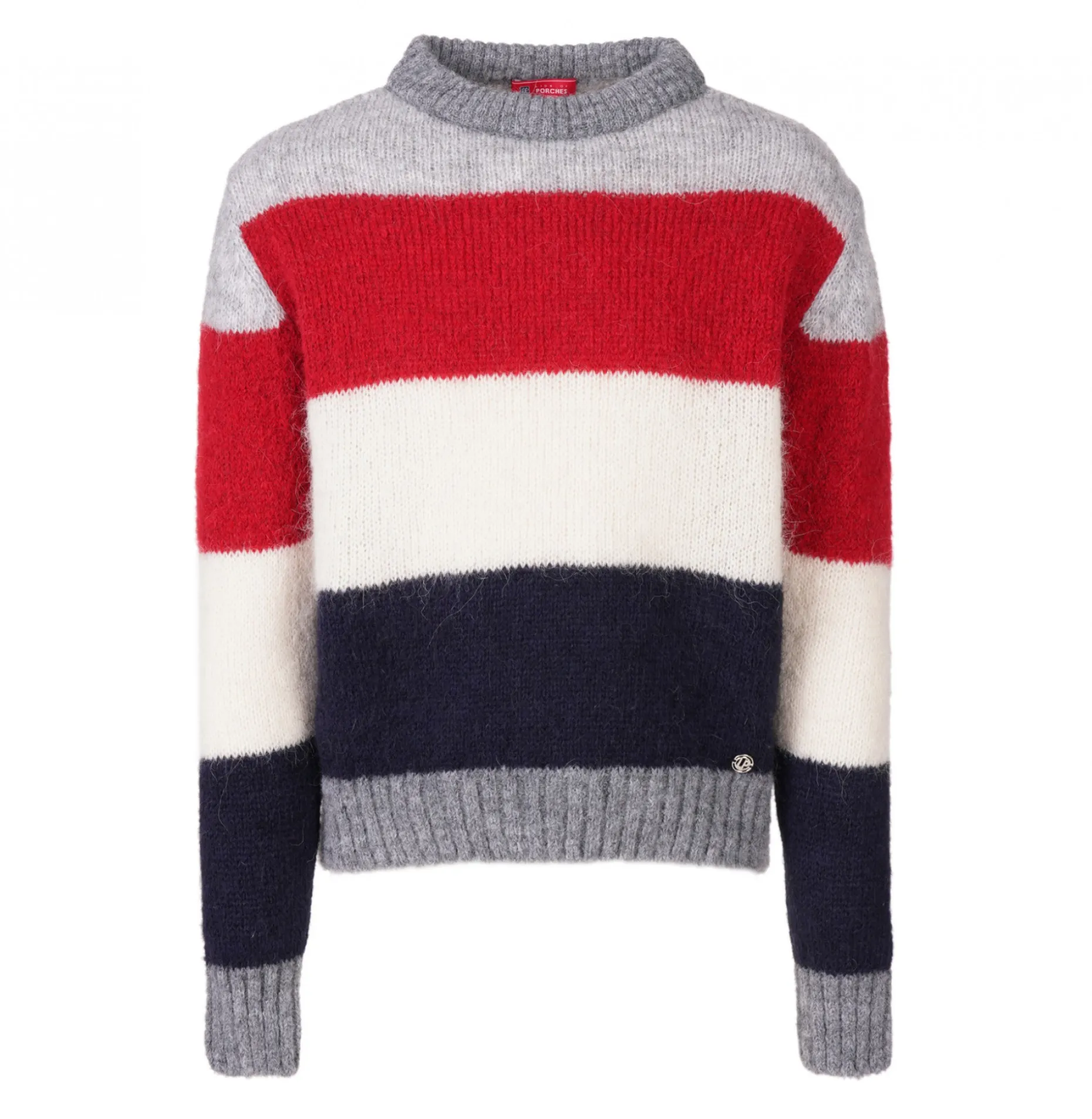 Feita de uma mistura de lã com um toque de alpaca, as riscas largas dão-lhe um ar casual. Personalizada com pequena chapa metálica na frente. Pode completar o look com gola e gorro vermelhos.