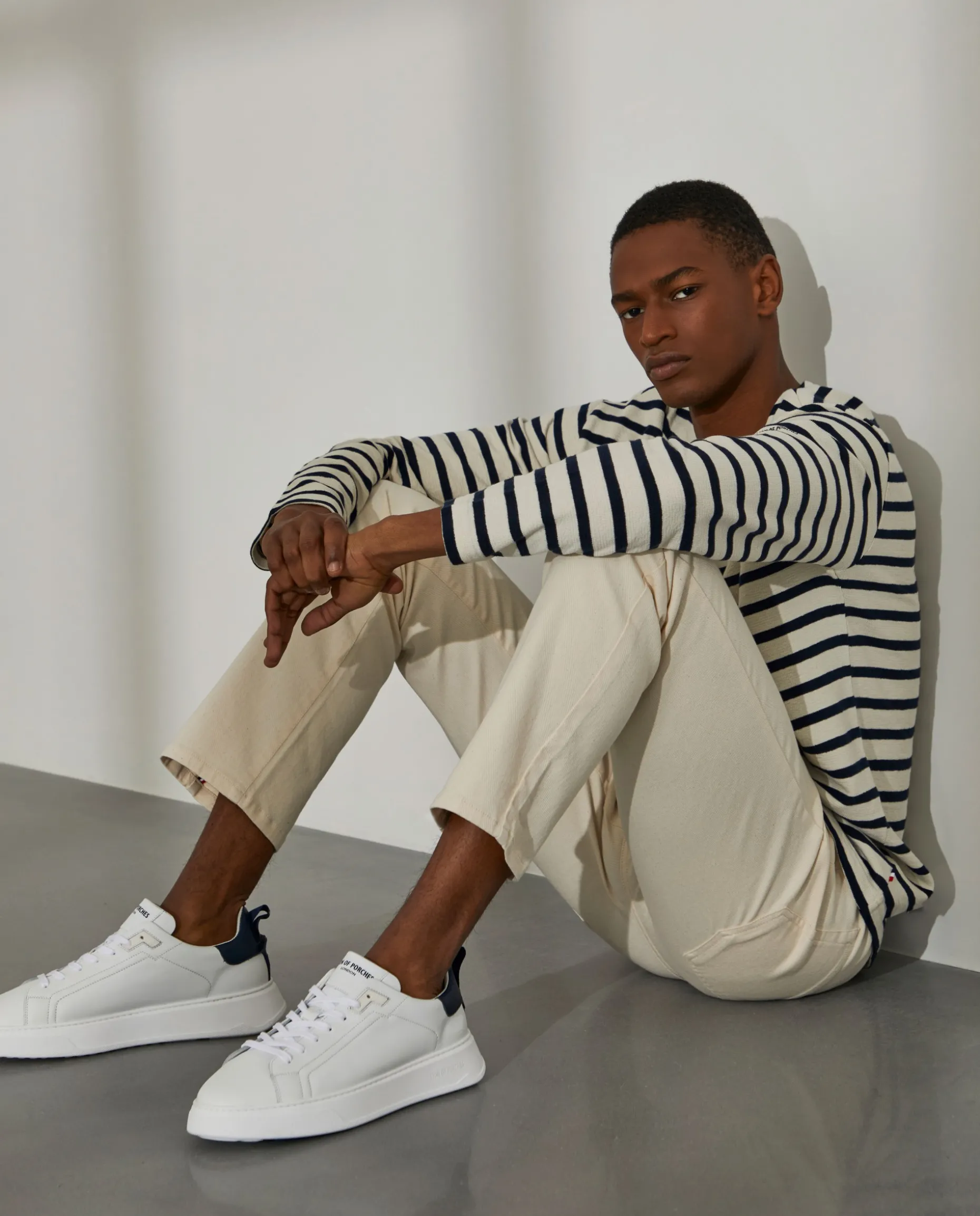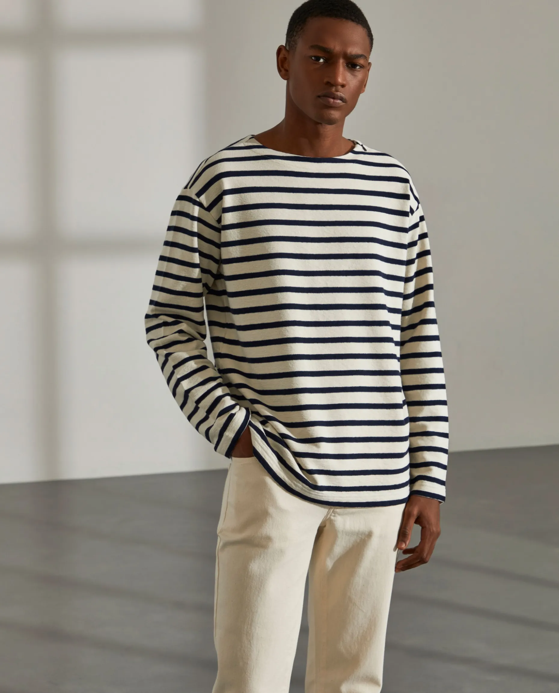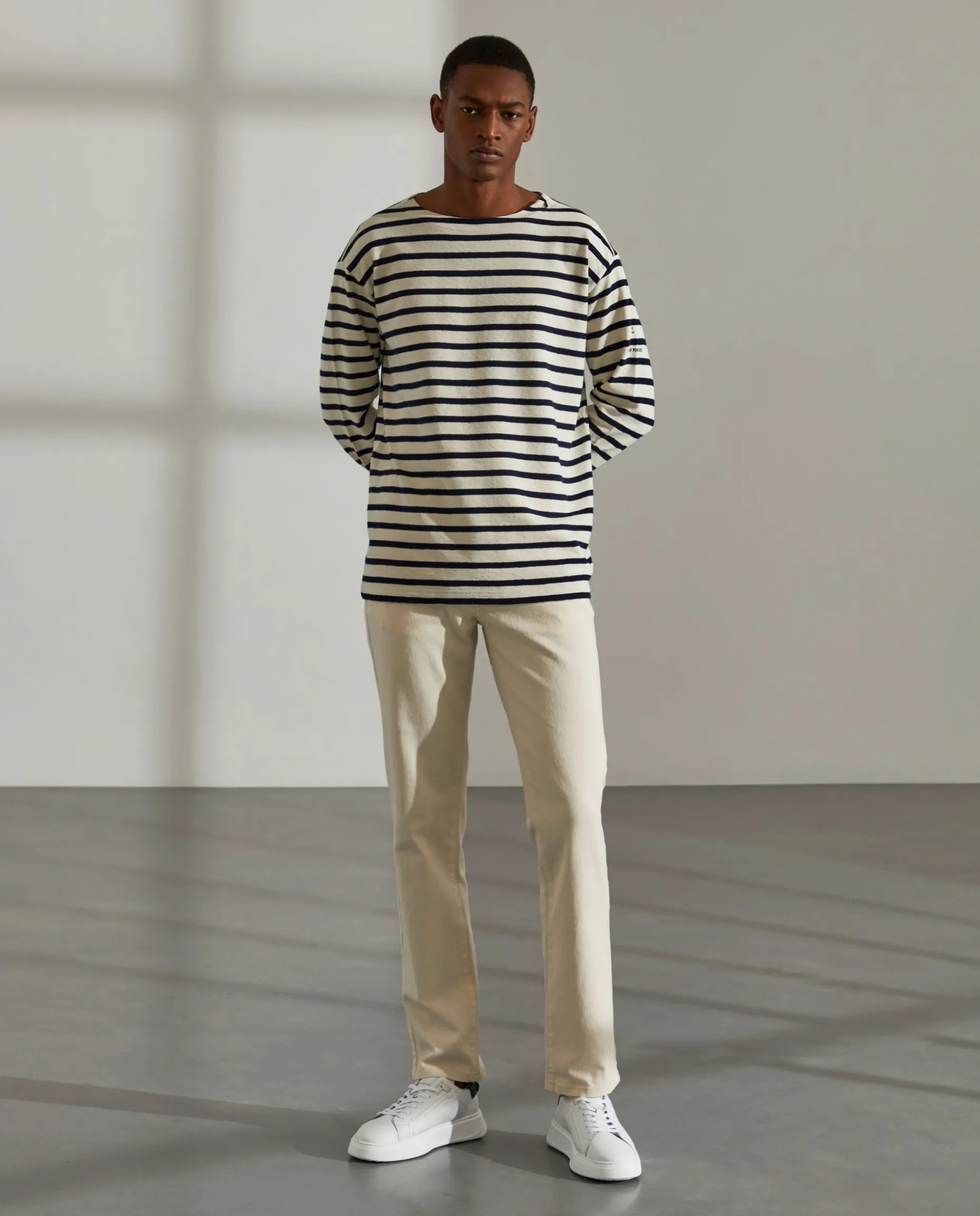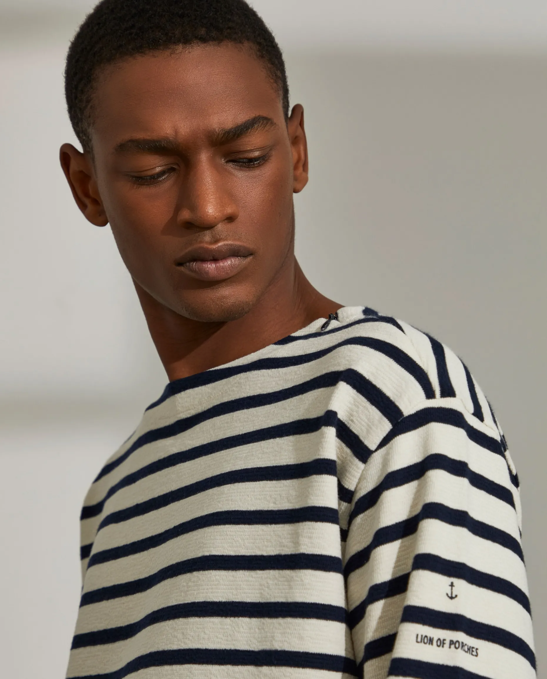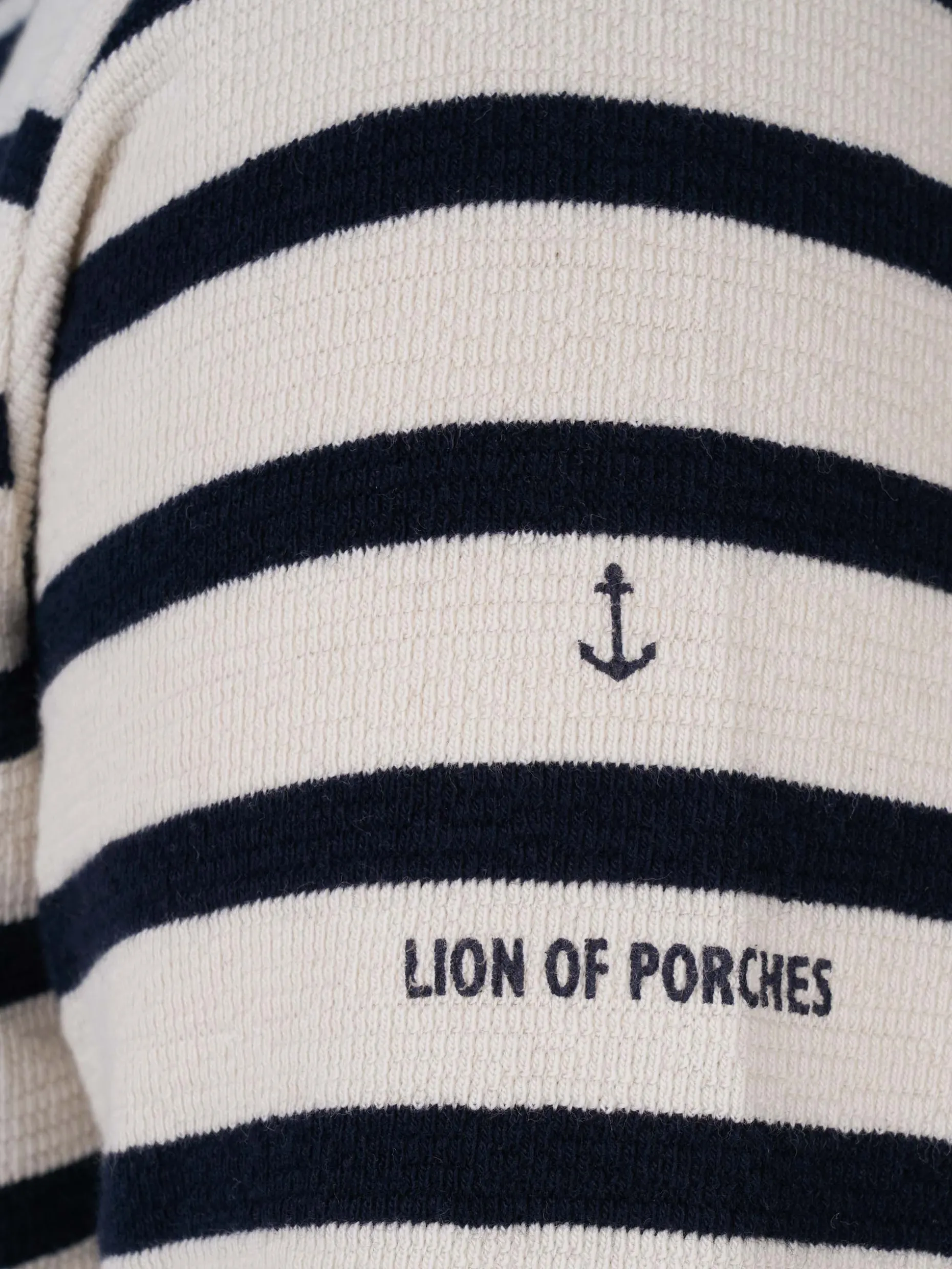 Camisola de algodão às riscas. Estampado Lion of Porches na manga. Fecho invisivel no ombro.
