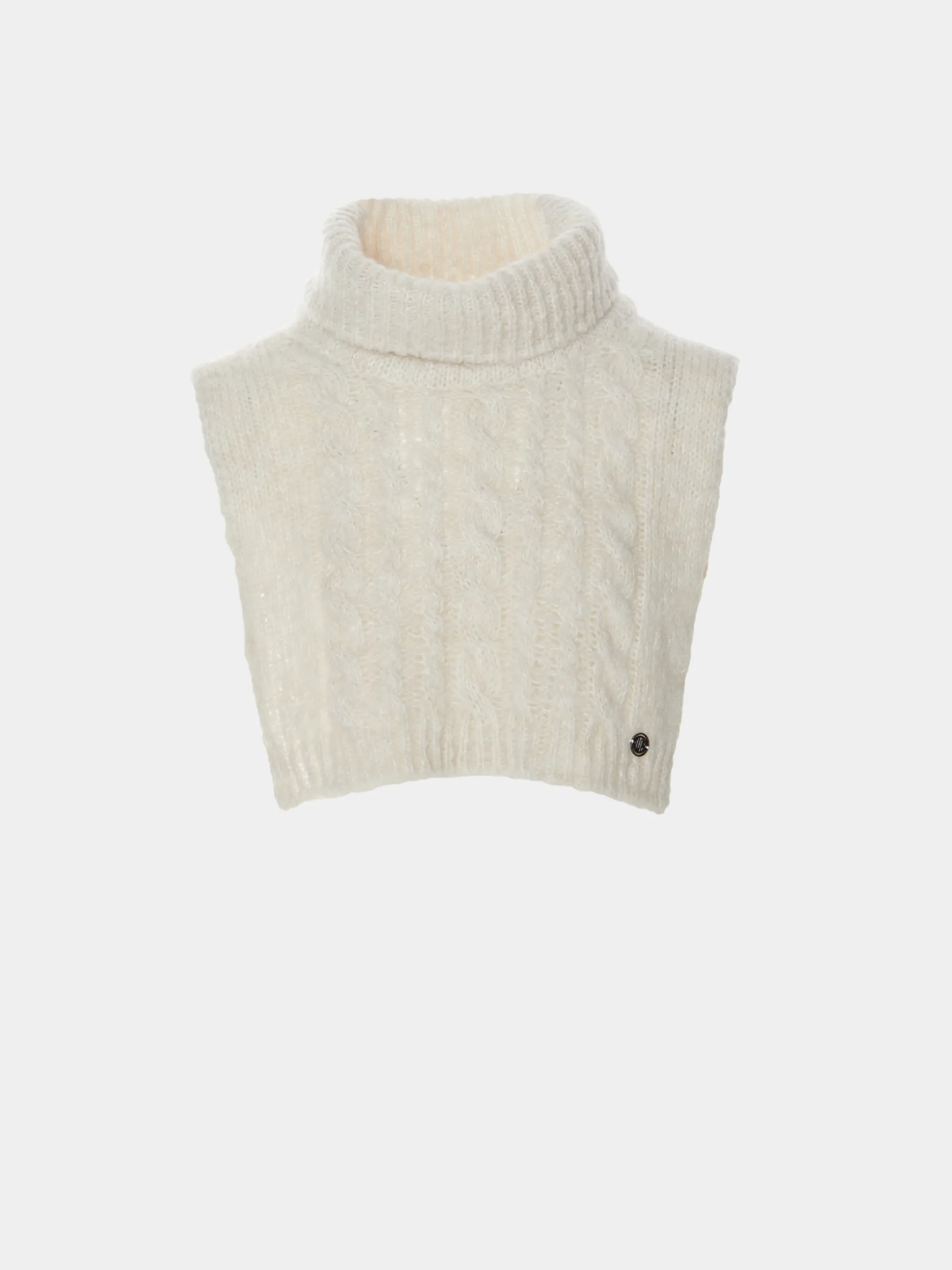 Capa de gola alta confecionada com alpaca e lã. Estrutura trançada.