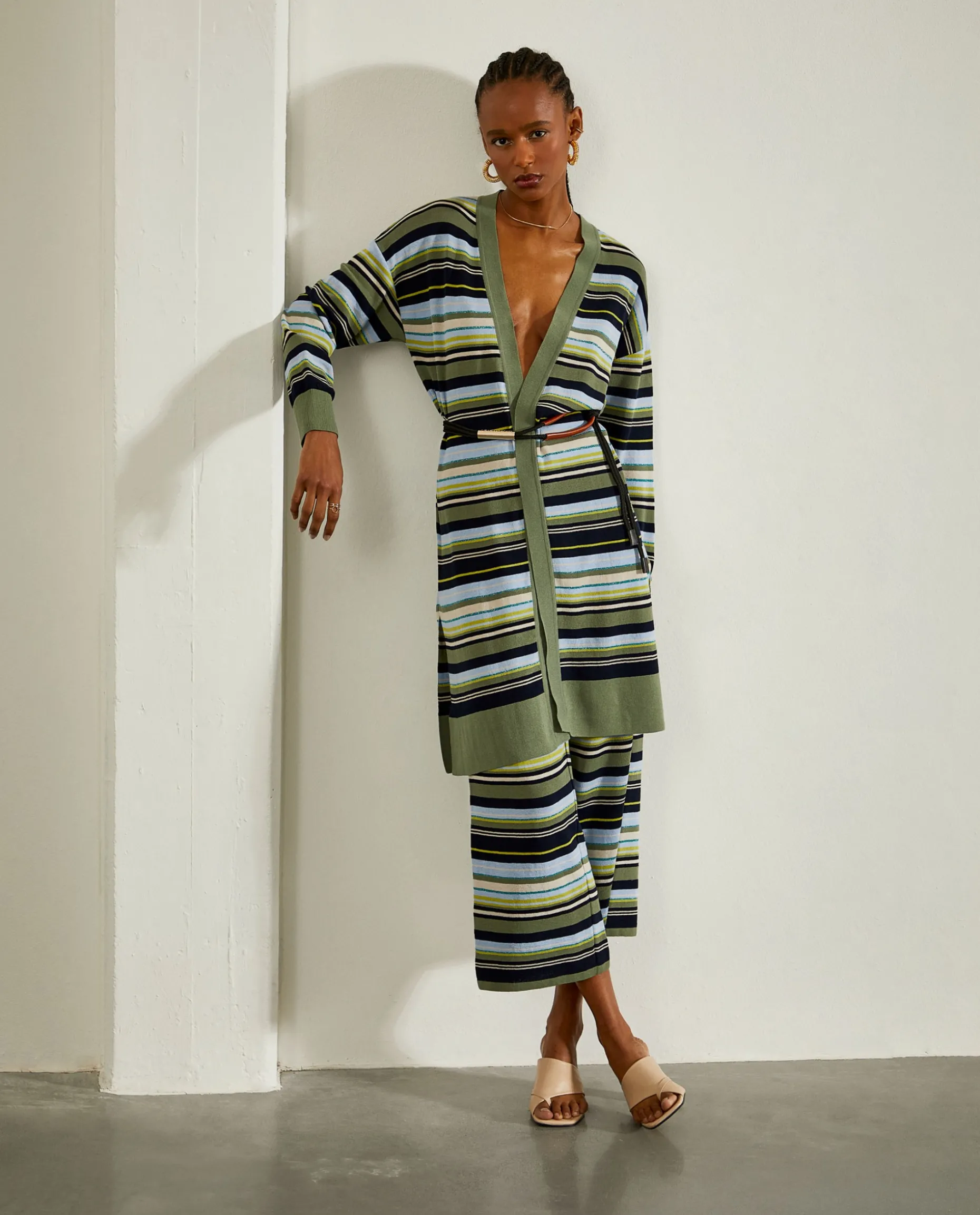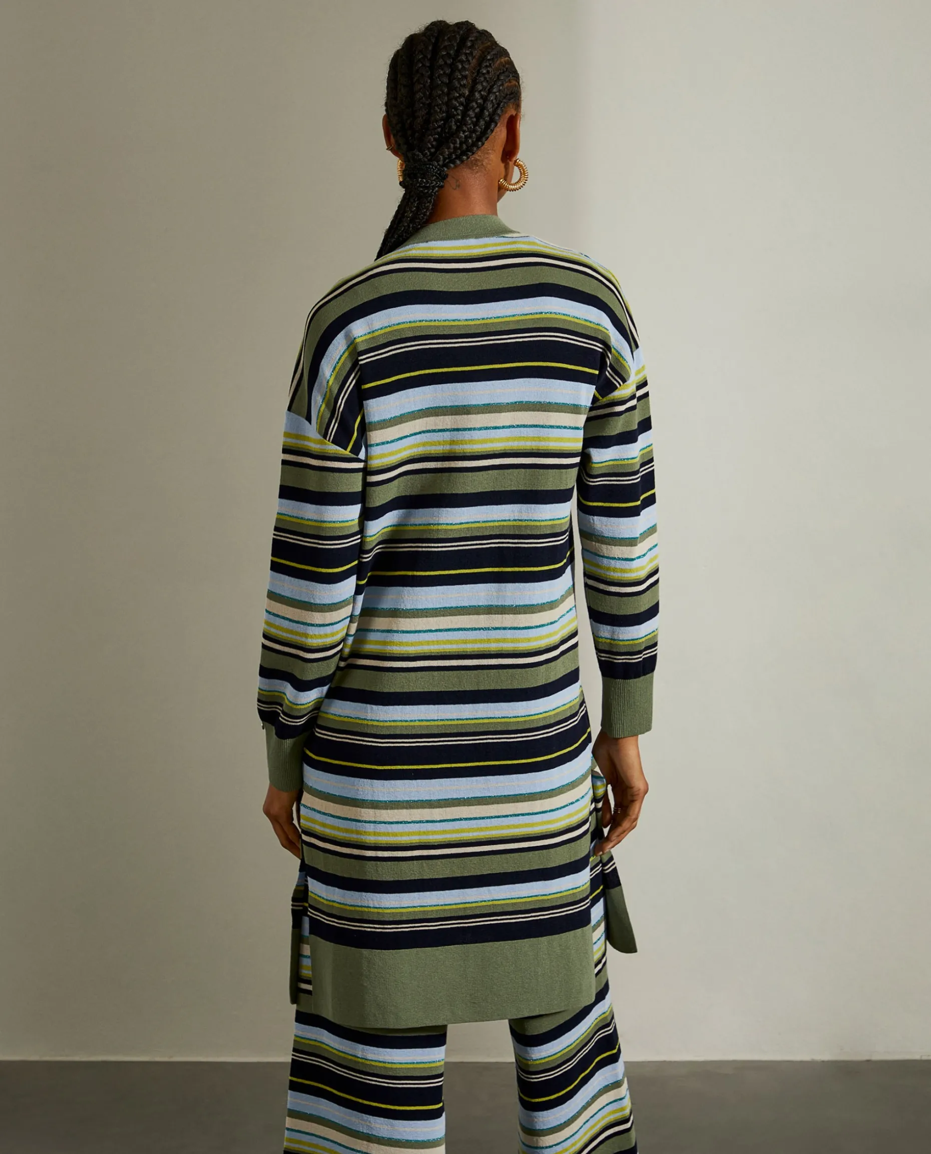 Cardigan de malha às riscas assimétricas macio e confortável confecionado com mistura de algodão. Bainha e punhos rematados com canelado em contraste. Aberturas nas laterais. Possibilidade de calças e colete a combinar, da mesma coleção.