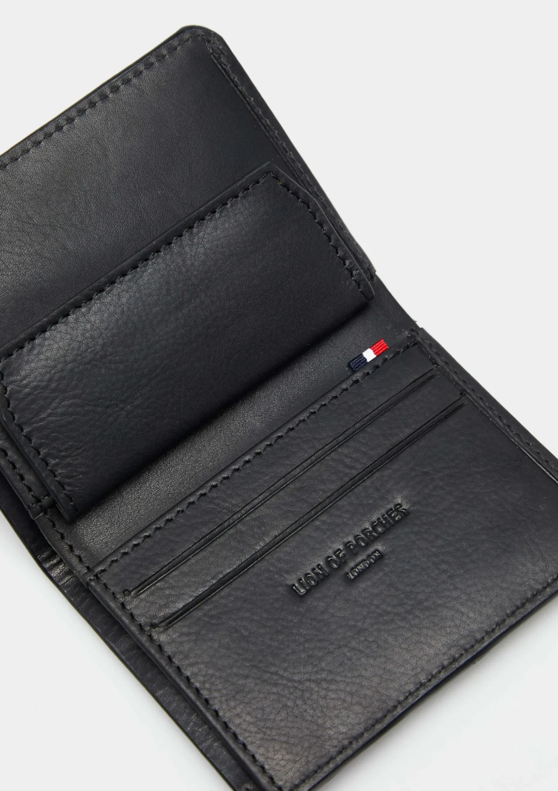 Carteira 100% pele com ranhuras para cartões e compartimentos para moedas. Logotipos gravados e fita corporativa.