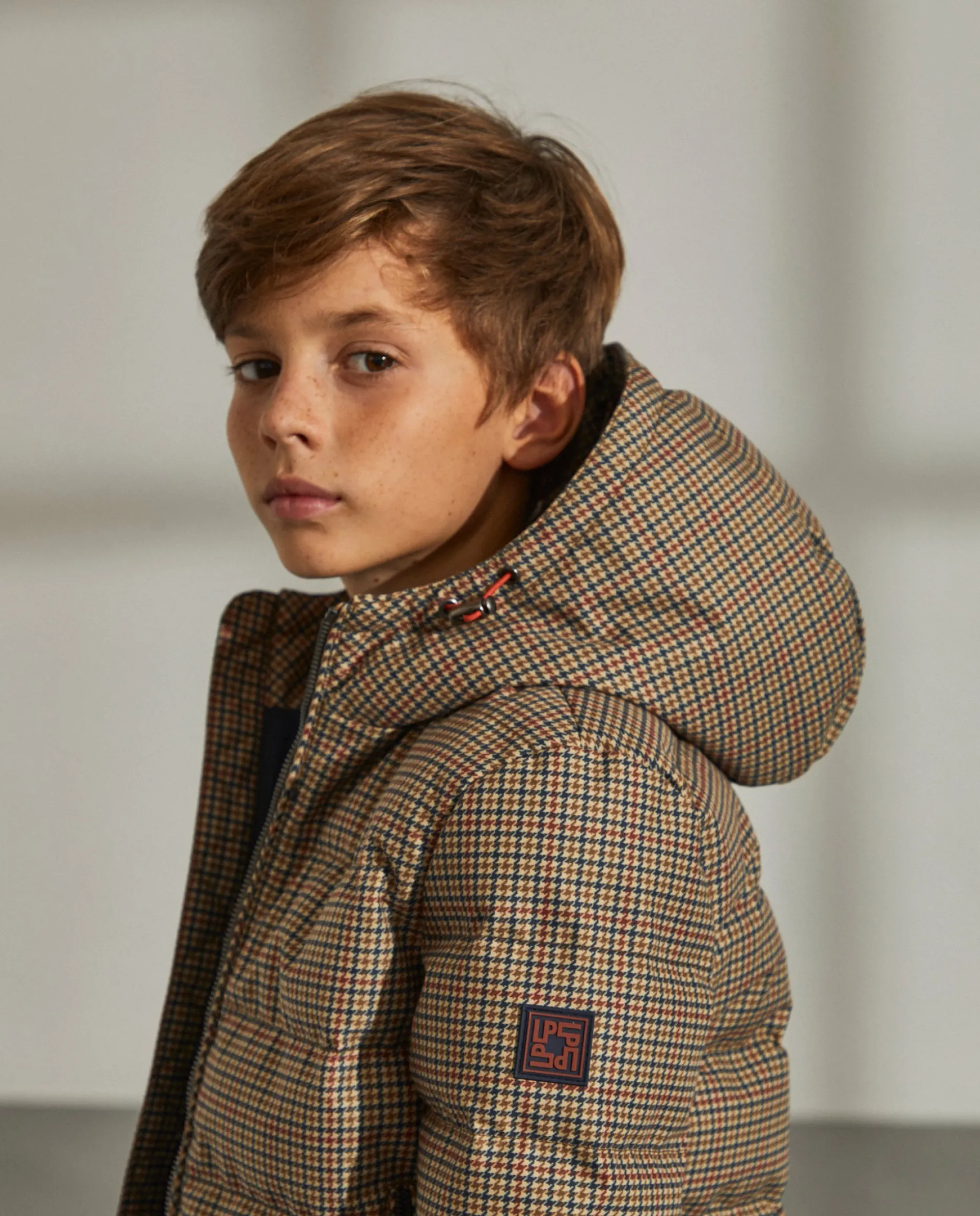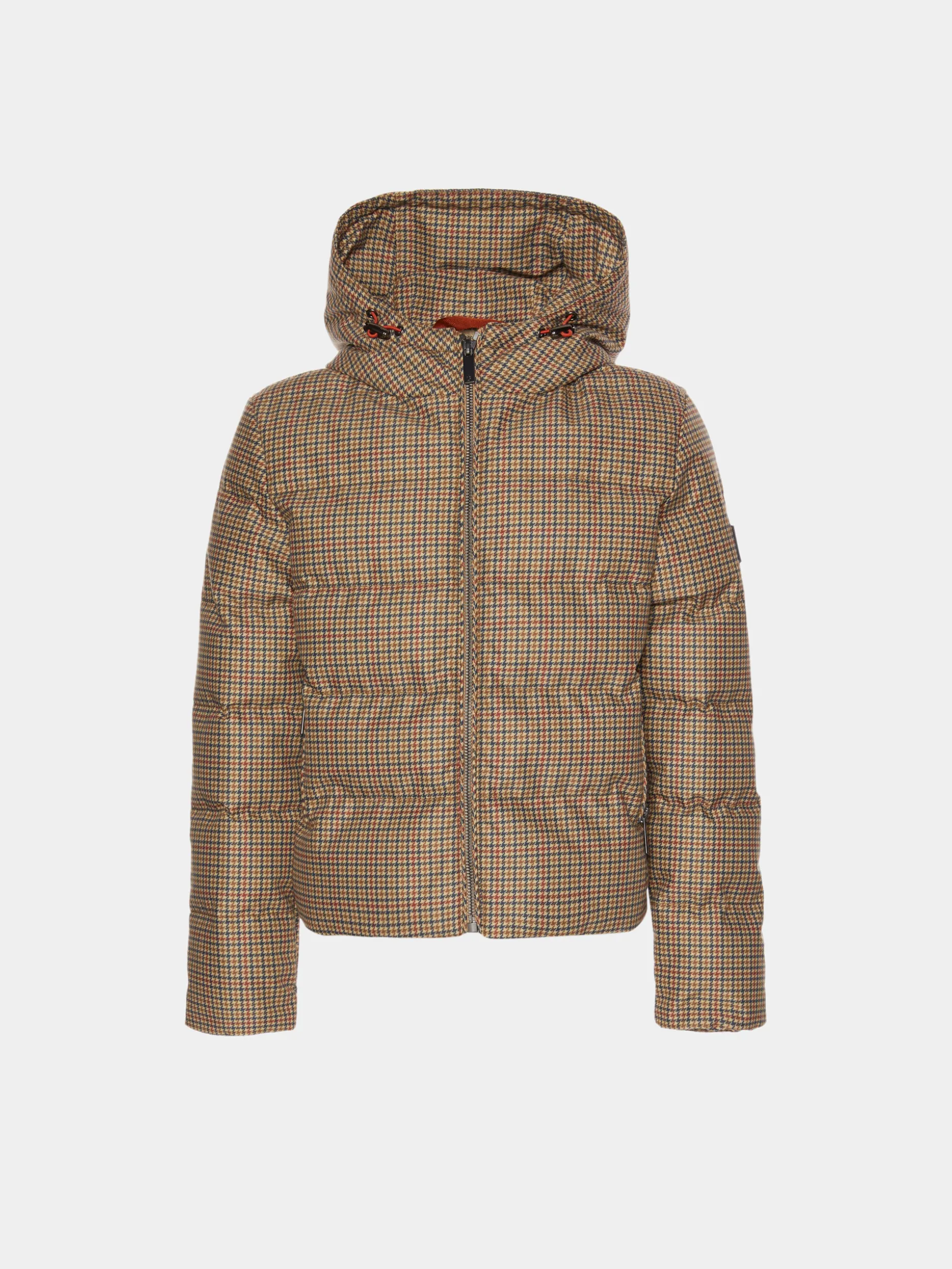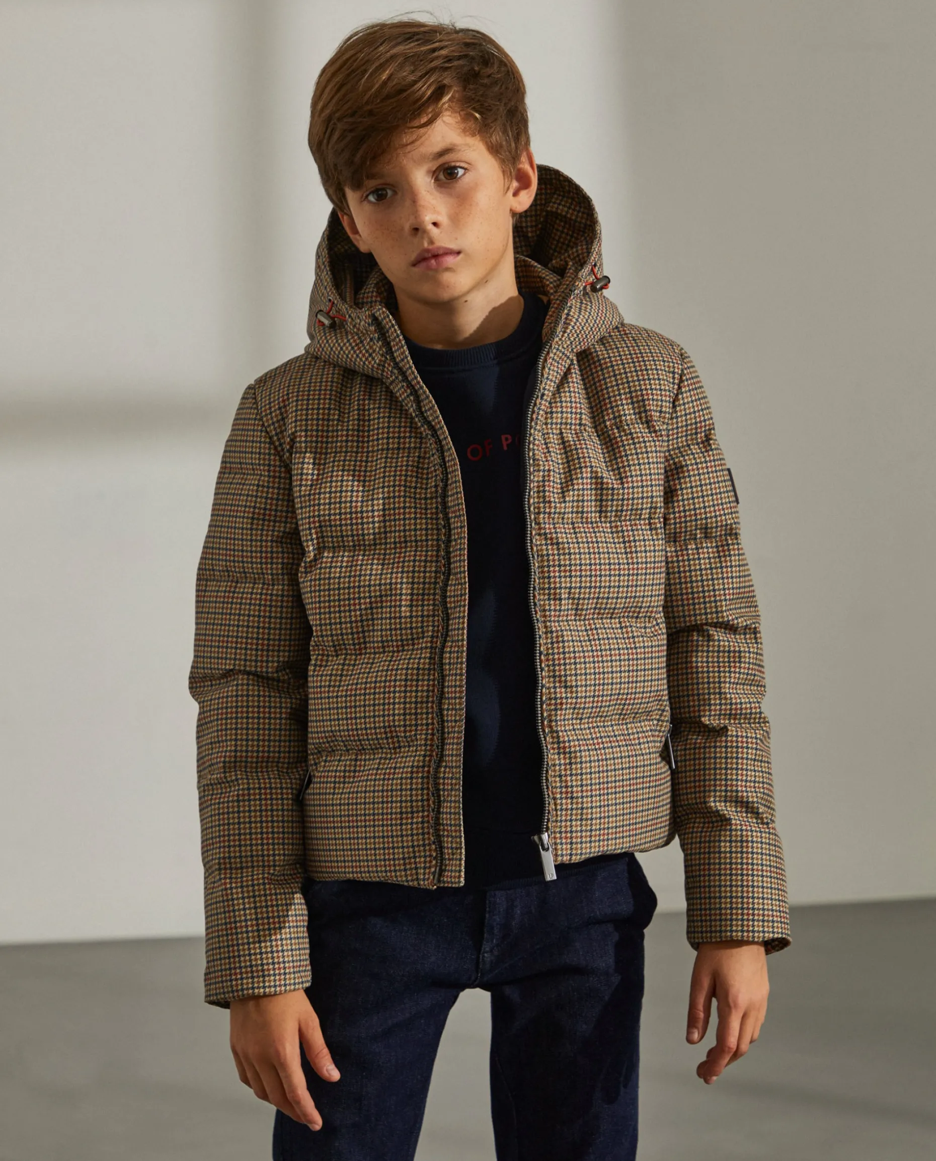 Casaco curto acolchoado. Padrão de micro xadrez. Dois bolsos laterais. Aperta com fecho. Capuz ajustável por cordão.