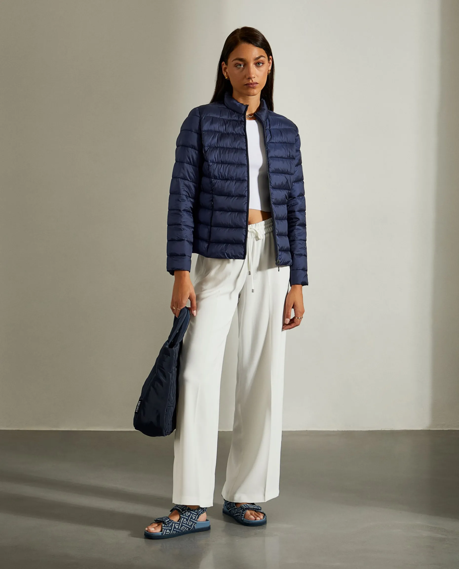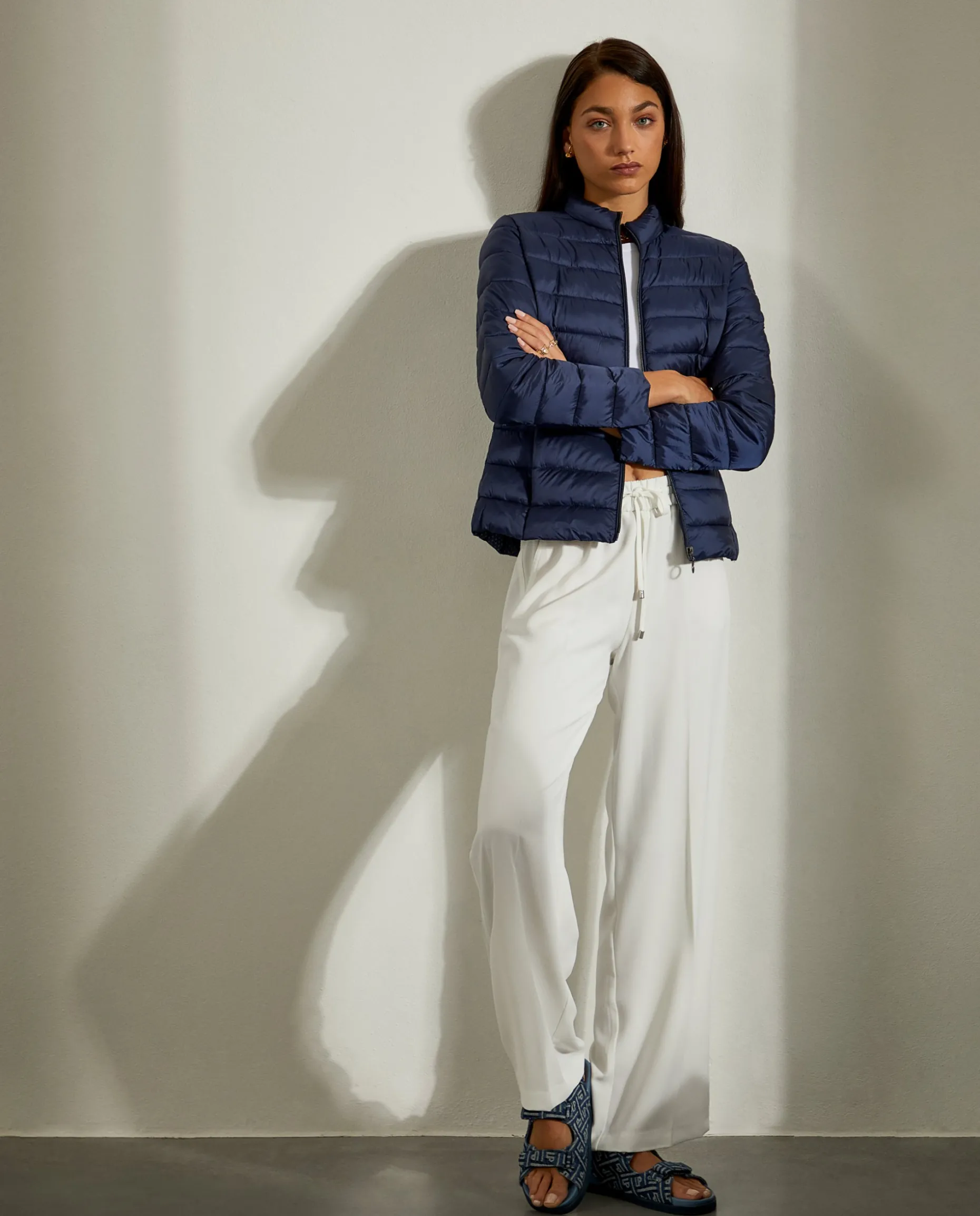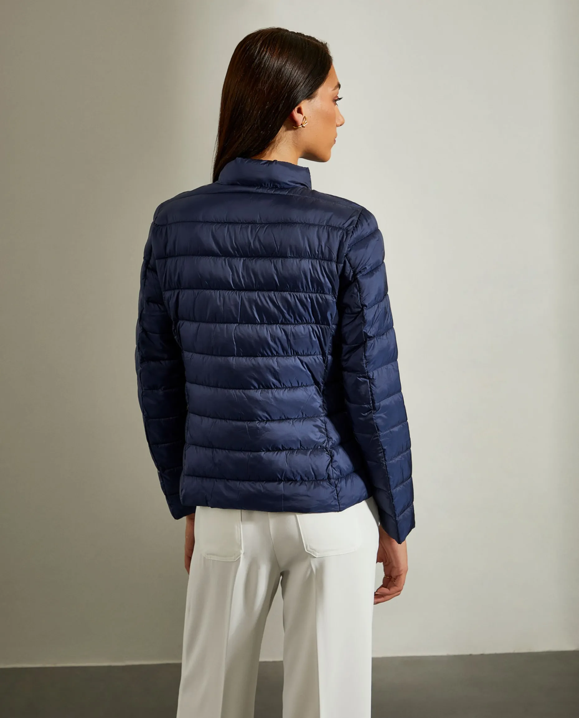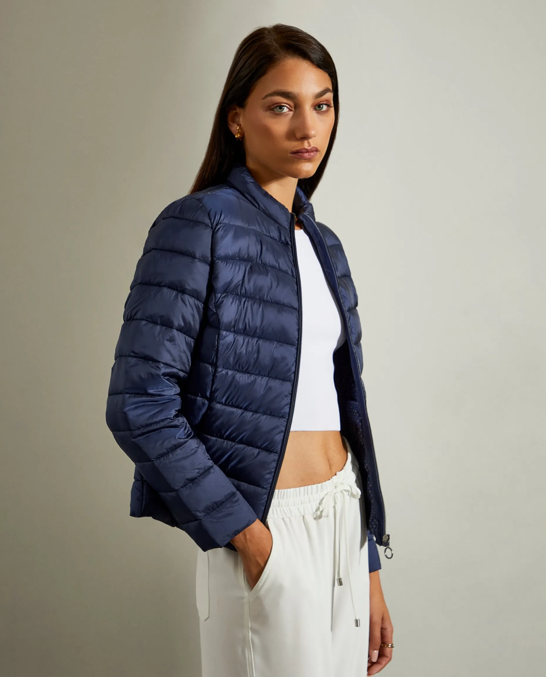 Casaco acolchoado curto de fit justo. Aperta com fecho na frente. Dois bolsos na frente.