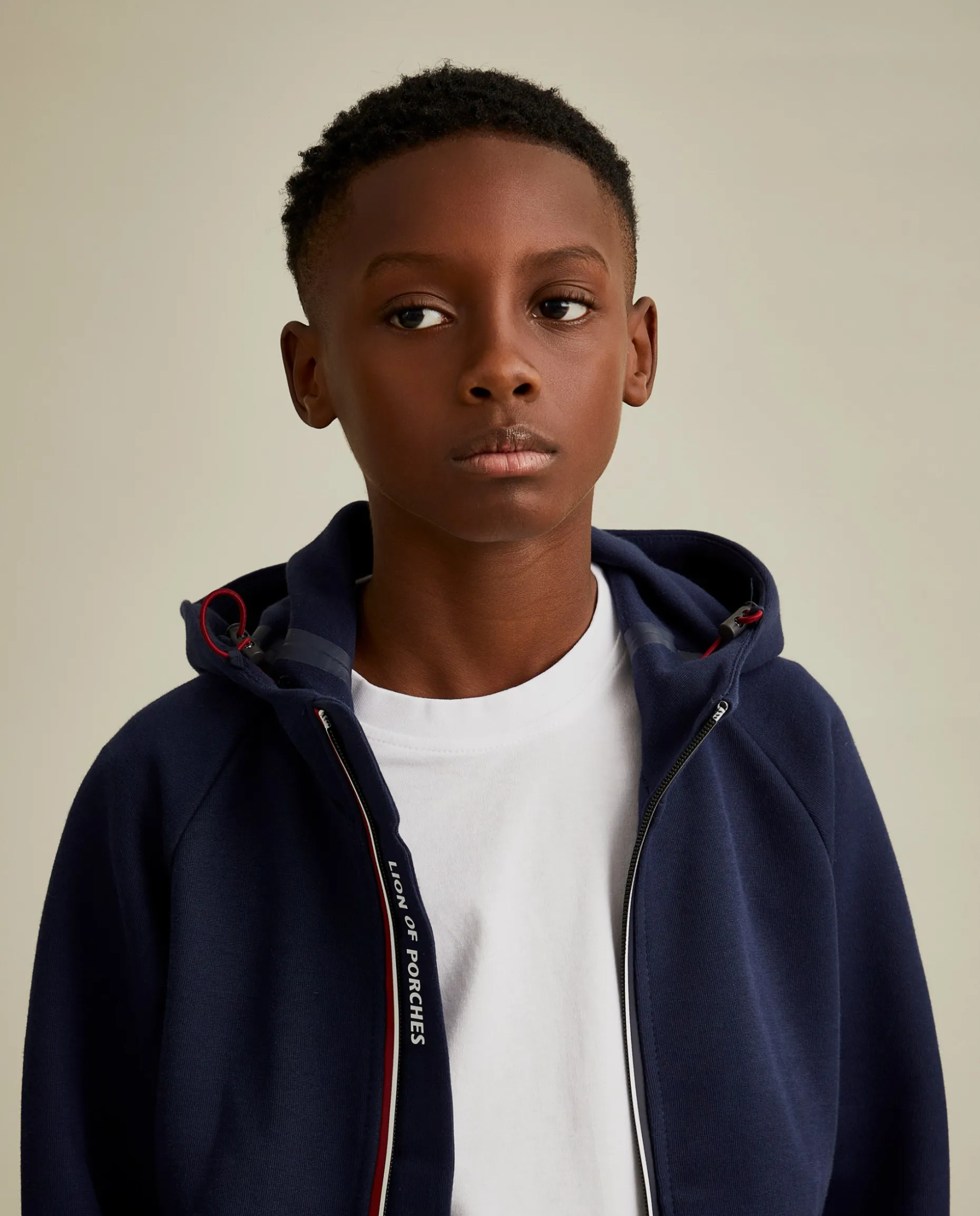 Este casaco desportivo é ideal para os dias mais casuais. Com um capuz ajustável por elásticos, aperta na frente com um fecho contrastante. É finalizado com riscas nos punhos e nos bolsos.