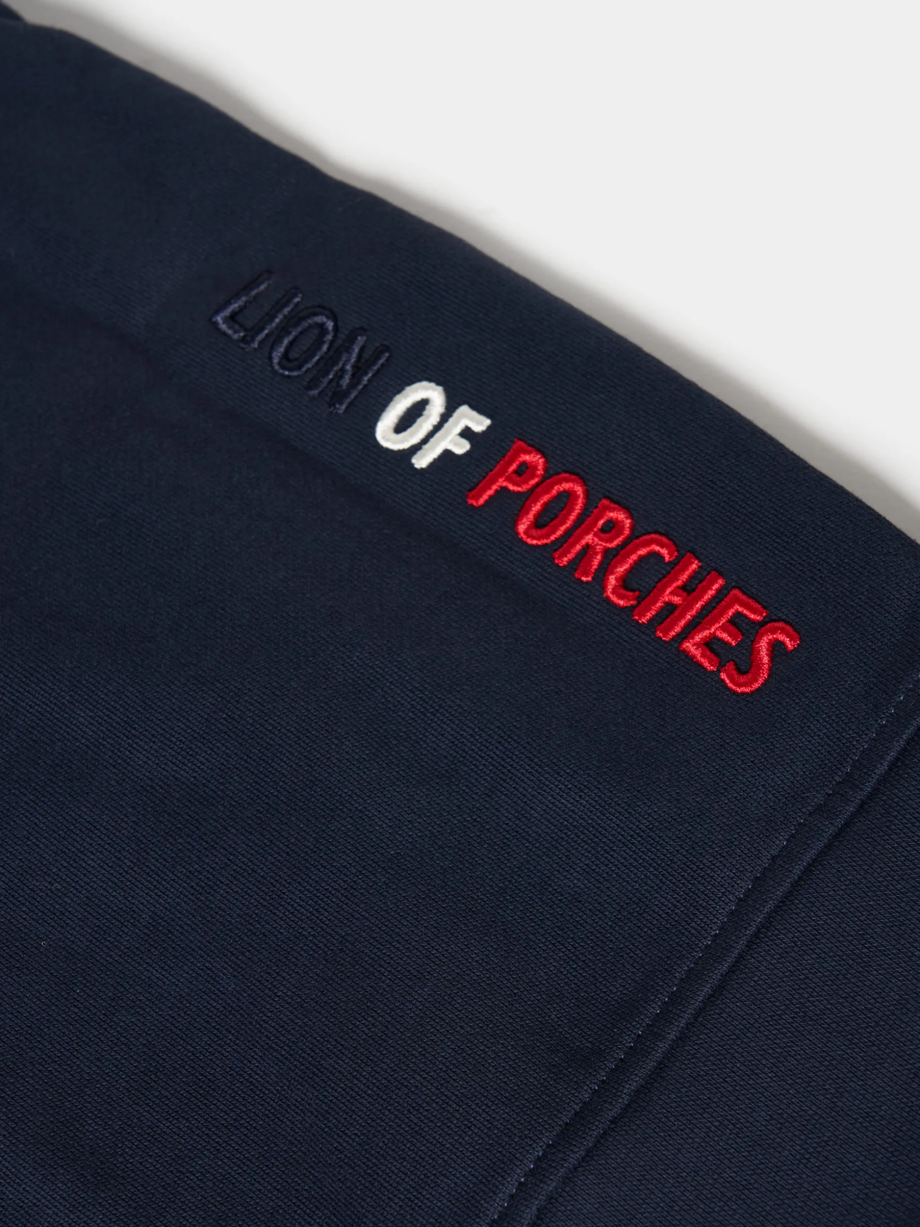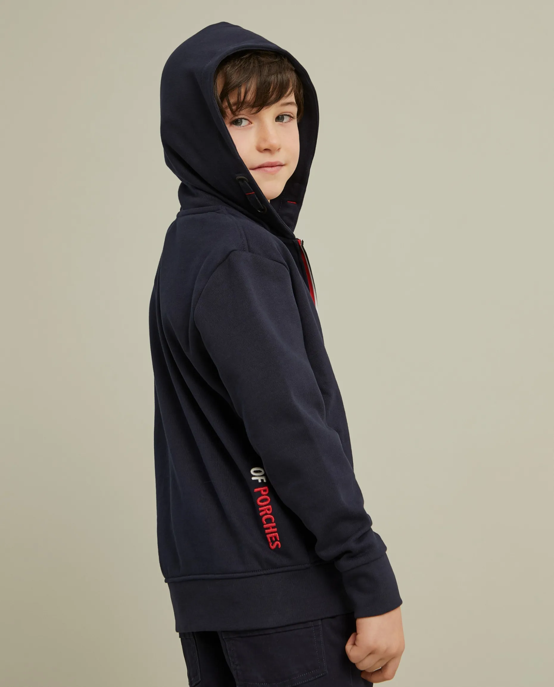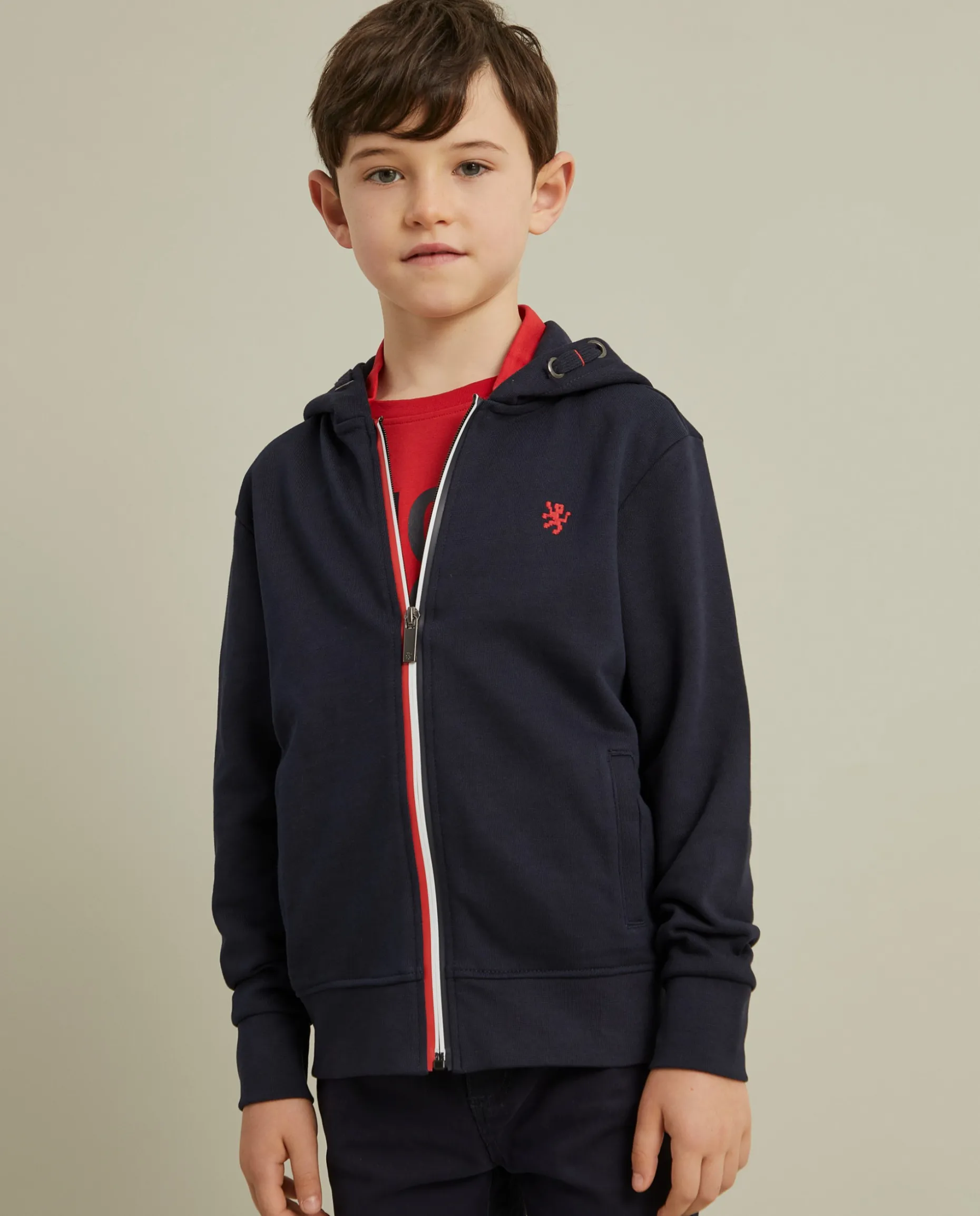 Casaco de malha, de manga comprida, com capuz. Abre na frente com fecho zíper oculto por carcela vulcanizada tricolor. Com bolsos laterais e leão da marca em contraste no peito.