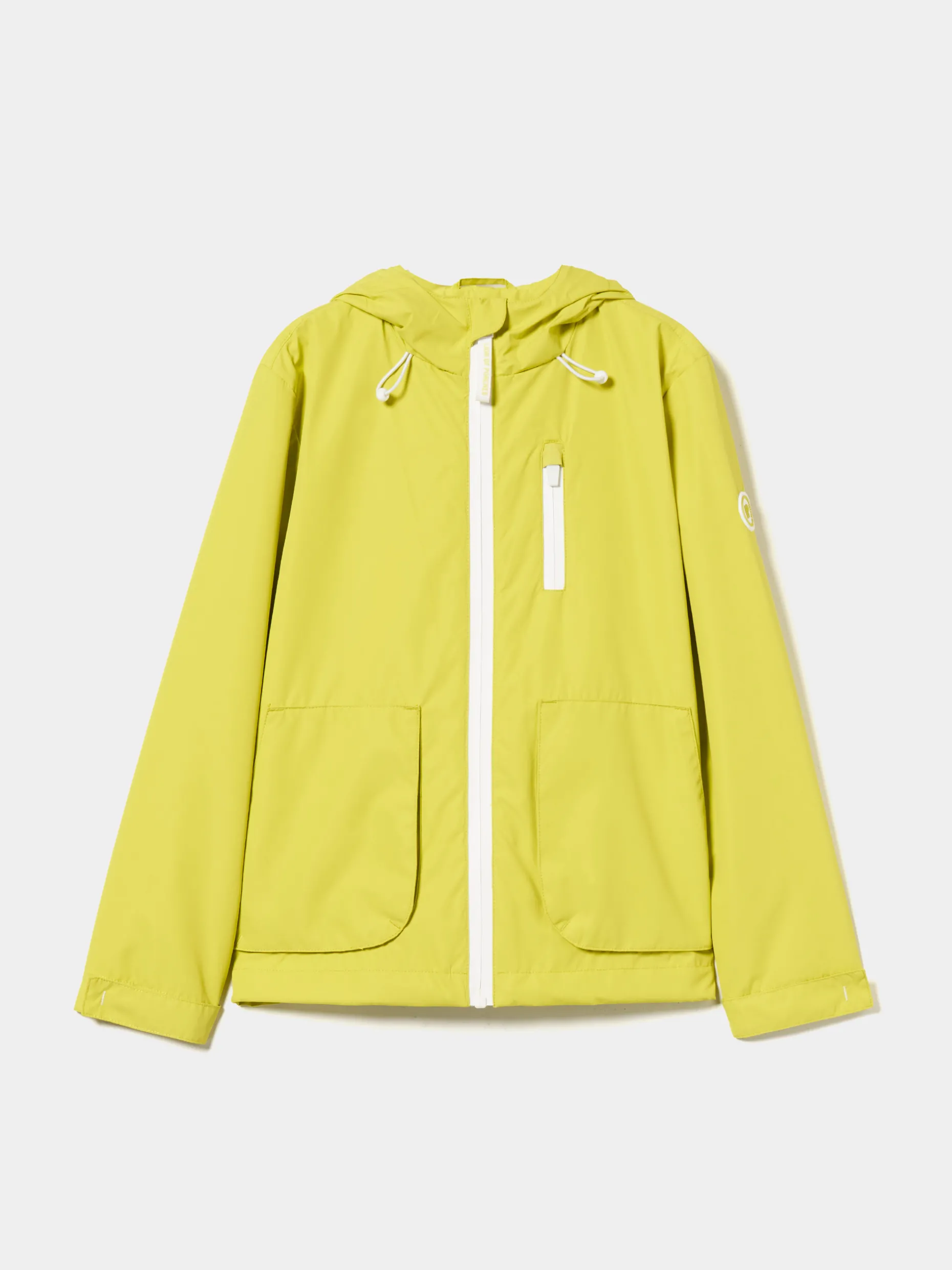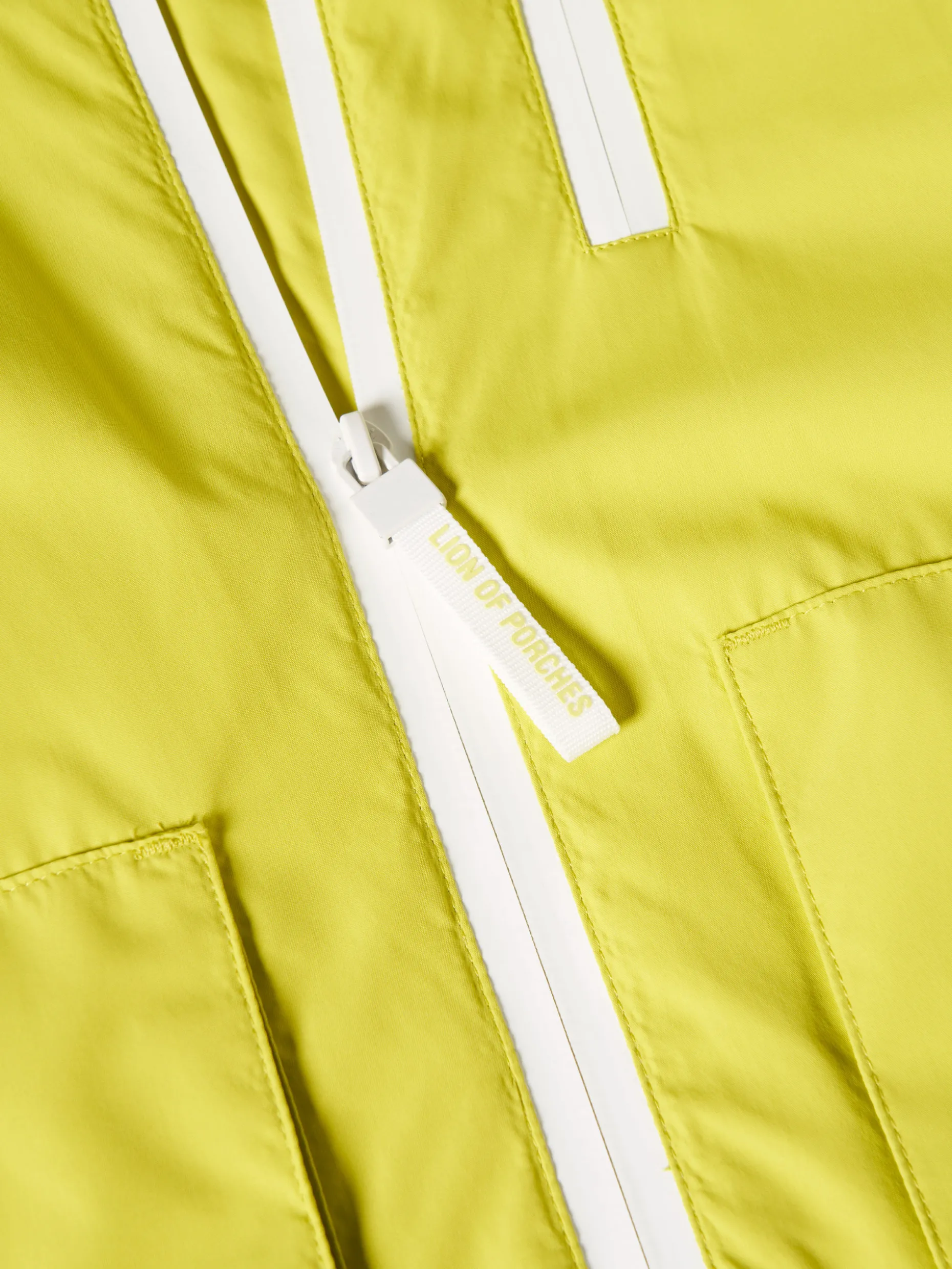 Casaco com capuz com fechos brancos. Estampado Lion of Porches no interior. Etiqueta personalizada na manga.