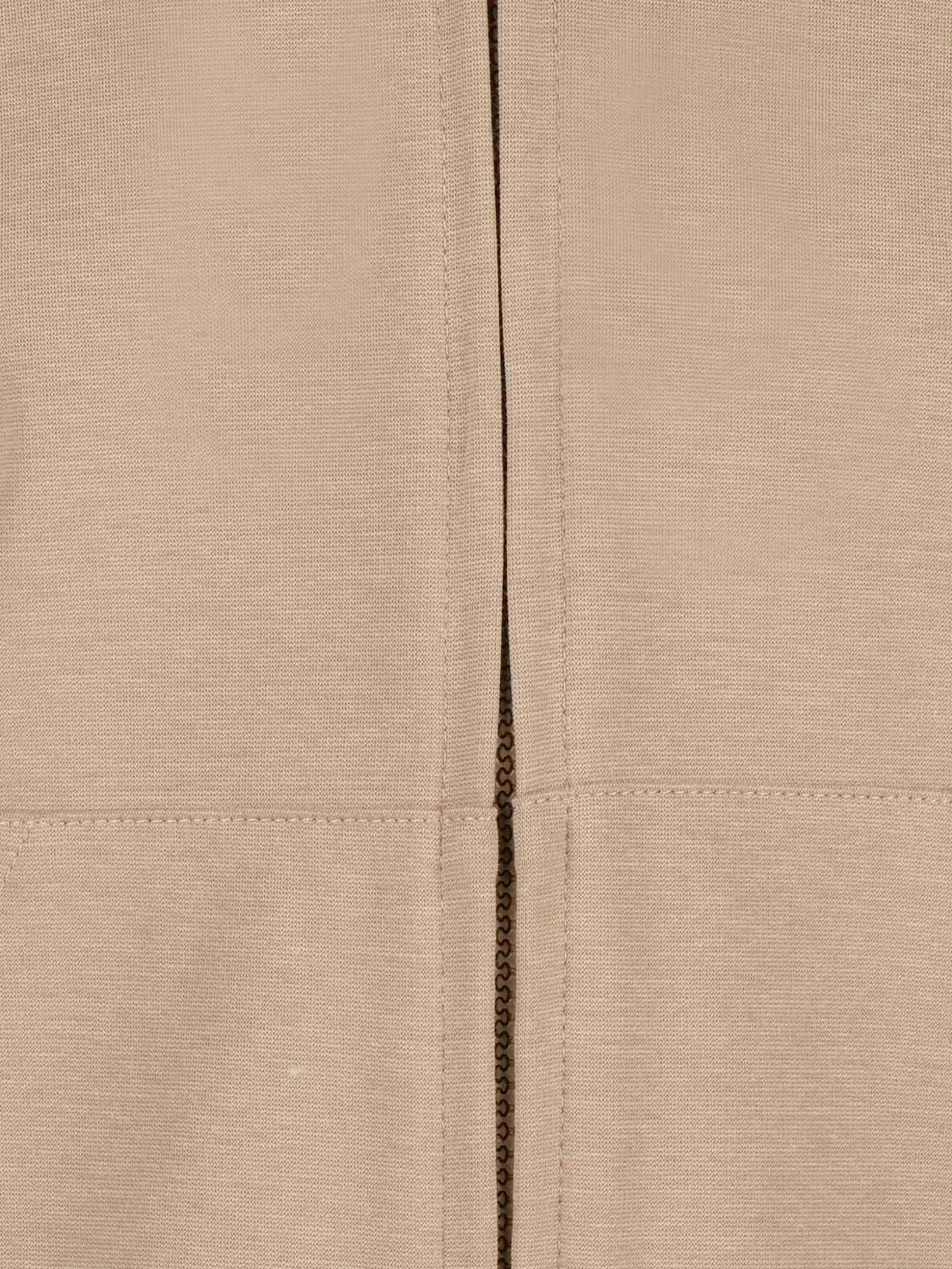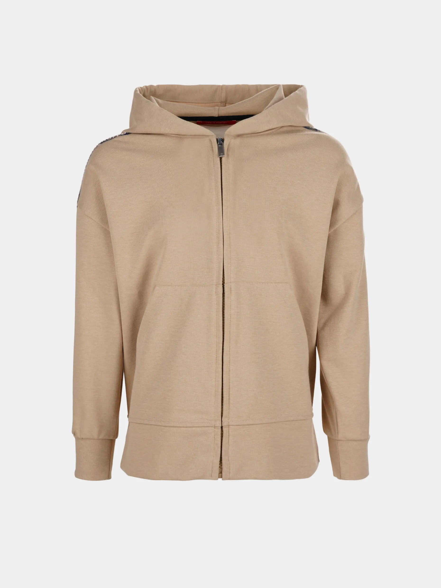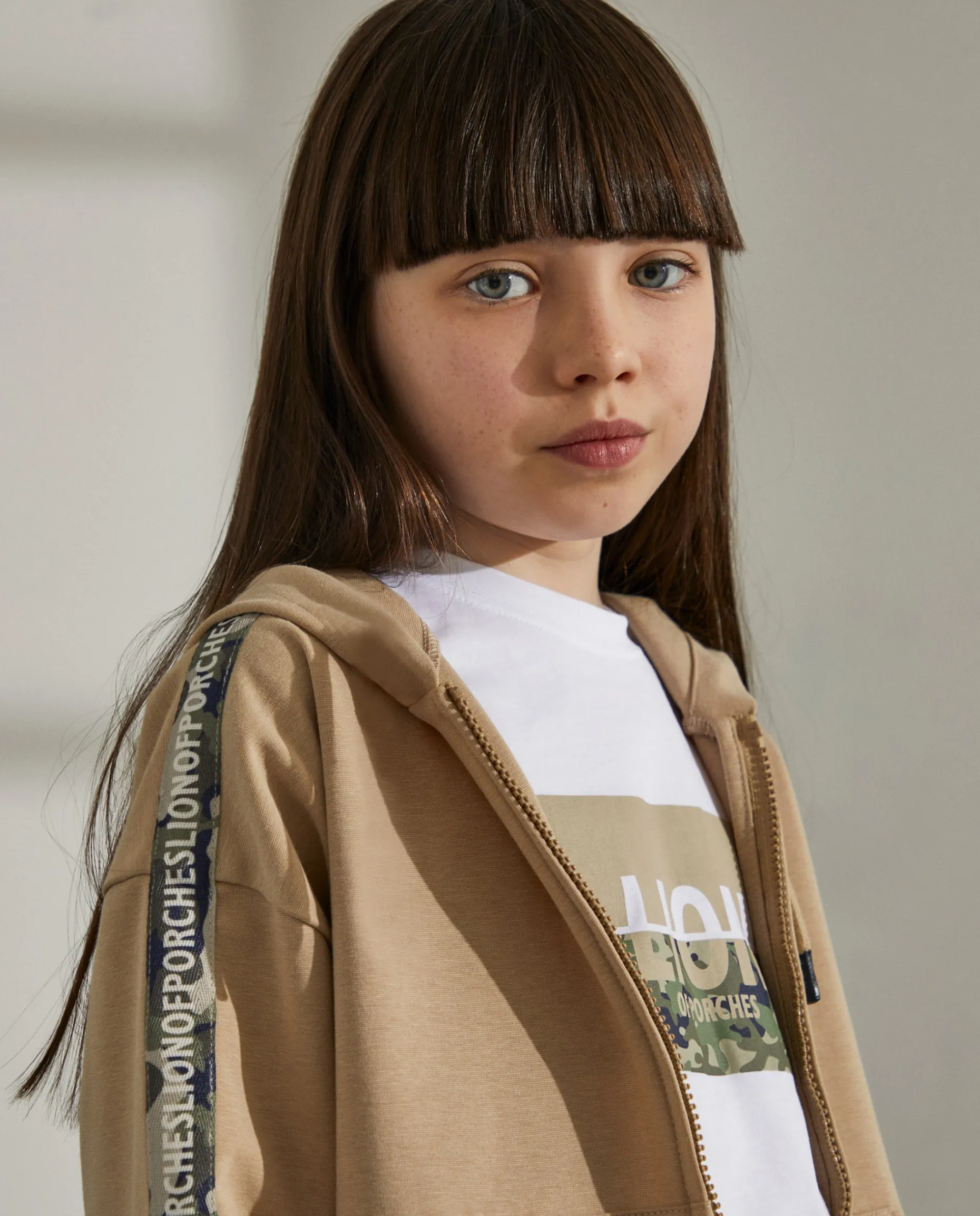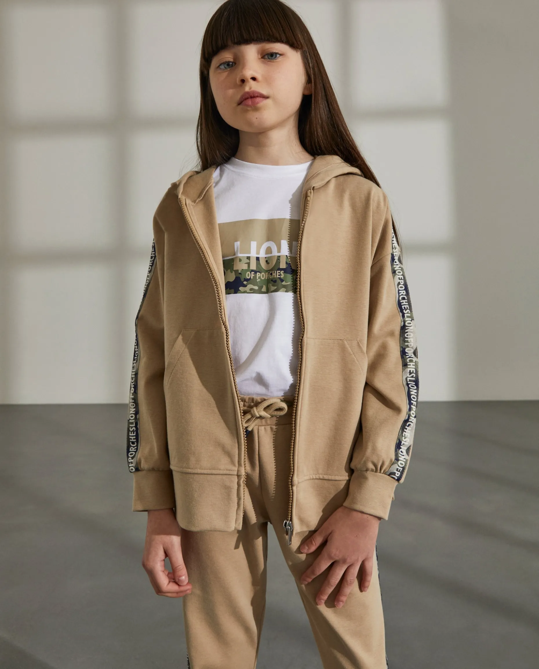 Casaco com capuz em malha com fita estampada personalizada nas mangas. Cordões na mesma cor com ponteiras bicolores.