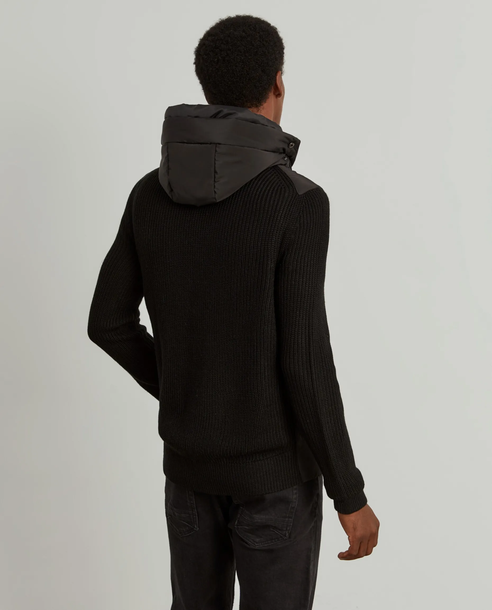 Casaco de malha com frente e capuz acolchoados. Uma escolha quente e confortável para um look leve e descontraído. Aperta através de fecho de correr, tal como os bolsos frontais. O capuz é ajustável através de reguladores. Finaliza com etiqueta de borracha da marca no peito. Bolso também no interior.