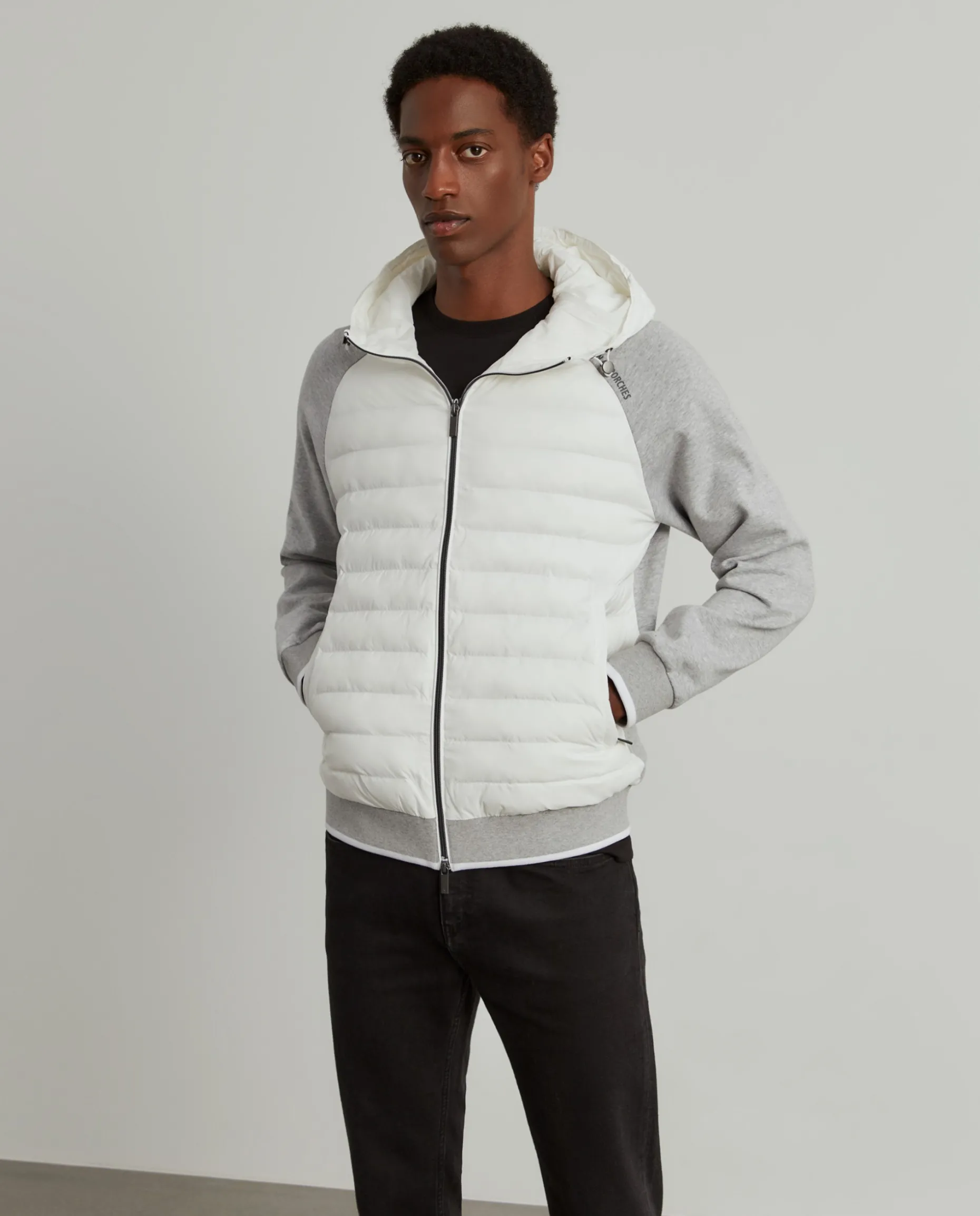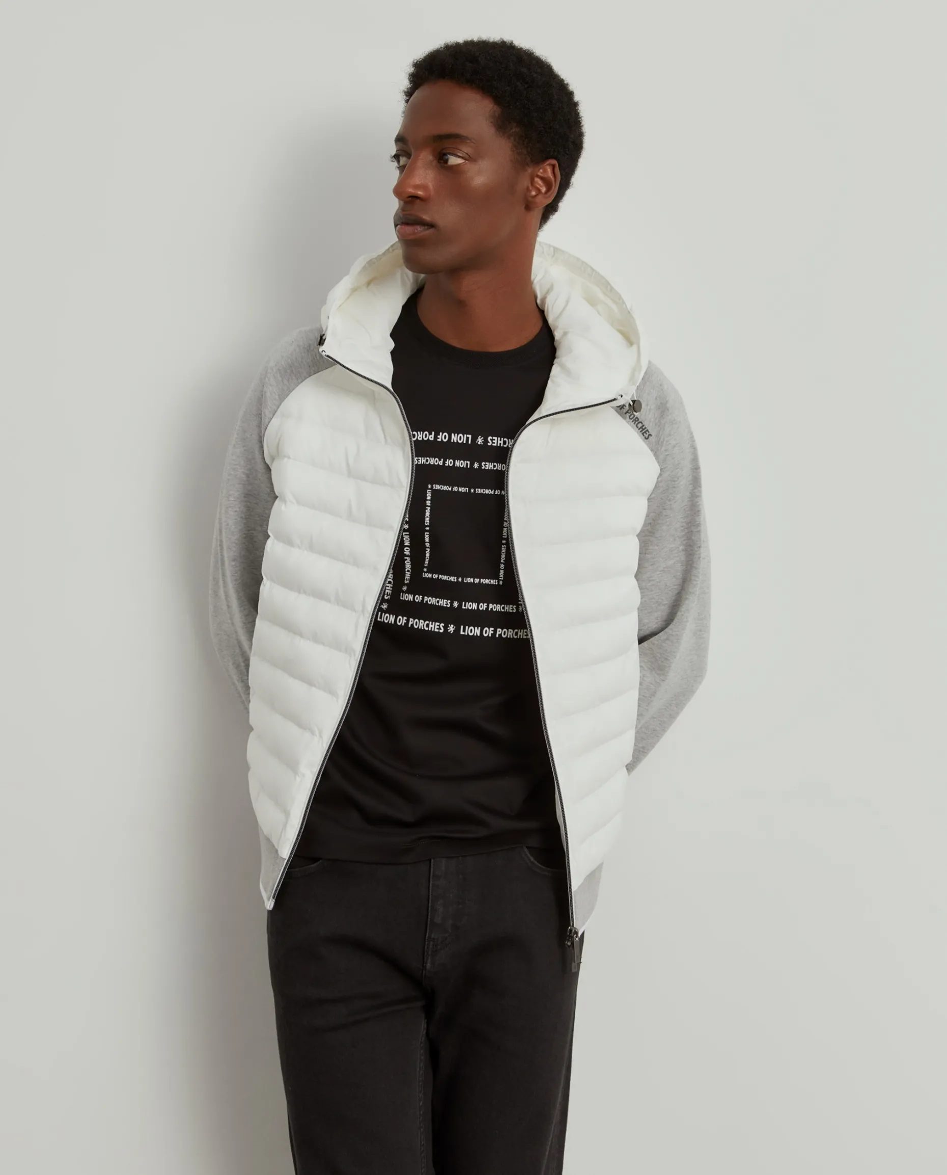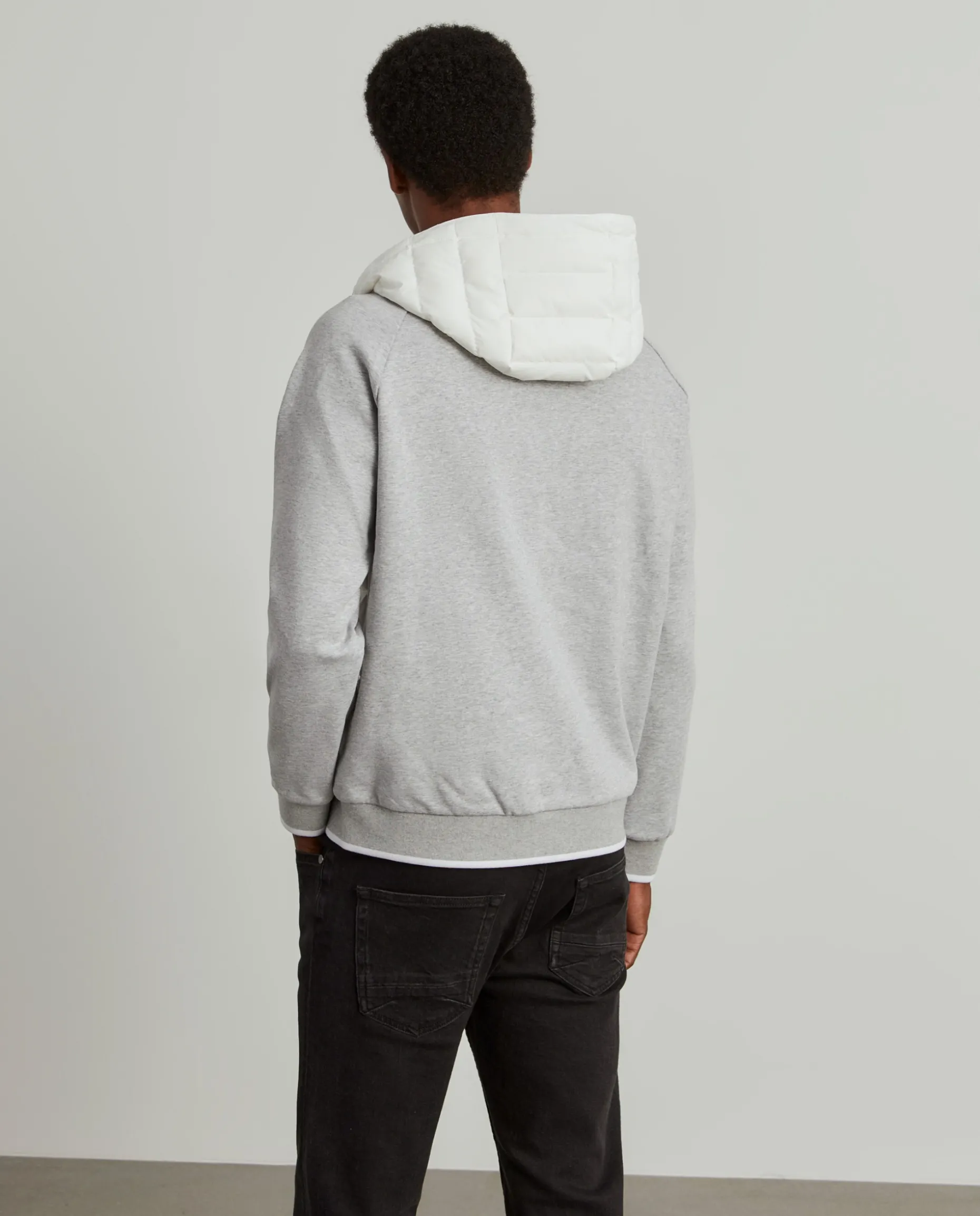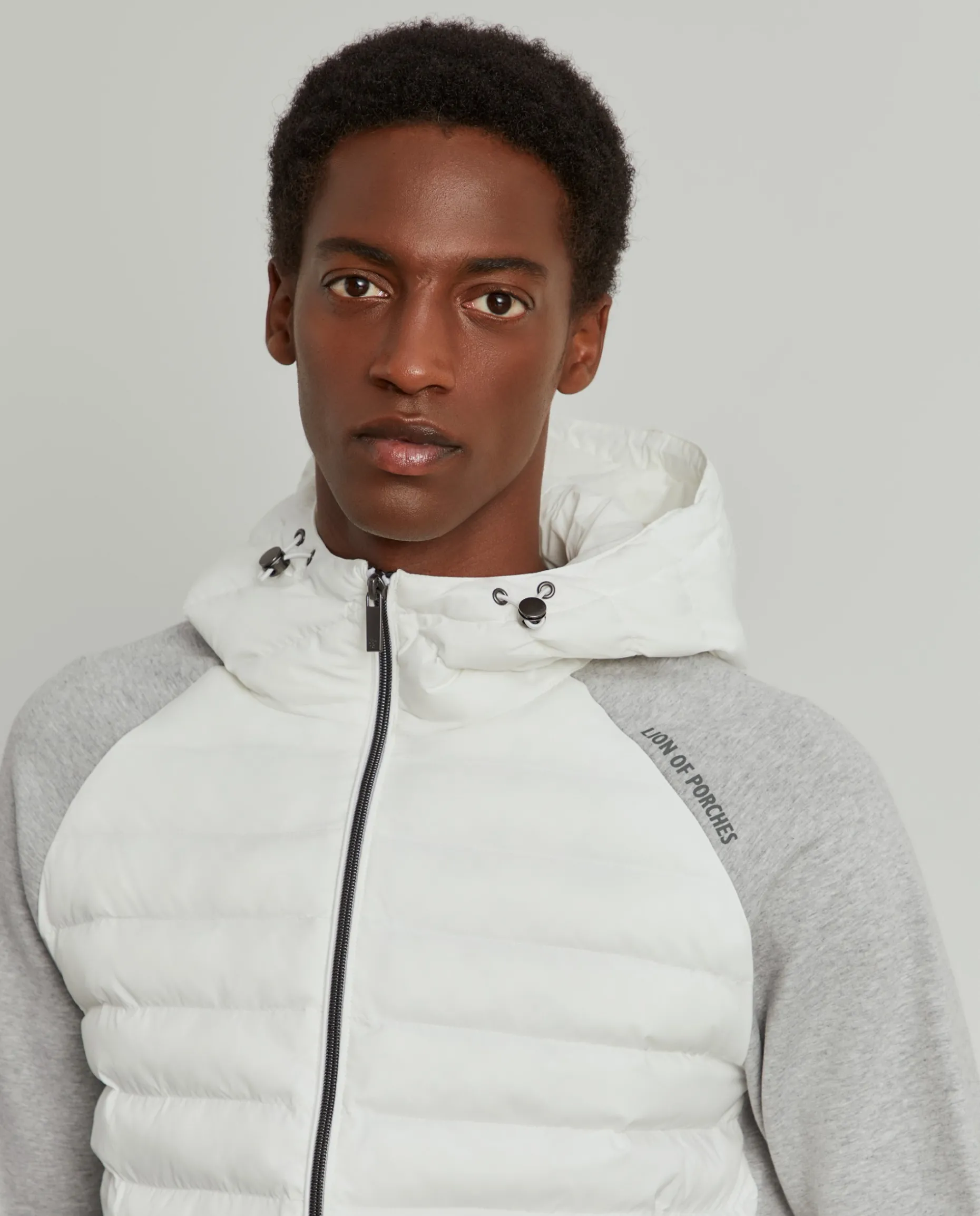 Adicione uma camada extra quente e confortável ao seu look mais descontraído com este casaco de malha combinado com frente e capuz acolchoados. Aperta através de fecho de correr de duplo cursor. O capuz é ajustável. Pormenores canelados na base e punhos que finalizam com risca em contraste. Conta ainda com bolsos laterais.