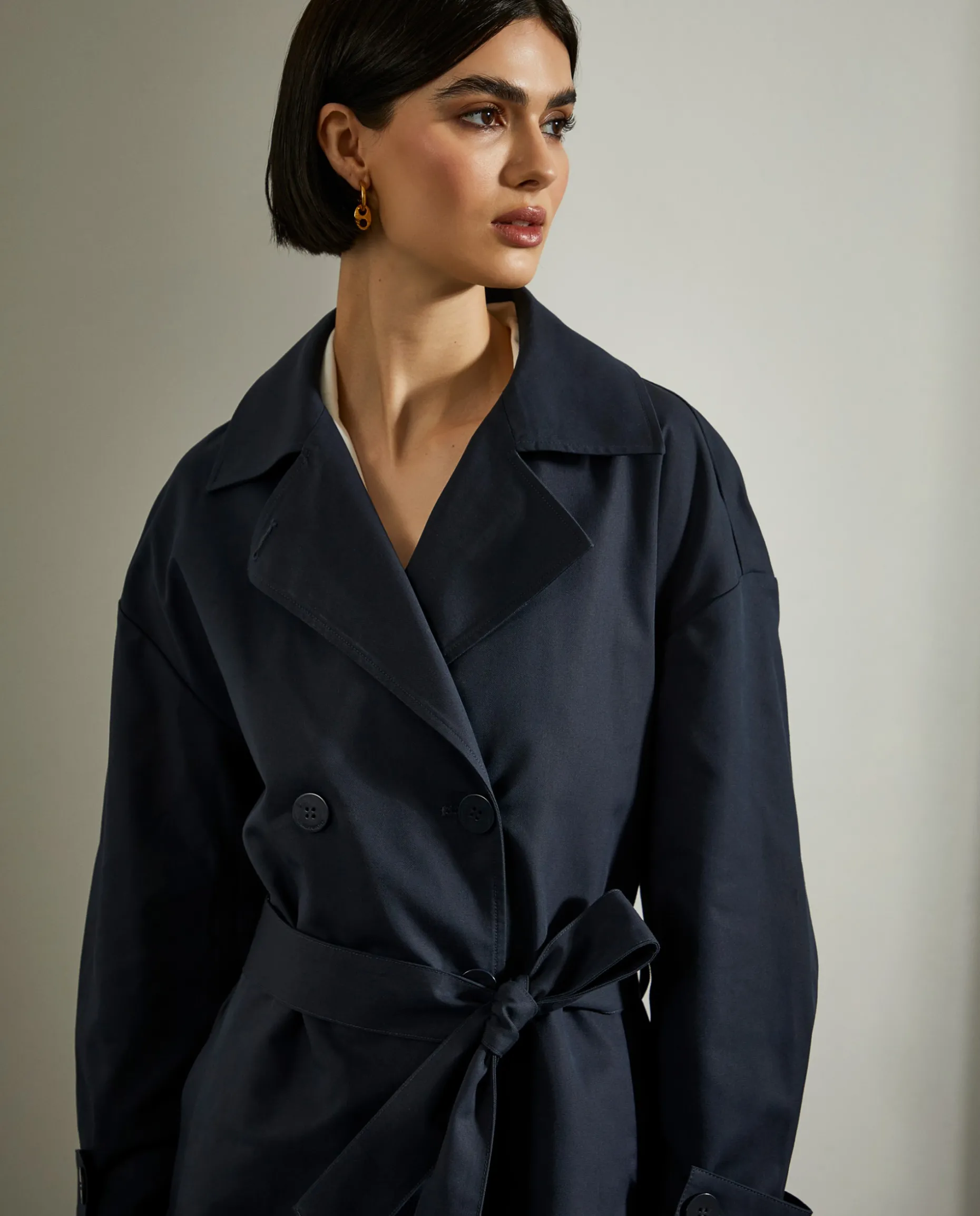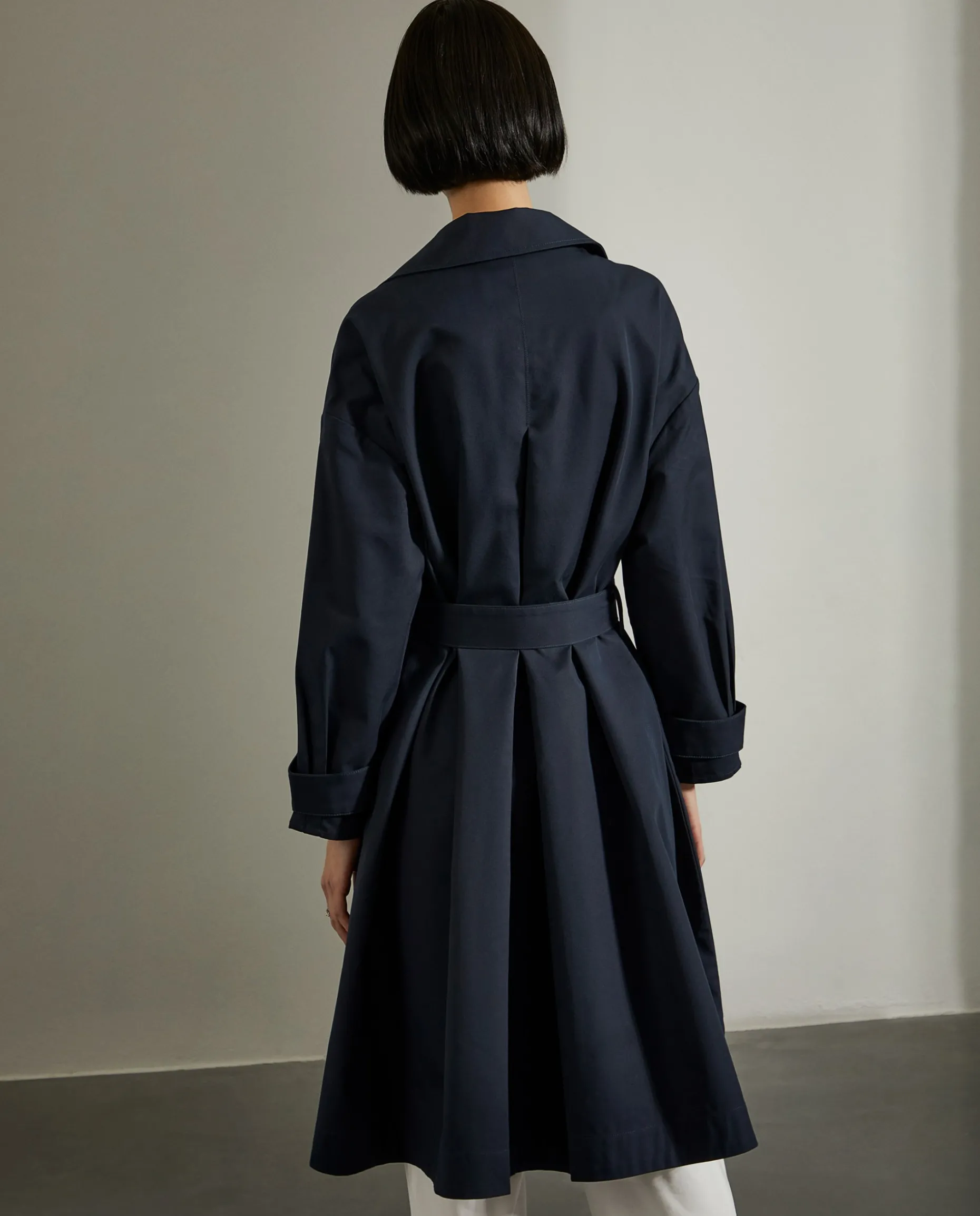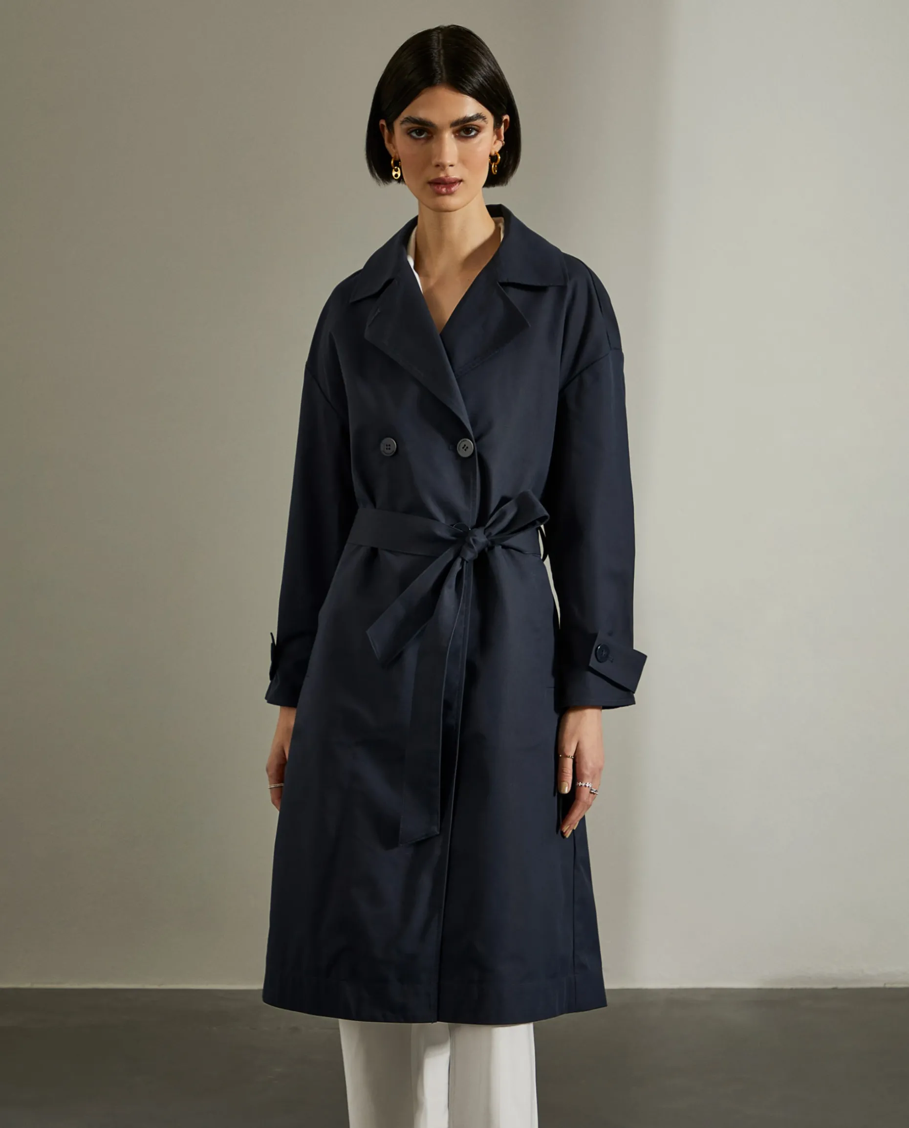 Casaco comprido, estilo gabardine, com trespasse de 4 botões. Bolsos de vivo na frente e cinto a ajustar o casaco nas costas.