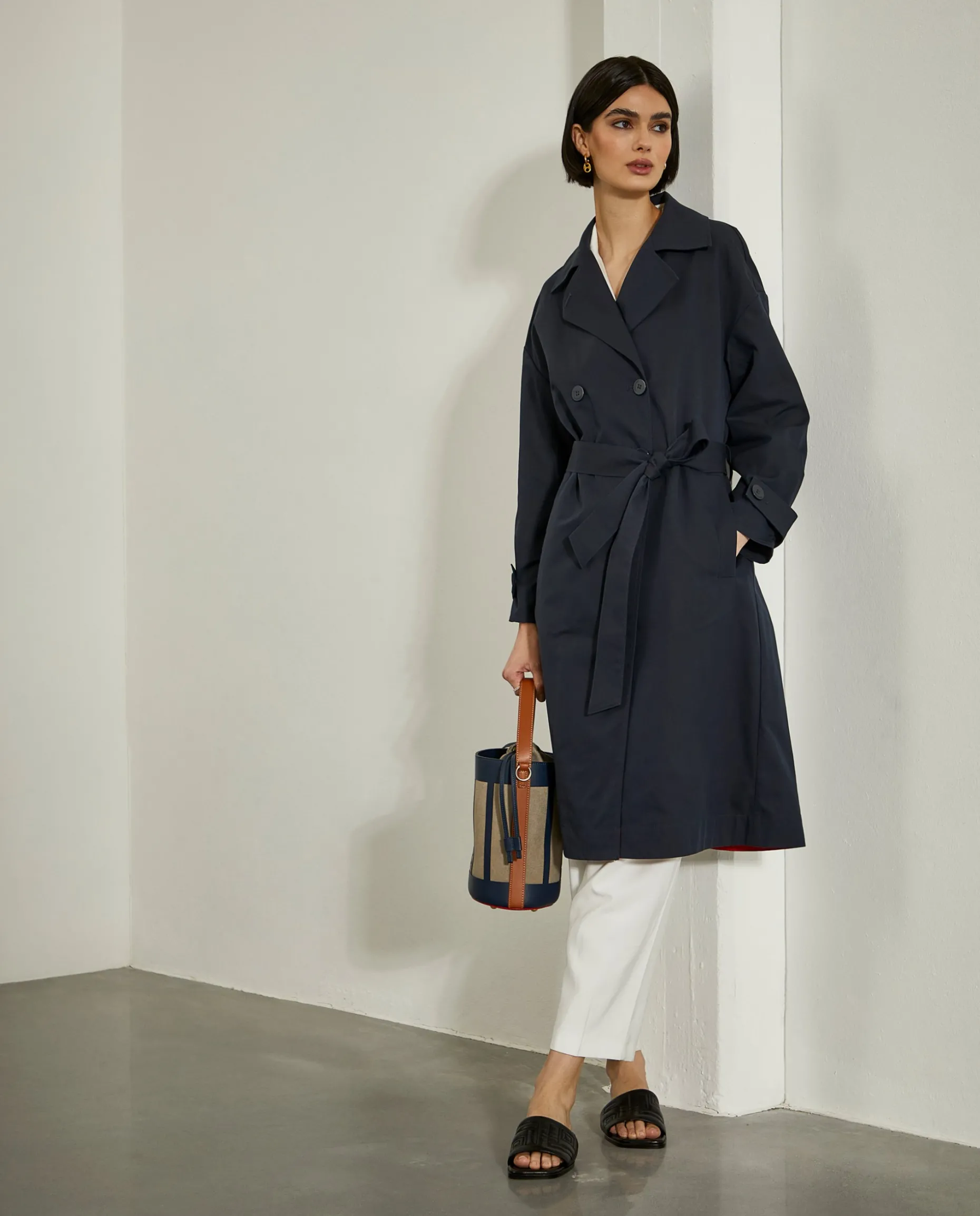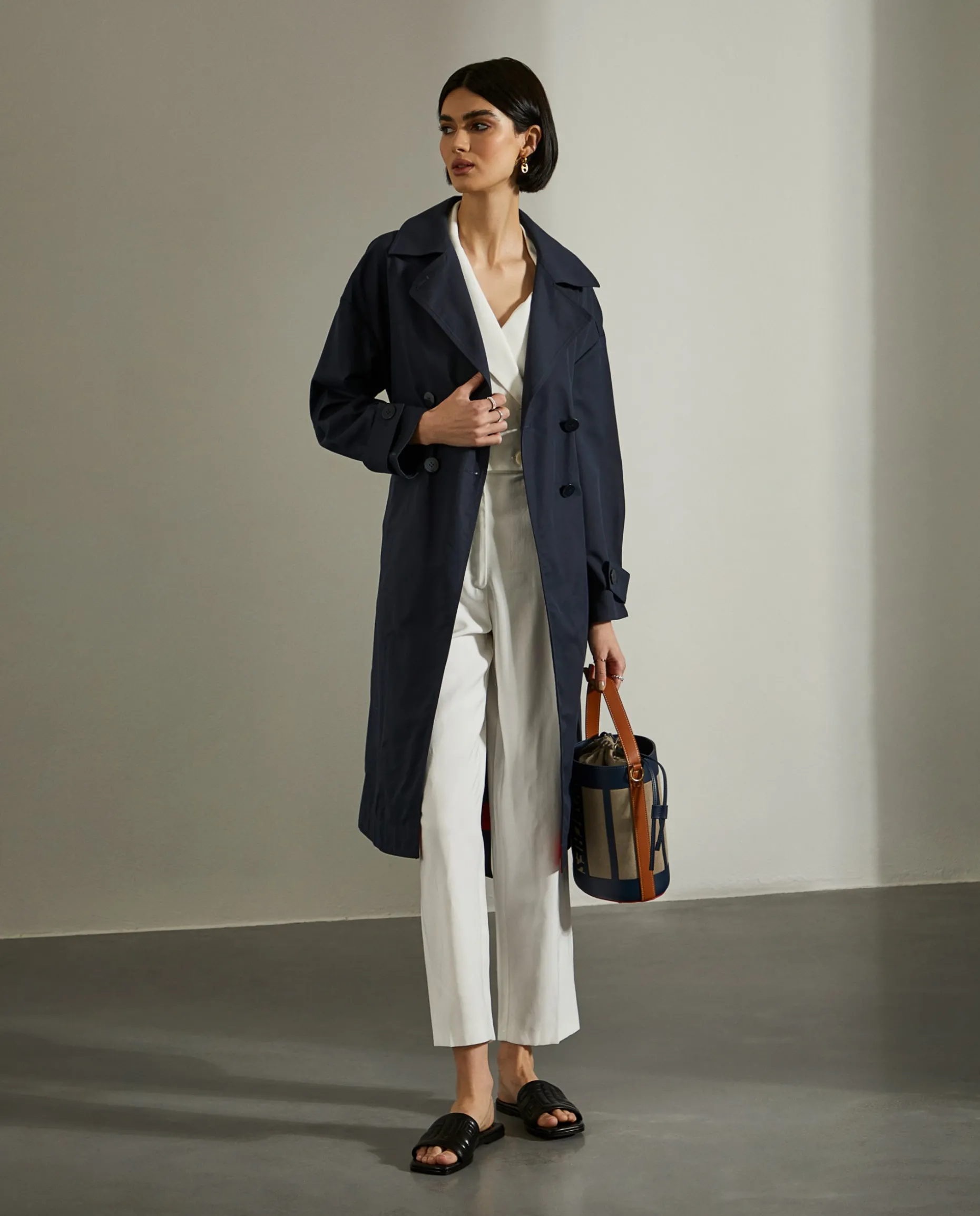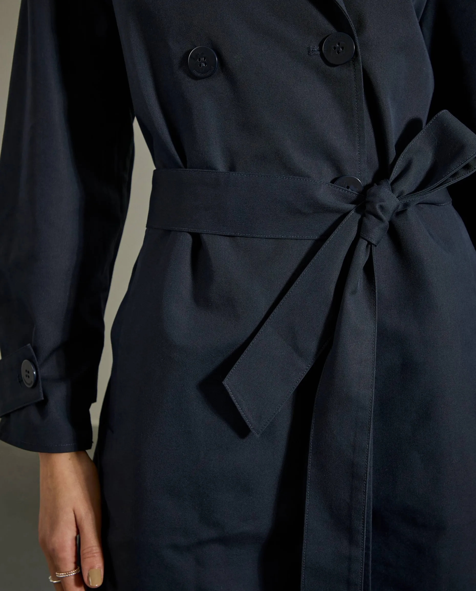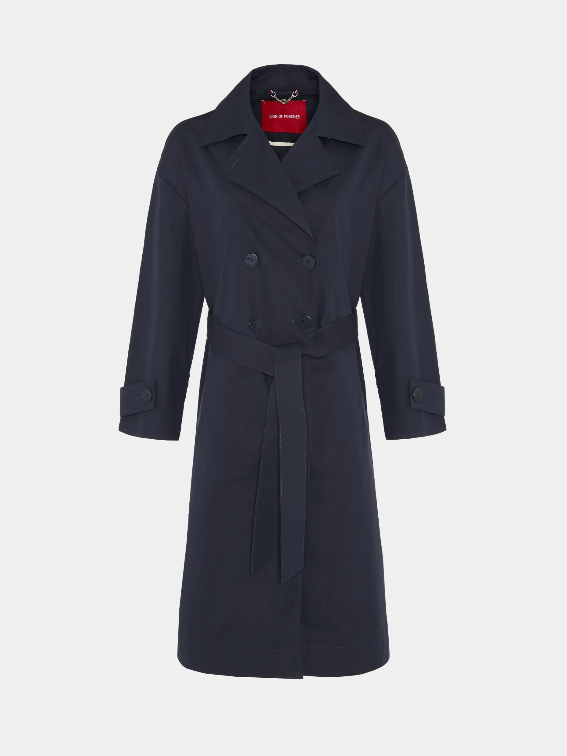 Casaco comprido, estilo gabardine, com trespasse de 4 botões. Bolsos de vivo na frente e cinto a ajustar o casaco nas costas.