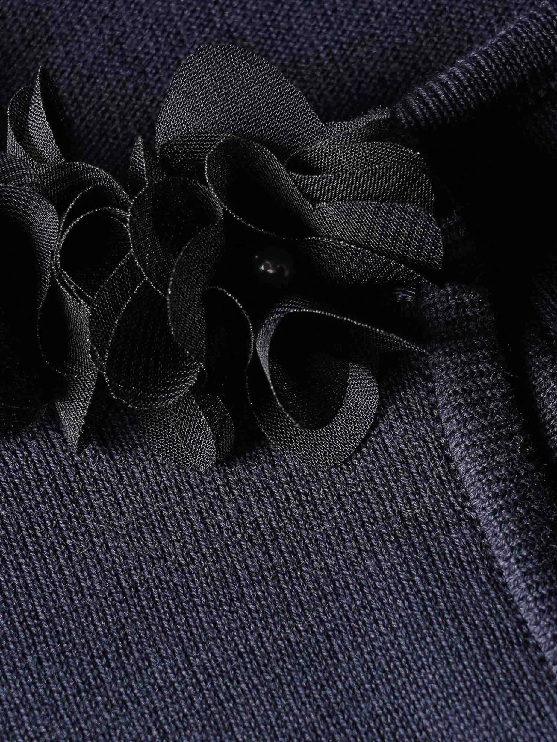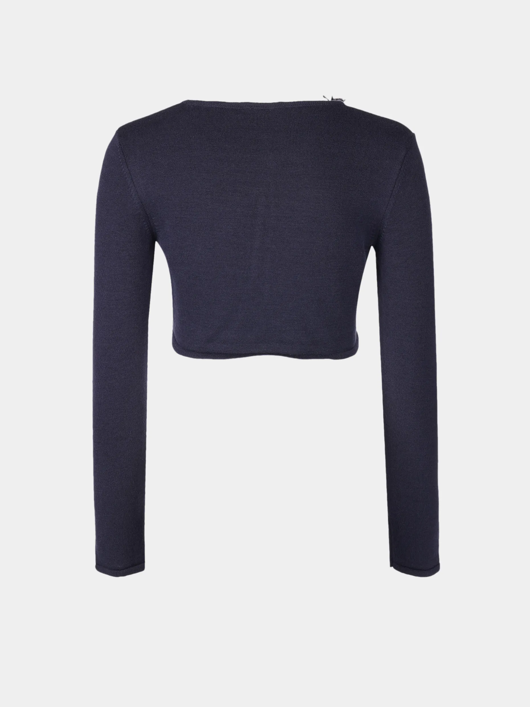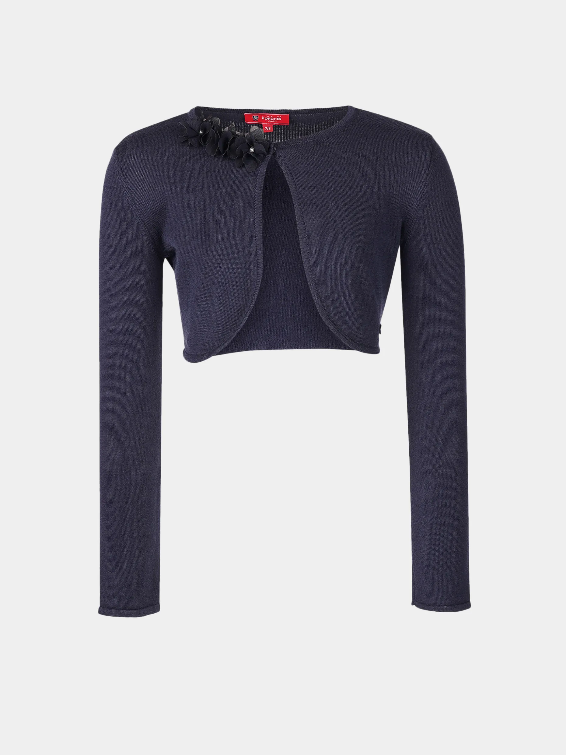 Bolero clássico em algodão macio. Frentes arredondadas e mangas compridas. Aplicação de flores ao tom no decote. Personalização com placa “Lion of Porches” na frente.