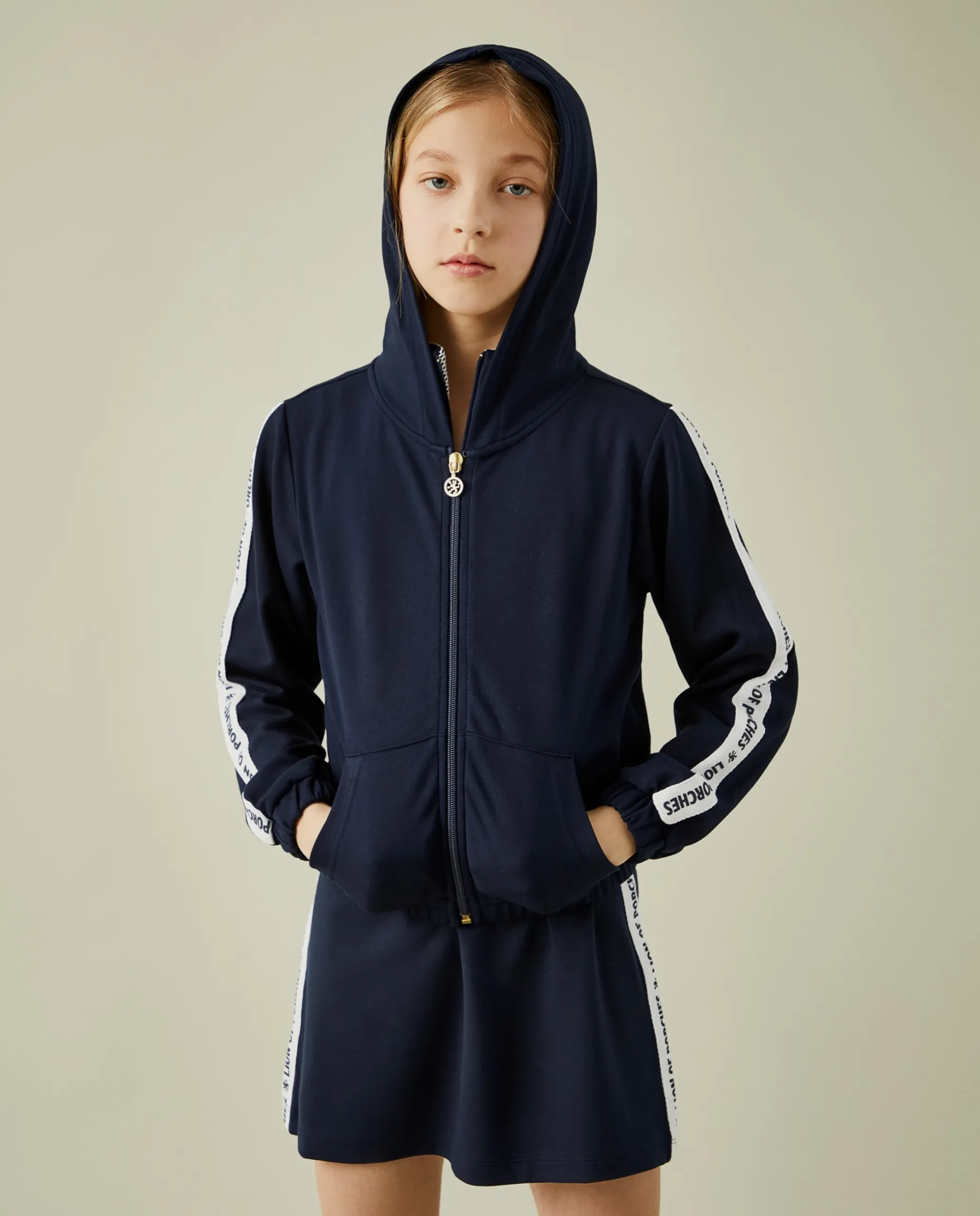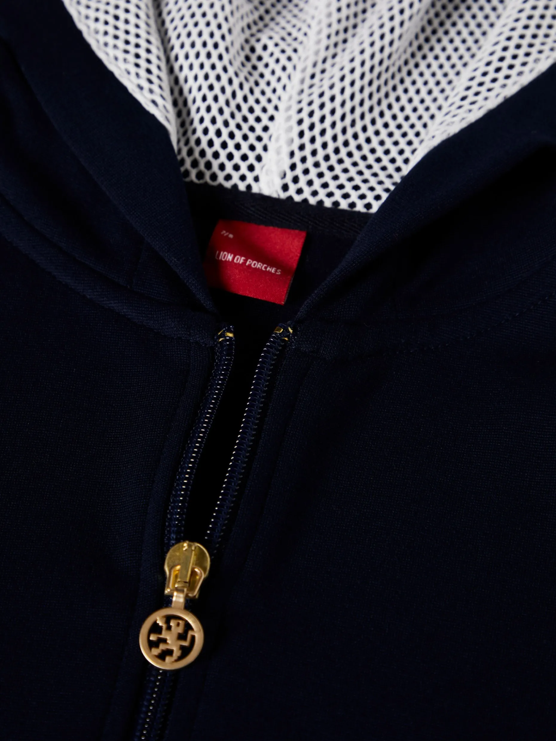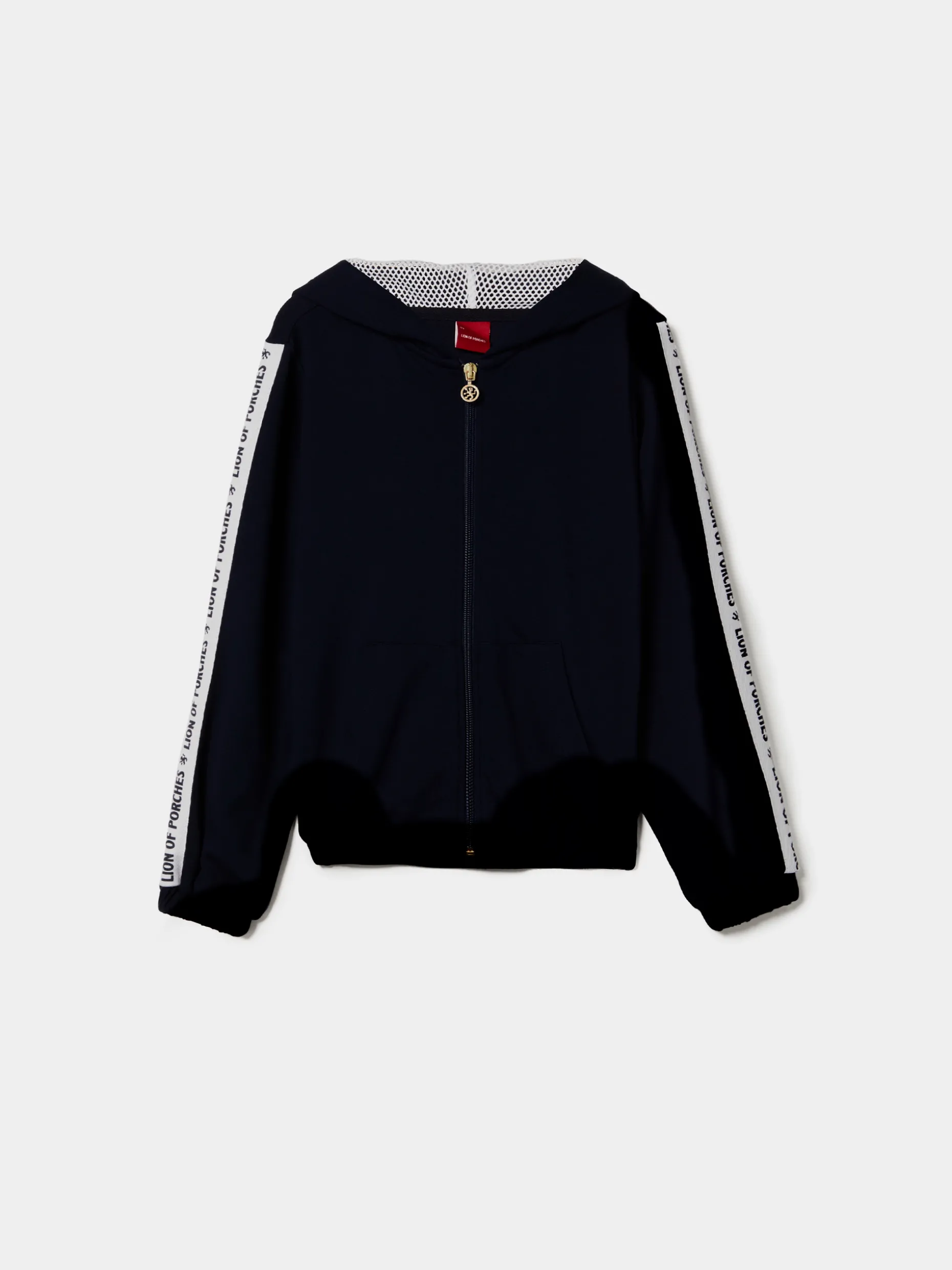 Casaco de malha de cor lisa com capuz. Aperta com fecho e tem dois bolsos fontais. Pormenor diferenciador de fita em contraste nas mangas com branding Lion of Porches. O interior do capuz é em rede noutra cor. Os punhos são elásticos.