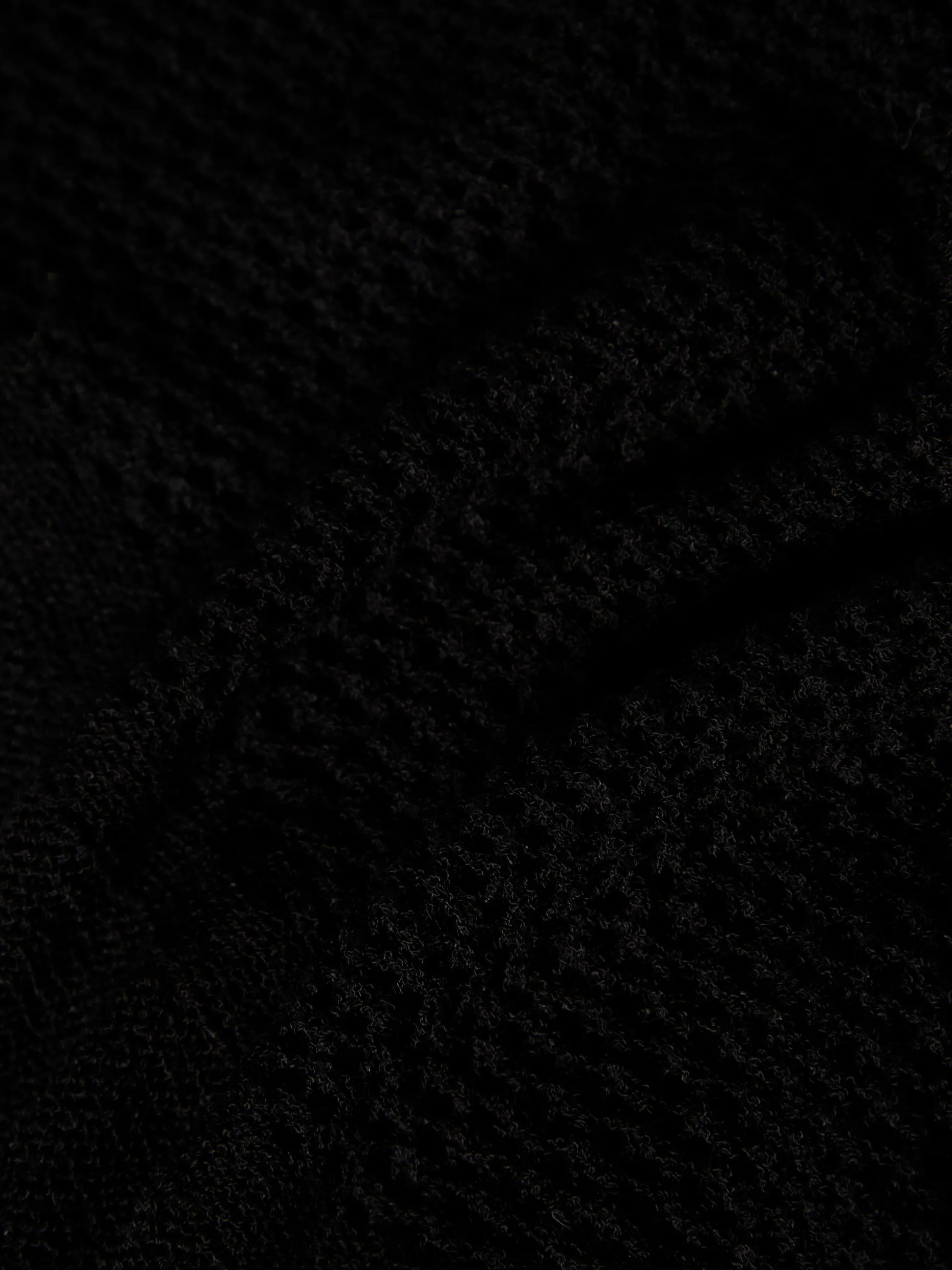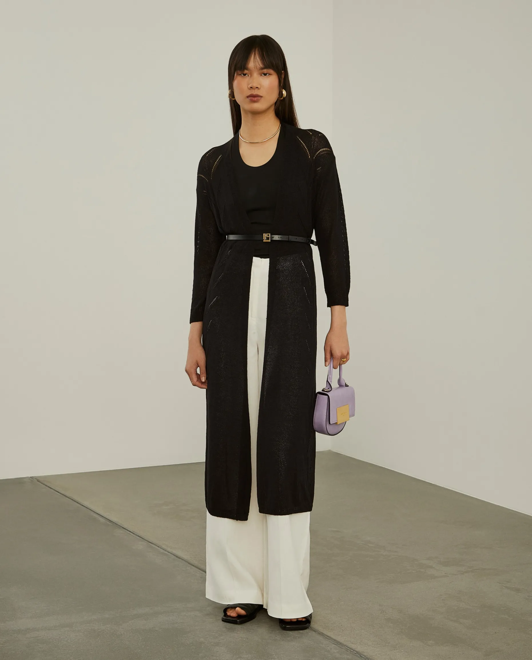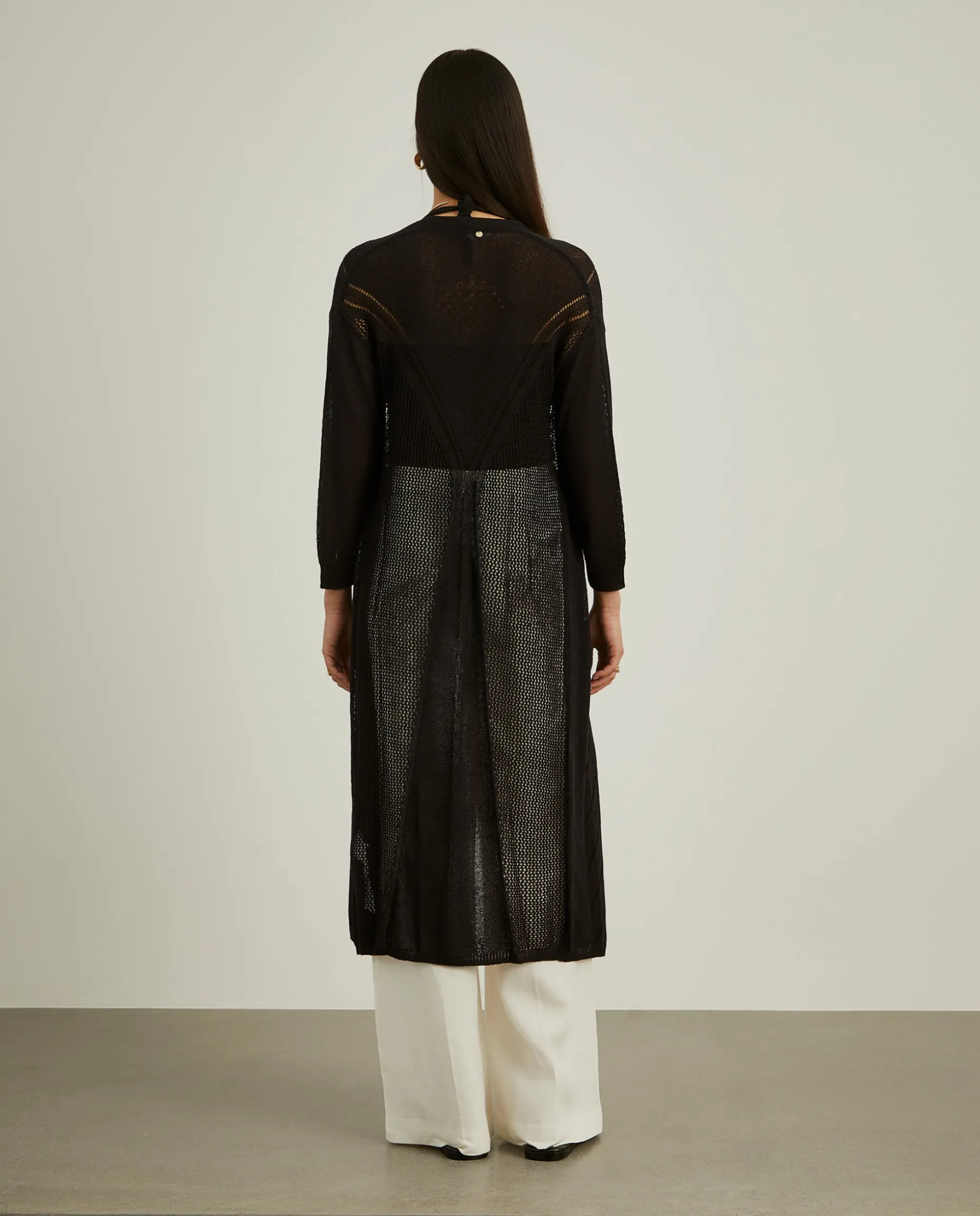 Casaco de malha comprido com estrutura de malha geométrica. De decote em V, a gola, base e punhos são canelados.